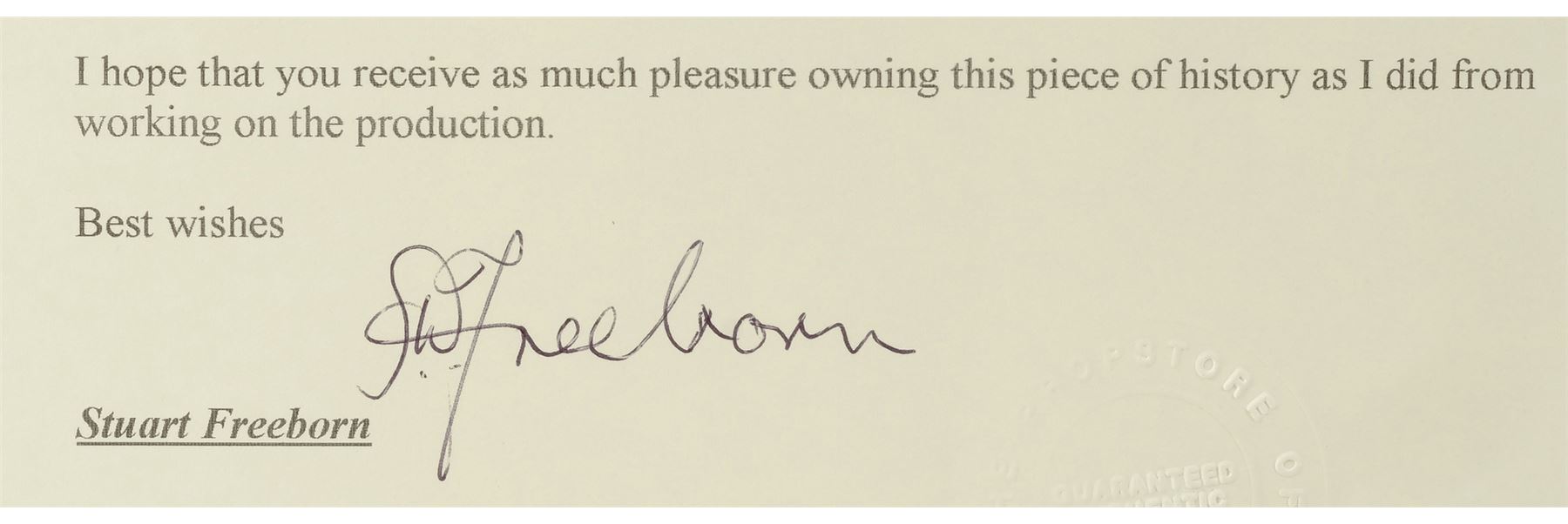 11.2. In the catalogue Entry, Propstore takes steps to identify and provide provenance for Lots offered at Auction. In many cases, the Lots offered were used in or in conjunction with motion pictures or other programmes and information is furnished in order to fully identify and describe the Lot offered at Auction, including photographs and illustrations. Propstore in no way claims any connection to or relationship with the producers of the motion picture or other programme. In all cases, the use of the titles or other elements of a motion picture or other programme is for informational purposes only.