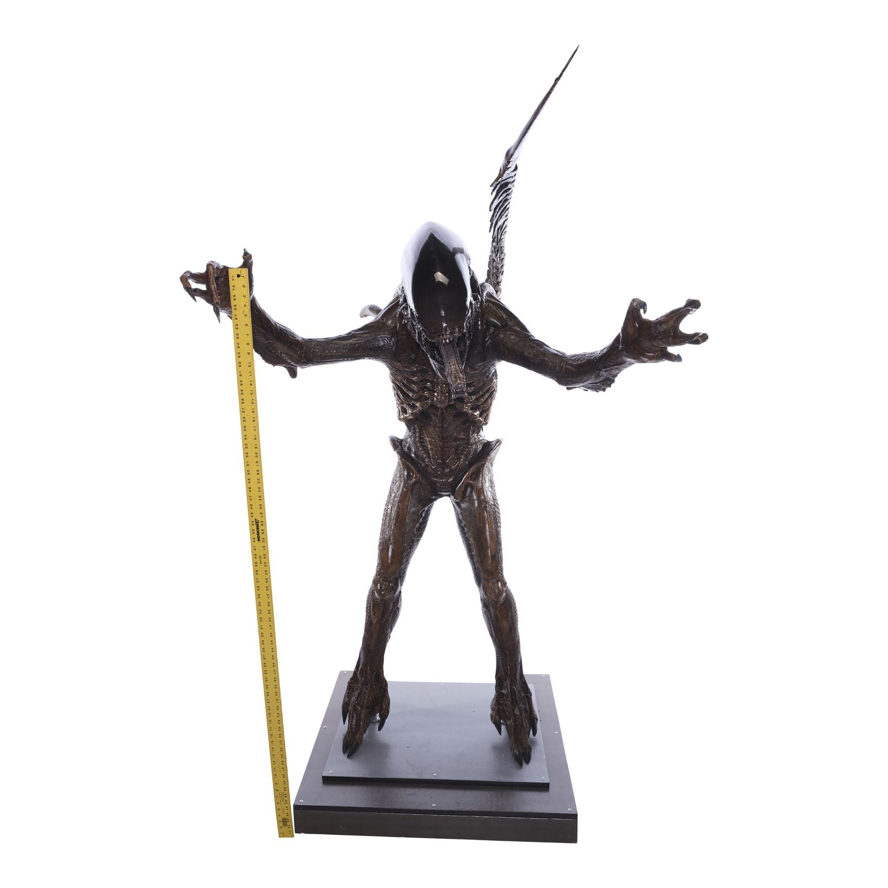 This costume comes from Academy Award& reg;-winning special effects group, Amalgamated Dynamics, Inc. (ADI), where it was displayed as an archive piece. It consists of a gloss brown paint-finished foam alien zipper costume that was mounted onto lead alien Tom Woodruff, Jr.'s bodyform following production. The head features a see-through plexiglass dome with two sets of mounts and cables on either side of the head to control lip snarl and jaw movements. The tail is attached by Allen bolts and can be removed. This display comes mounted in attack position with Allen bolts to a wooden custom-made base on wheels and can be removed. This lot exhibits restoration, completed by restoration artist Joe Petro, and minor cracking material. Dimensions: 50" x 60" x 94" (127 cm x 152.5 cm x 239 cm)
