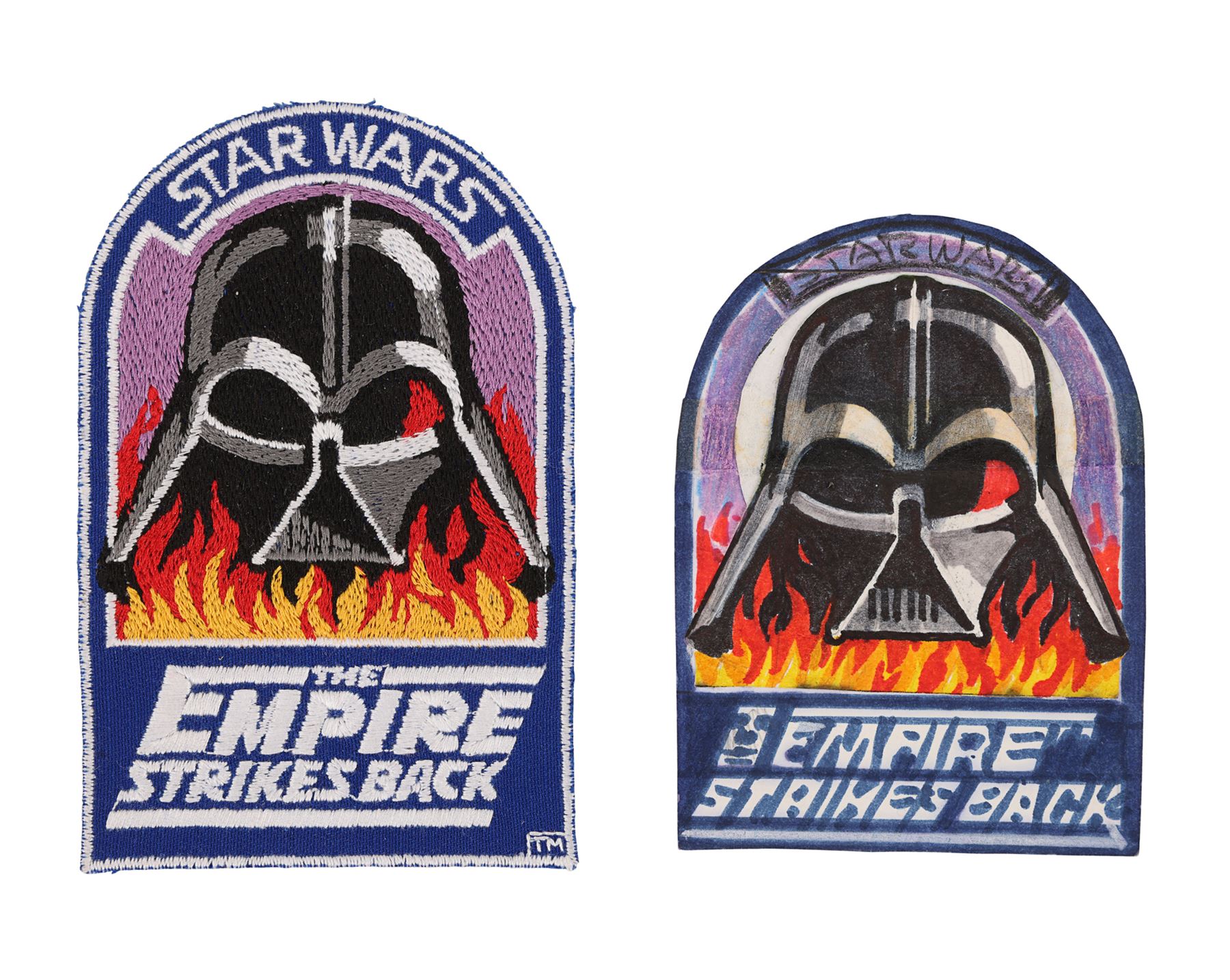This lot includes a "Vader in Flames" crew patch, a black rectangular Empire Strikes Back logo patch and two hand-coloured prototype crew patch designs rendered in a mix of pencils and pens. One hand-coloured artwork has been made from two pieces of card, layered and glued together, whilst the other has been hand-labelled "B" in black pen. Accompanying these are six sheets of printed prototype patch designs and a sheet of card featuring a printed title artwork on one side and a hand-drawn patch layout labelled "A" on the other. Dimensions: (crew patch) 13 cm x 8.5 cm (5" x 3 1/4"); (title artwork) 32 cm x 22 cm (12 1/2" x 8 1/4")