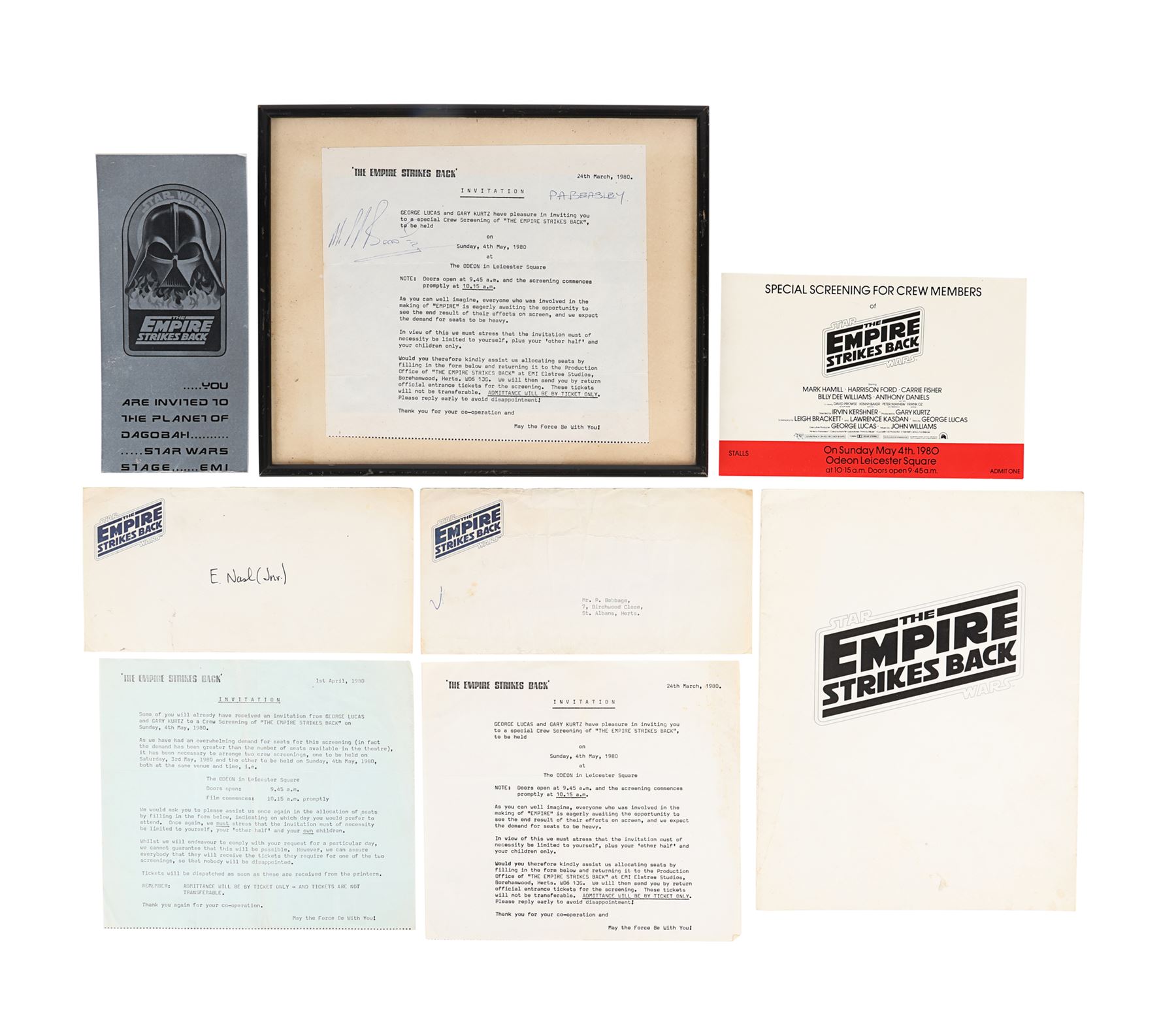 A set of crew invites and promotional materials from the production of George Lucas' Star Wars: The Empire Strikes Back. The set includes three written invitations (one framed) to a crew screening of the film. The screenings took place on 03.05.80 and 04.05.80 at the Odeon, Leicester Square. It also features a pass for the same screening, a foldout pamphlet listing cast and crew, and an invitation to the crew wrap party. The set exhibits signs of wear but it remains in good condition. Dimensions: 30 cm x 24 cm x 2.5 cm (12" x 9 1/2" x 1")