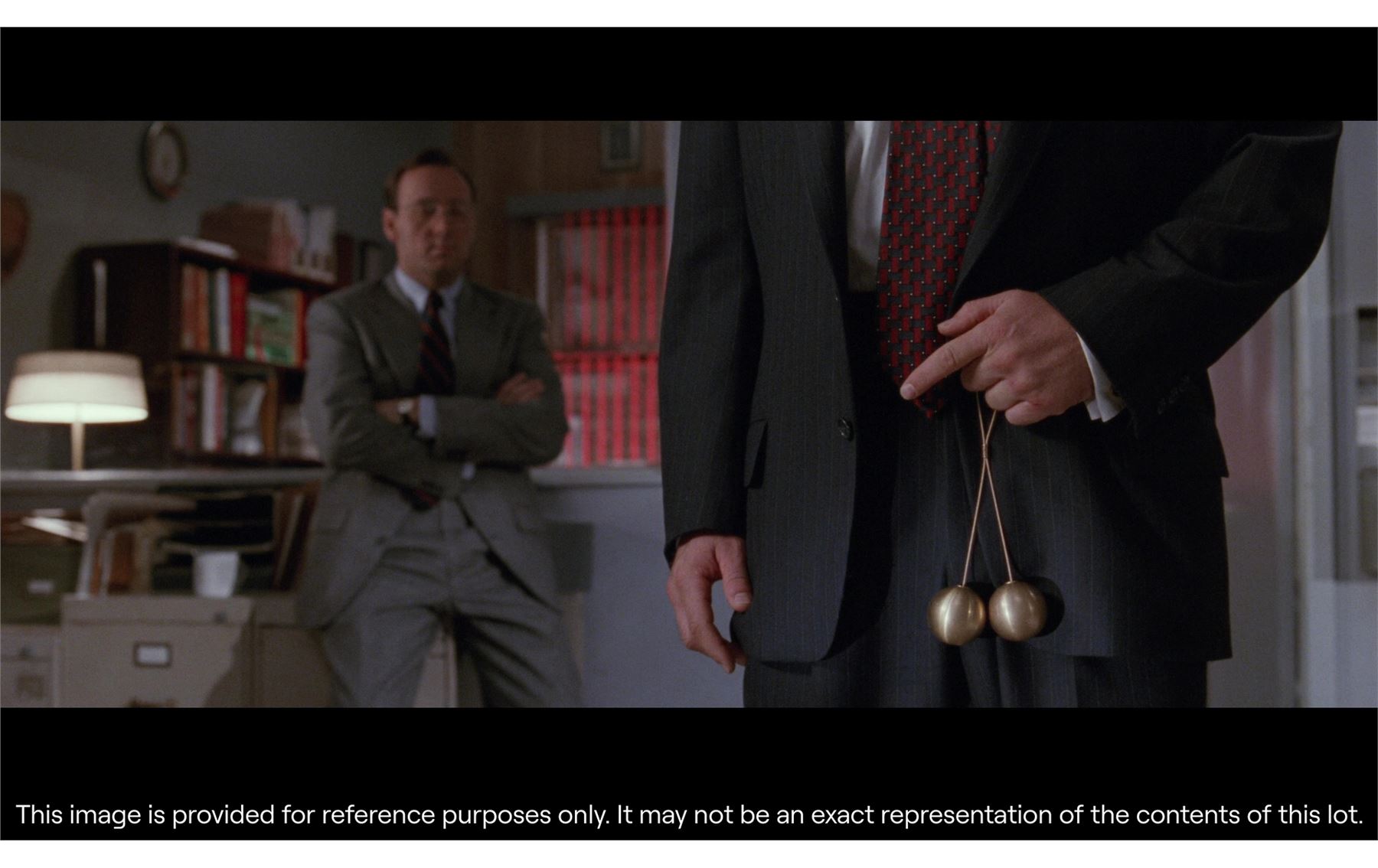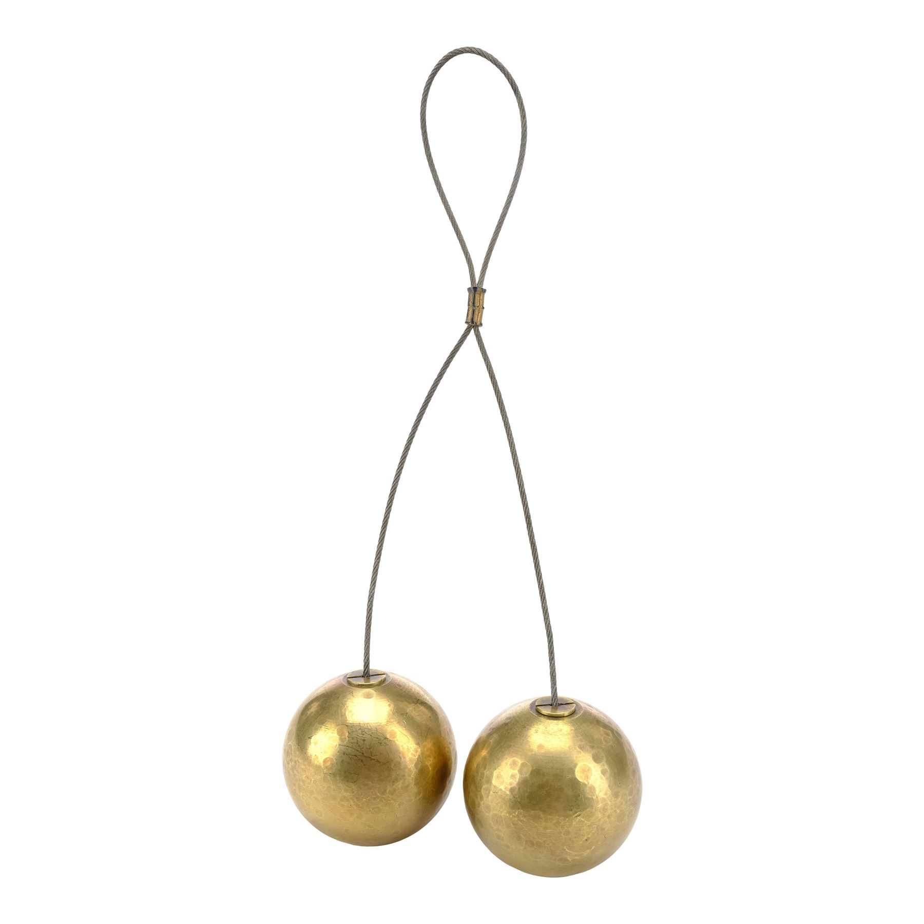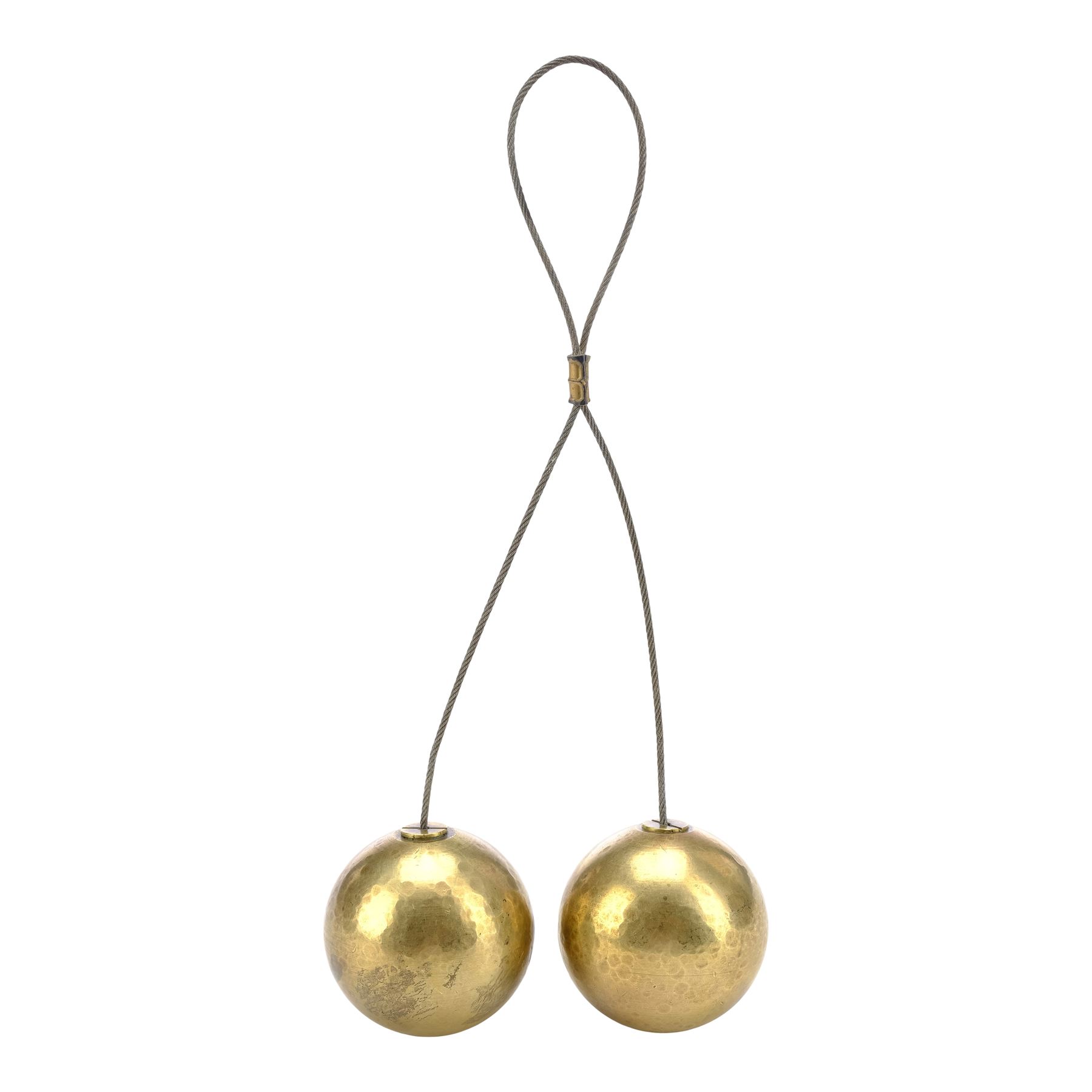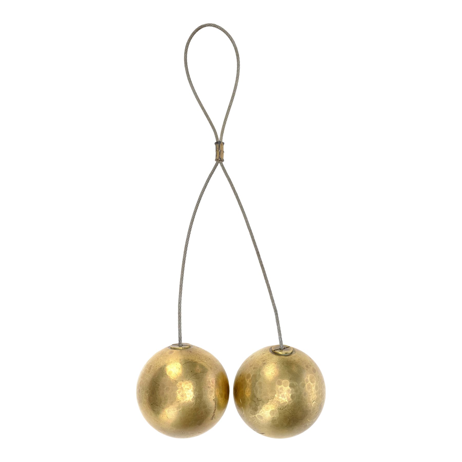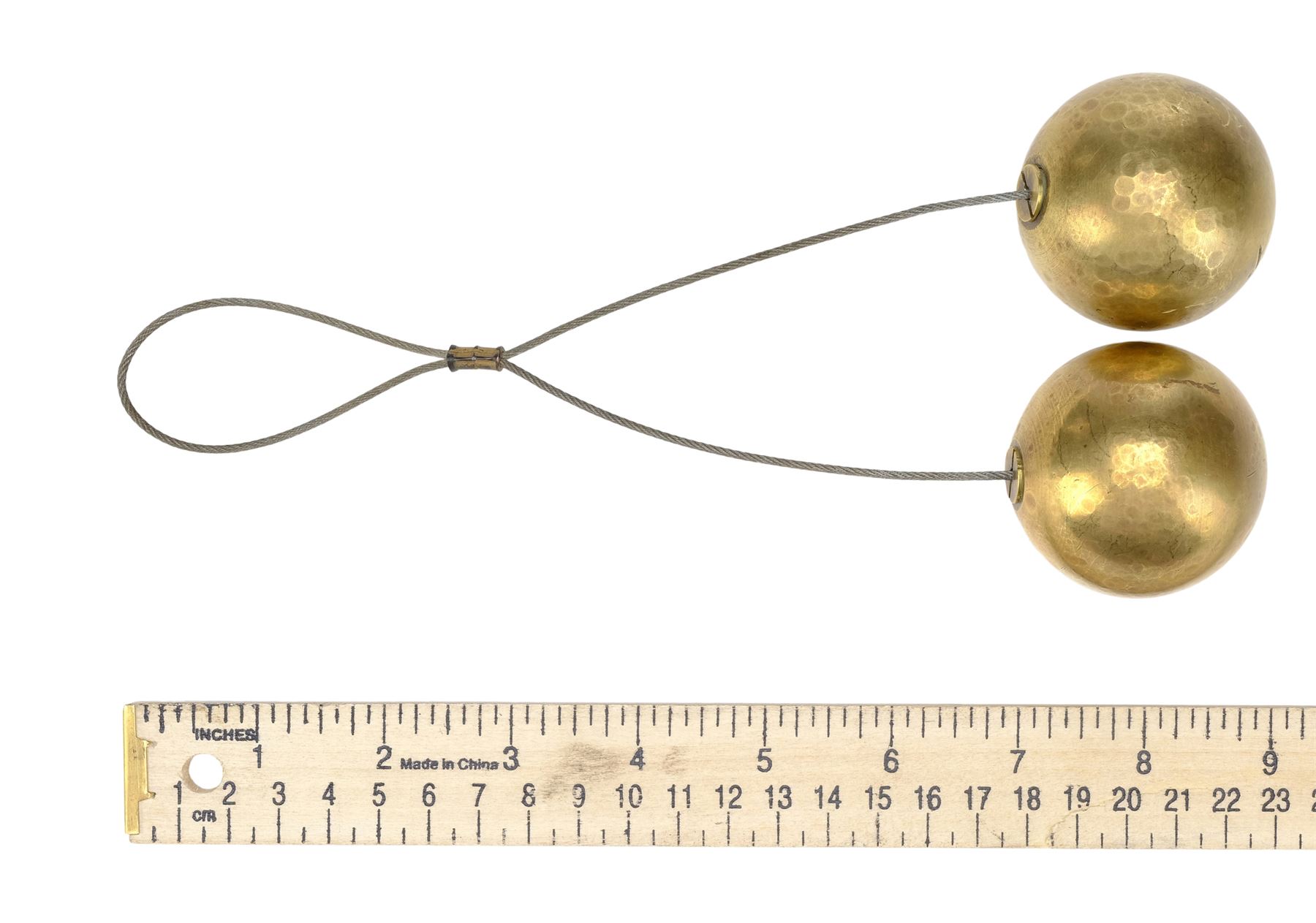 These solid, hand-forged brass balls dangle from a metal snake chain with a cinching clasp at the centre. Also included is a Letter of Authenticity from prop master Robert Griffon. The balls exhibit discolouration and tarnishing from age, as well as minor scuffs. Dimensions: 10.25 cm x 20.5 cm x 5 cm (4" x 9" x 2")