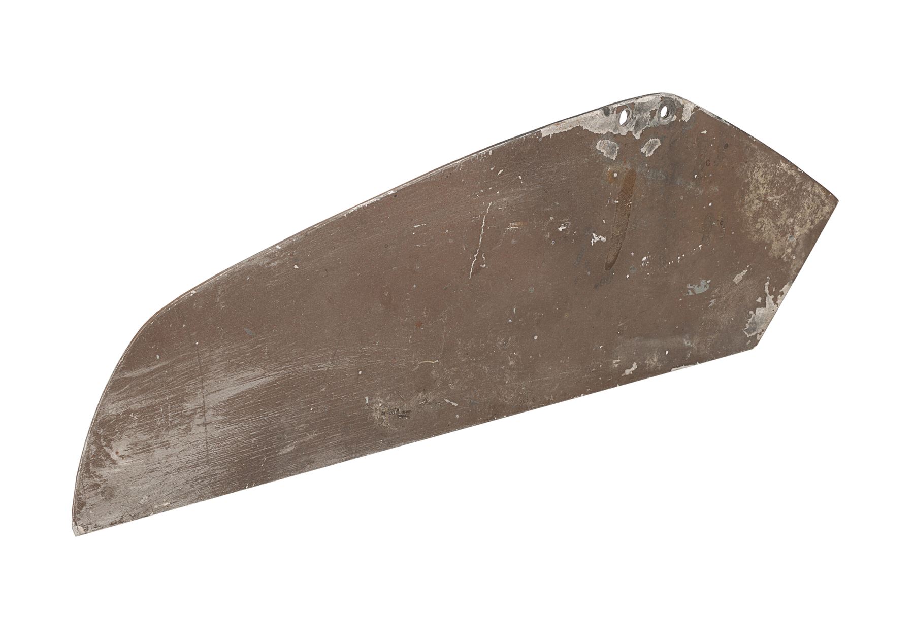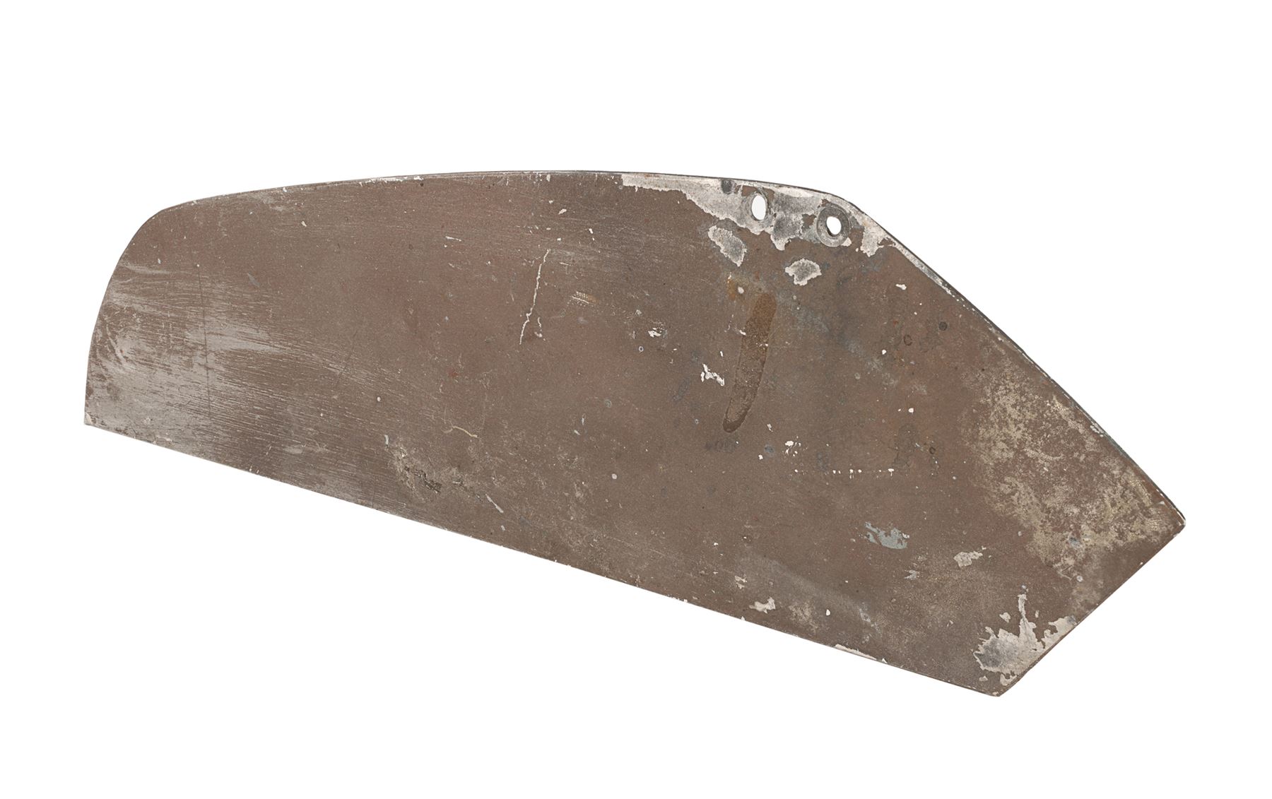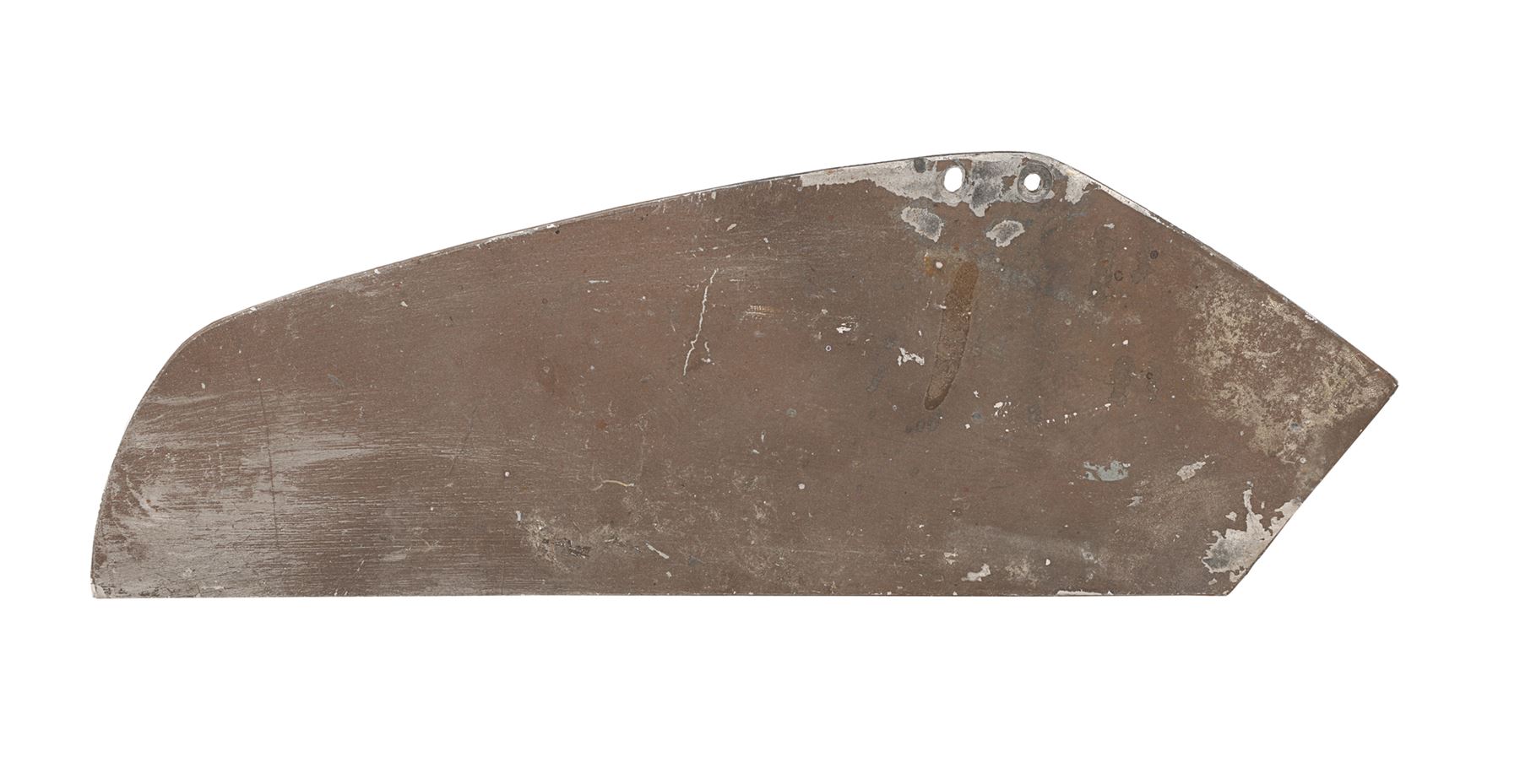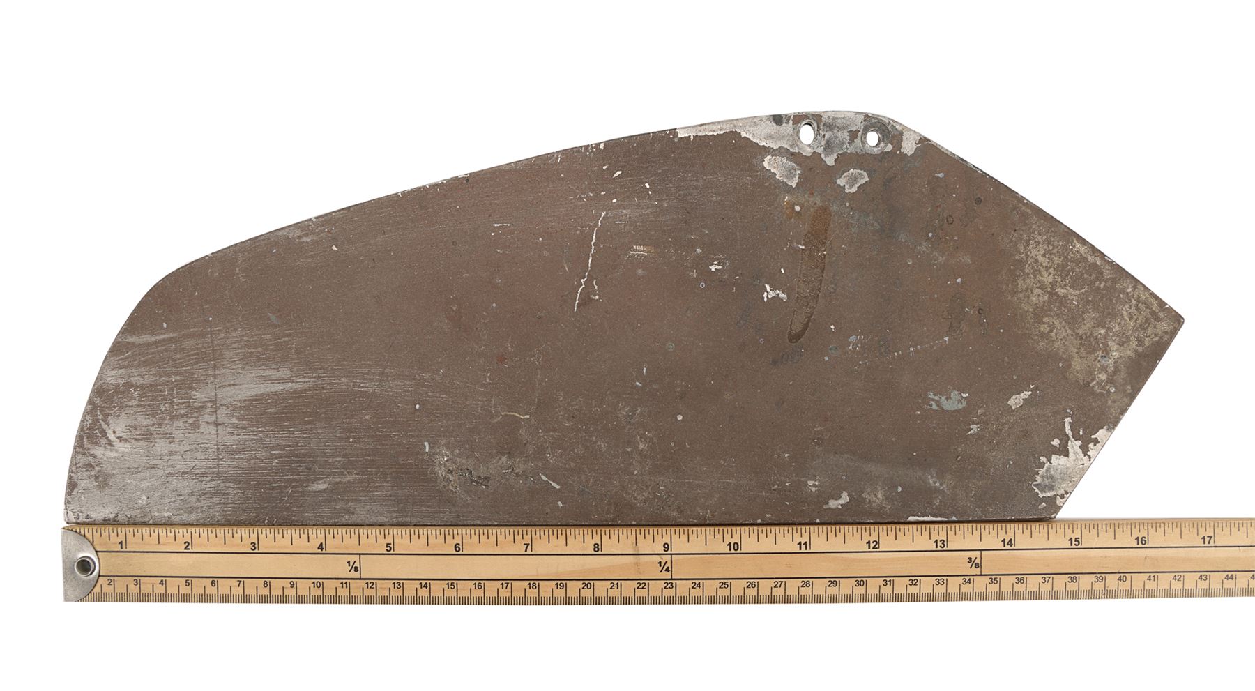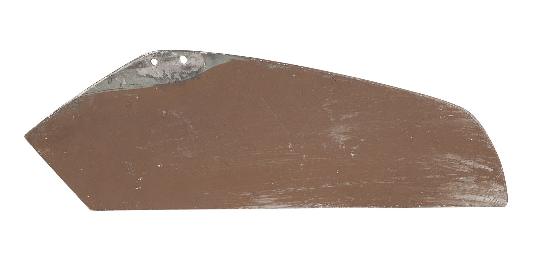 This metal steering vane has been painted brown and features two holes on its curved edge, where it would have been secured to the rear of the bike. Accompanying it is a gold-coloured metal display plaque with the engraving "Return of the Jedi Speederbike lower front steering vane". The vane exhibits scuffs and scratches to the paint from production use and age. Dimensions (vane): 43 cm x 15.5 cm (17" x 6 1/4")