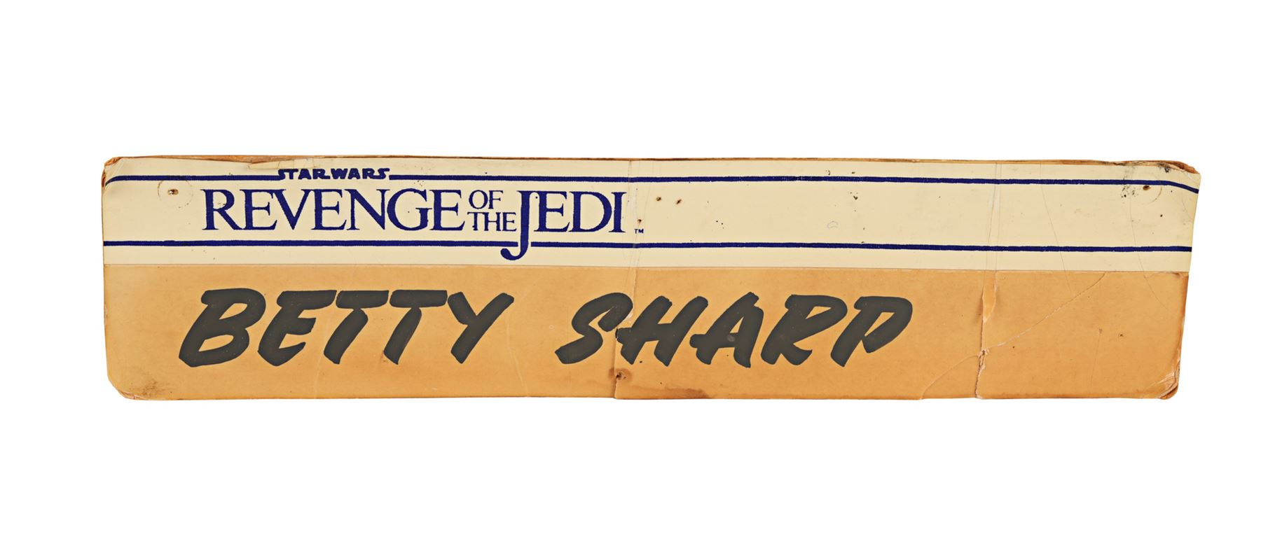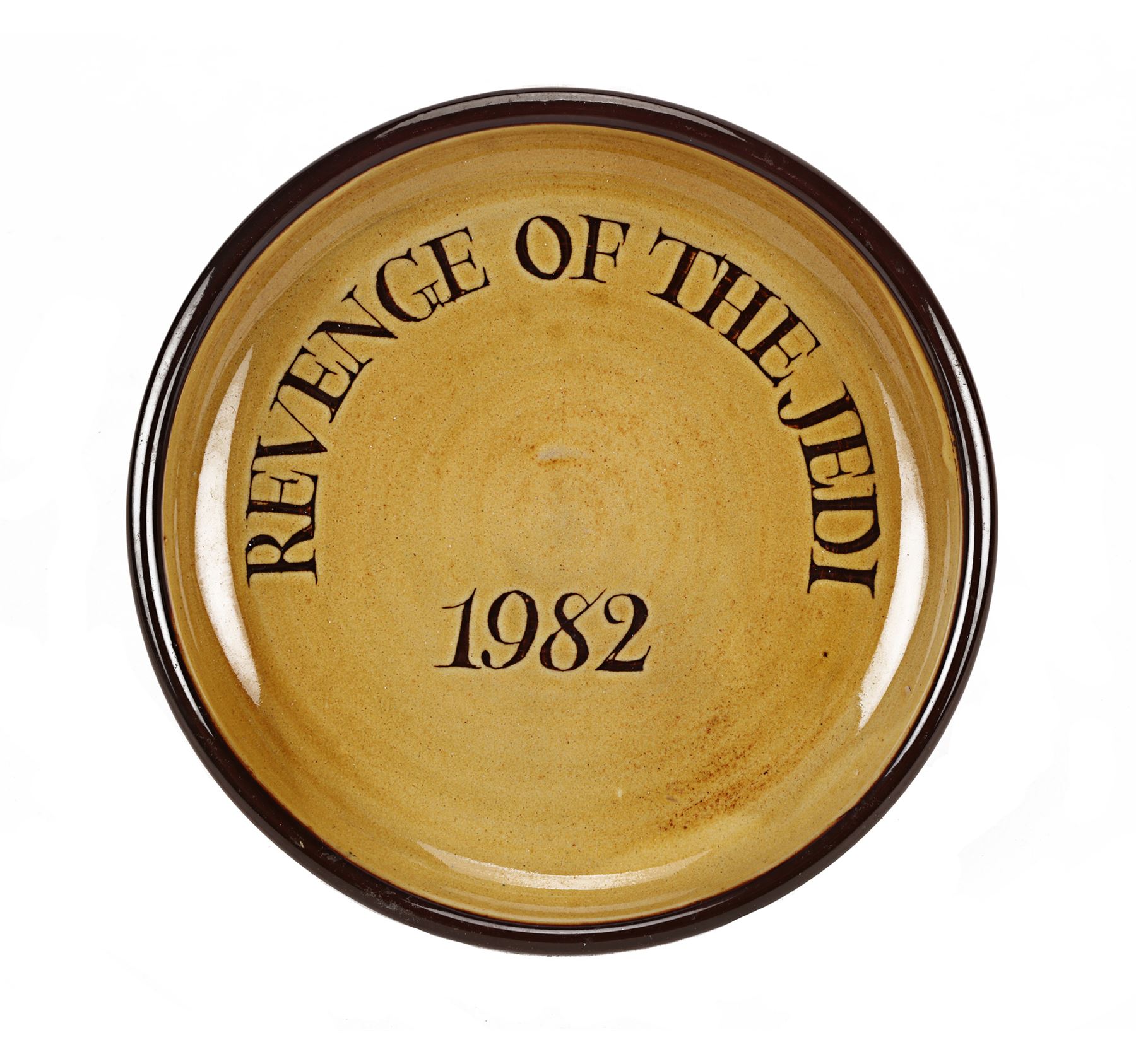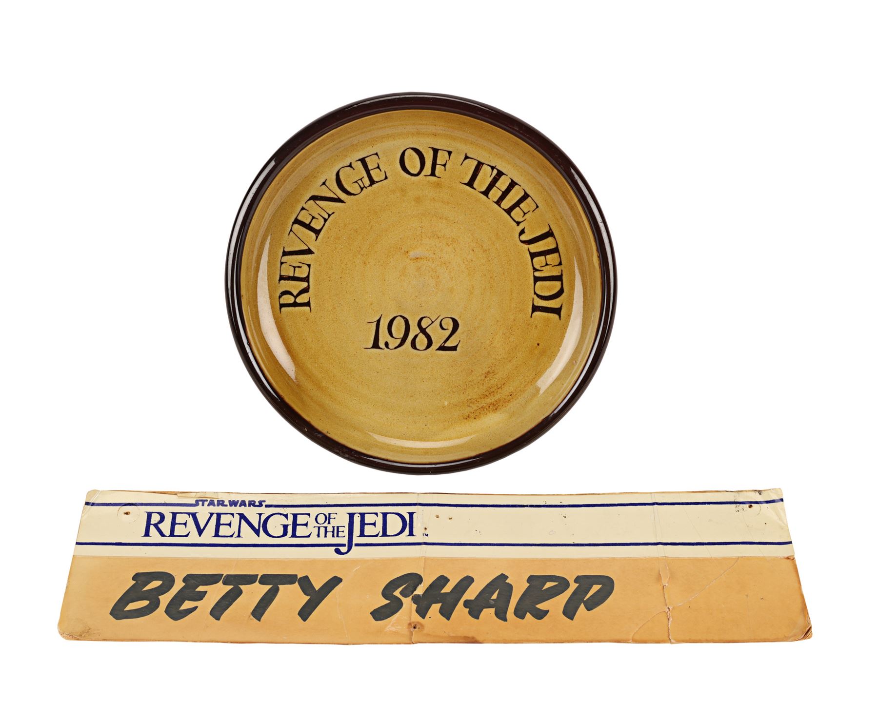 The Chelsea Pottery brown glazed plate is one of only 125 created, and bears the film's original title "Revenge of the Jedi", with the year of filming. A pink ribbon is threaded through two holes at the rear, allowing it to be displayed. The white card sign features a blue "Revenge of the Jedi" logo and is marked "Betty Sharp". Completing the lot is a Polaroid showing this sign adhered alongside others to a door at Elstree Studios. The sign exhibits creasing, notable discolouration and tape remnants on the back. Dimensions (plate): 18.5 cm x 18.5 cm x 3 cm (7 1/4" x 7 1/4" x 1 1/4")