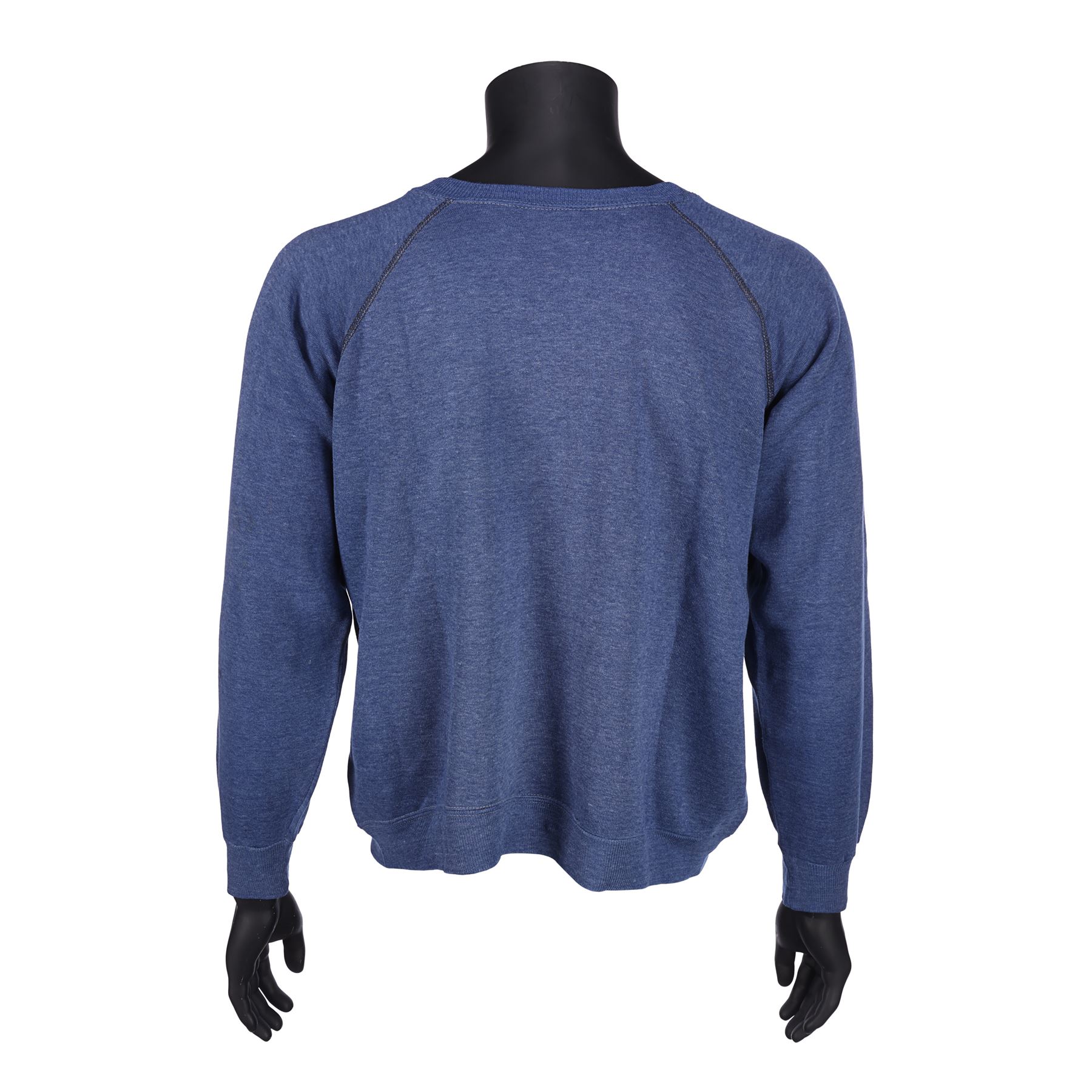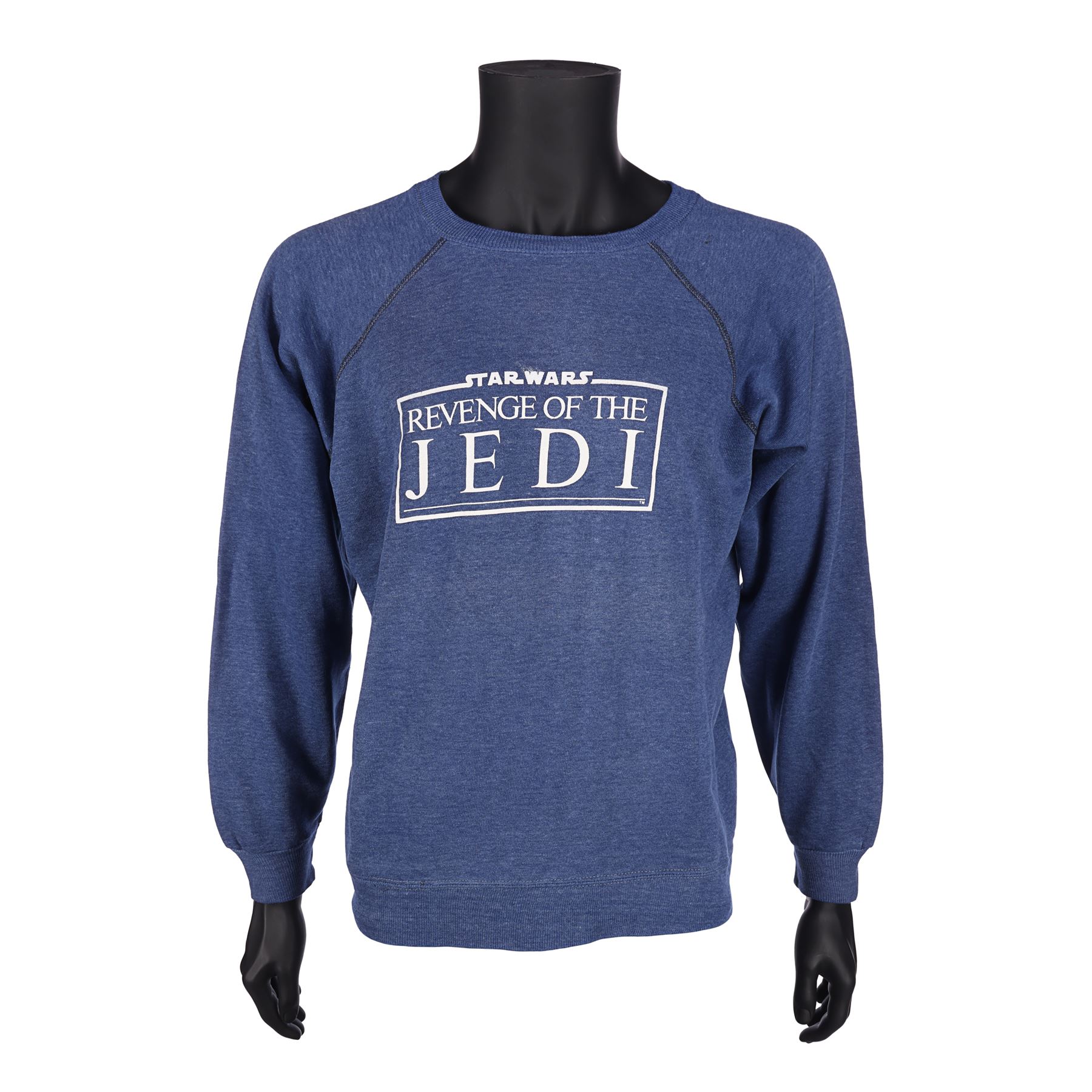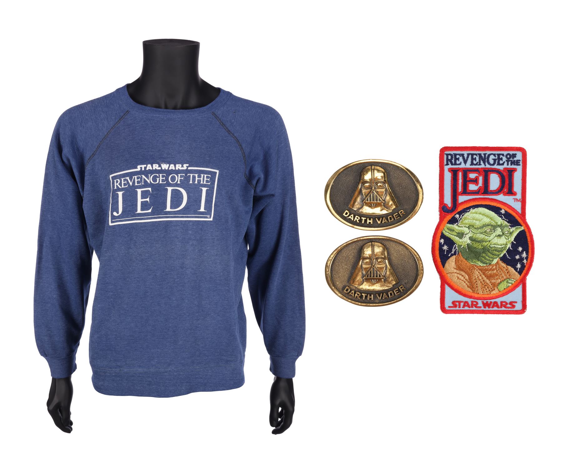 A crew sweatshirt, patch and belt buckles from the production of the Star Wars original trilogy. The long-sleeve sweatshirt is made of blue cotton and acrylic. Printed in white on the front of the sweatshirt is "Revenge of the Jedi".