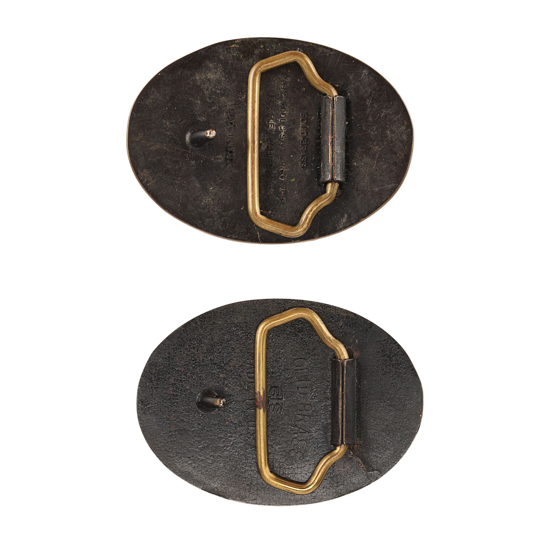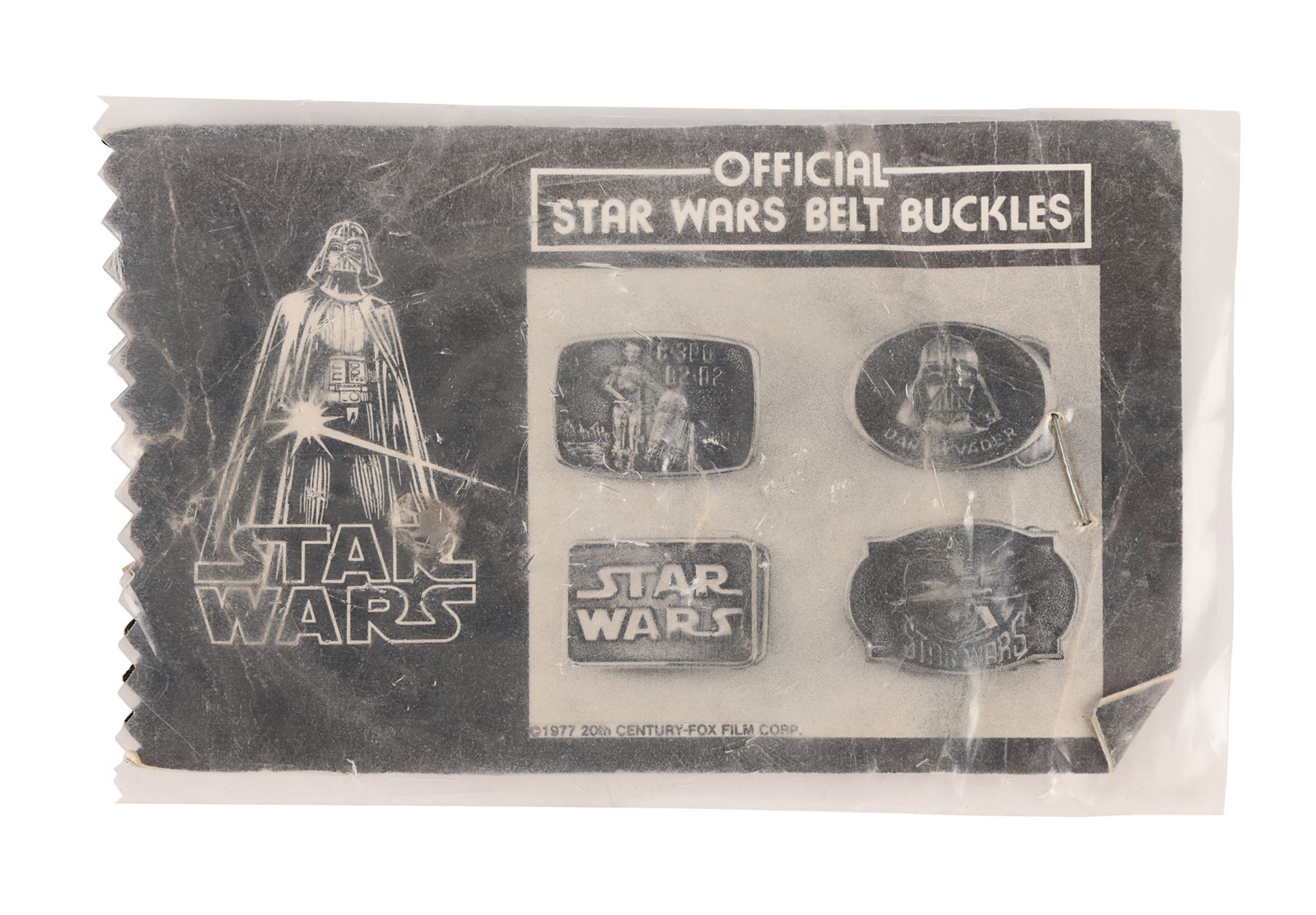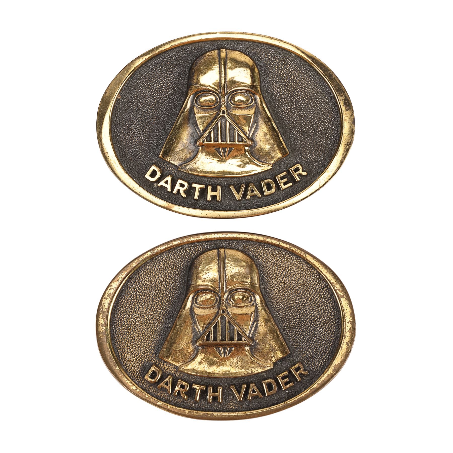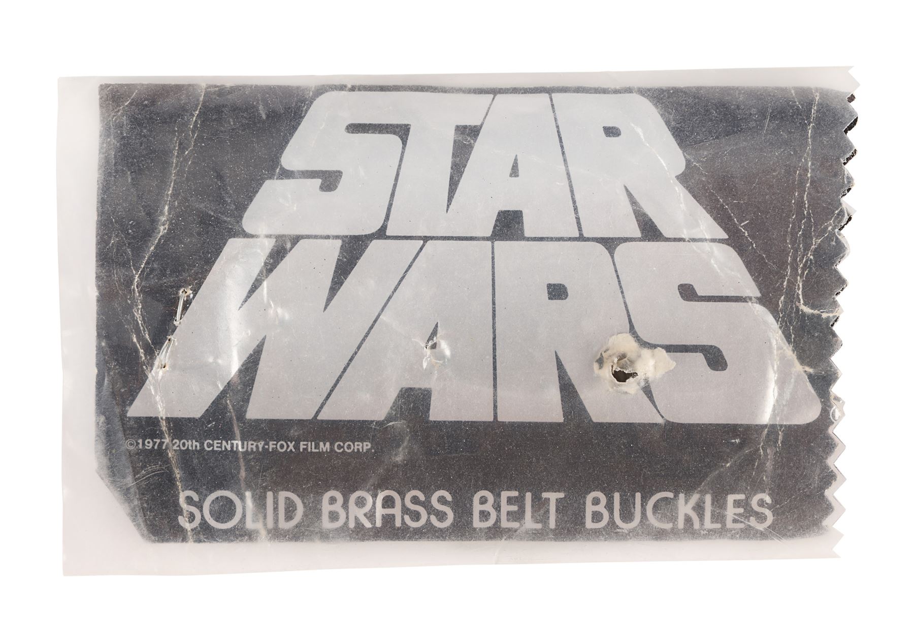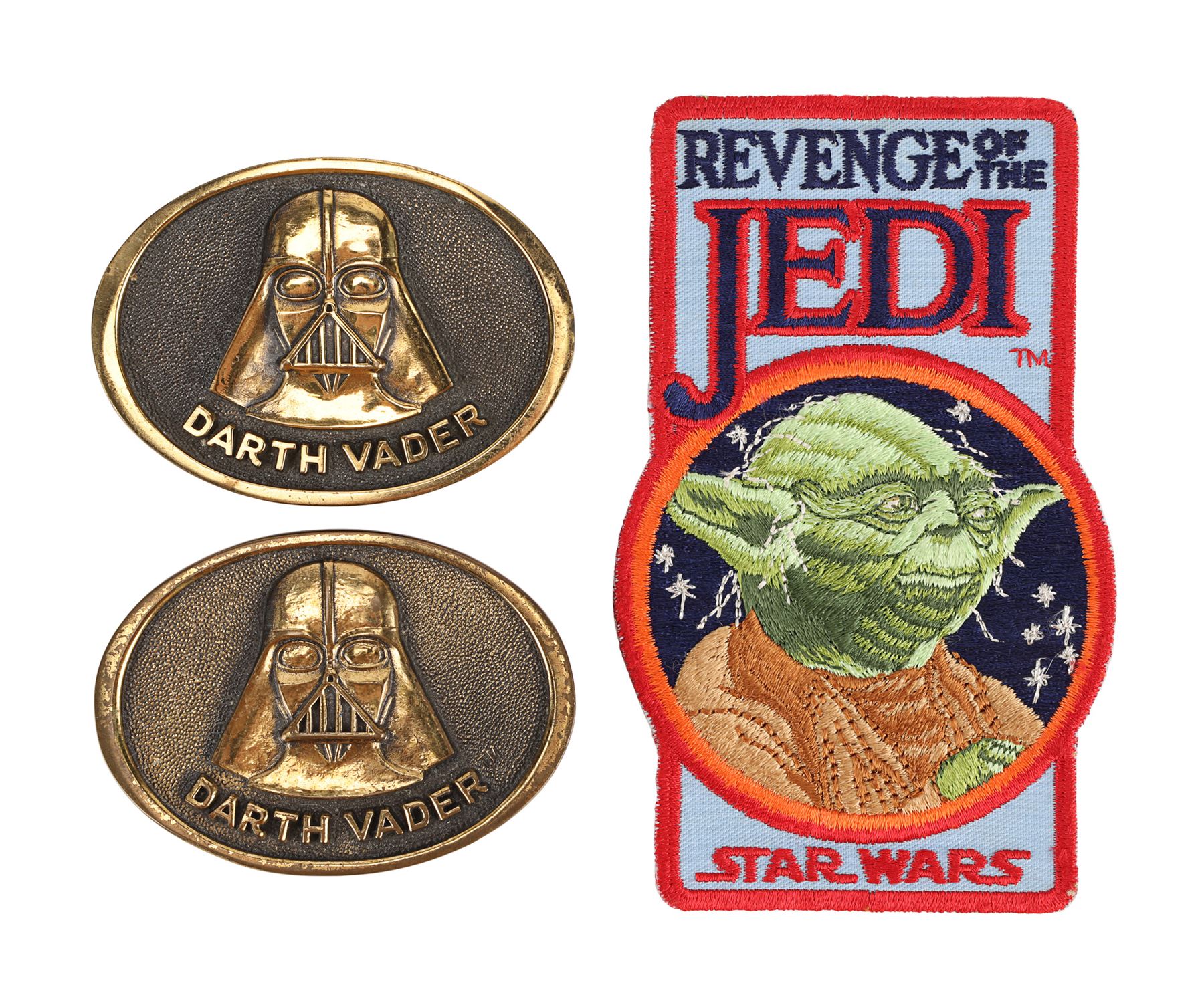 The fabric crew patch has an image of Yoda and "Revenge of the Jedi - Star Wars". The two brass belt buckles feature "Darth Vader" beneath an embossed image of Vader's head. Also included is a plastic pouch, stapled inside which is a card denoting the items as "Official Star Wars Belt Buckles". The plastic pouch and card exhibit signs of wear. Dimensions (patch): 13.5 cm x 8.5 cm (5 1/2" x 3 1/4"); (buckle) 12 cm x 7.5 cm (5" x 3")