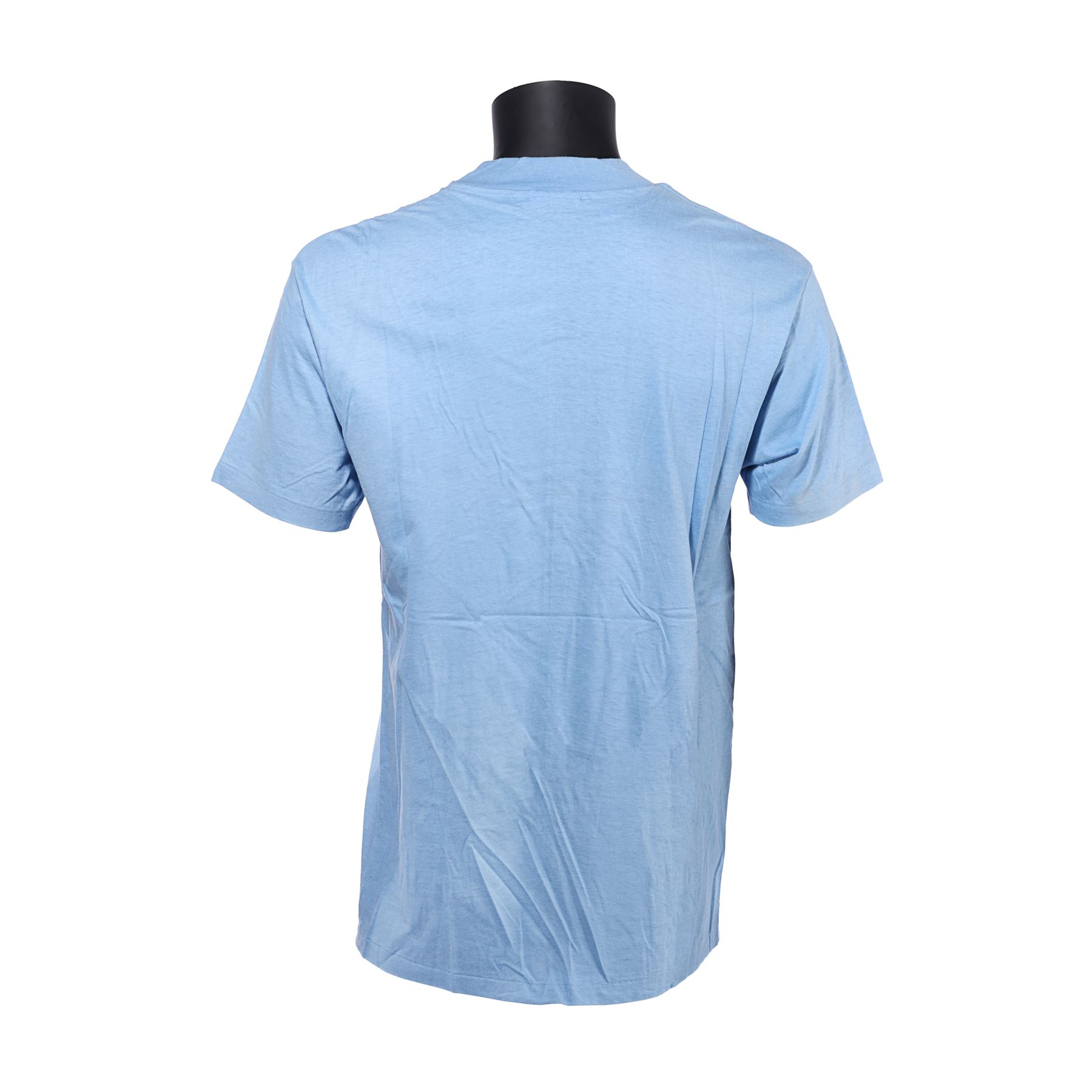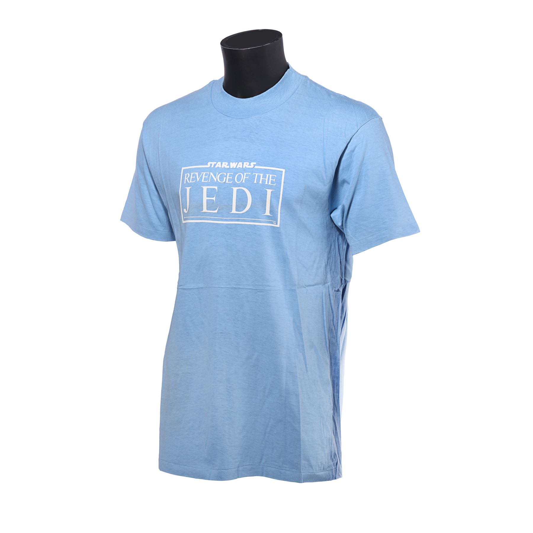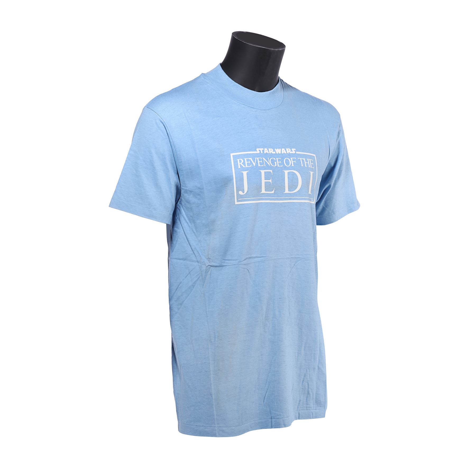 These crew items each display the film's original title Revenge of the Jedi, which was abandoned in favour of Return of the Jedi a few weeks prior to the film's release. The shirt is light blue in colour with white lettering, and includes a manufacturer label from Hanes that lists the shirt as size large, 42-44 and made from 100% cotton.