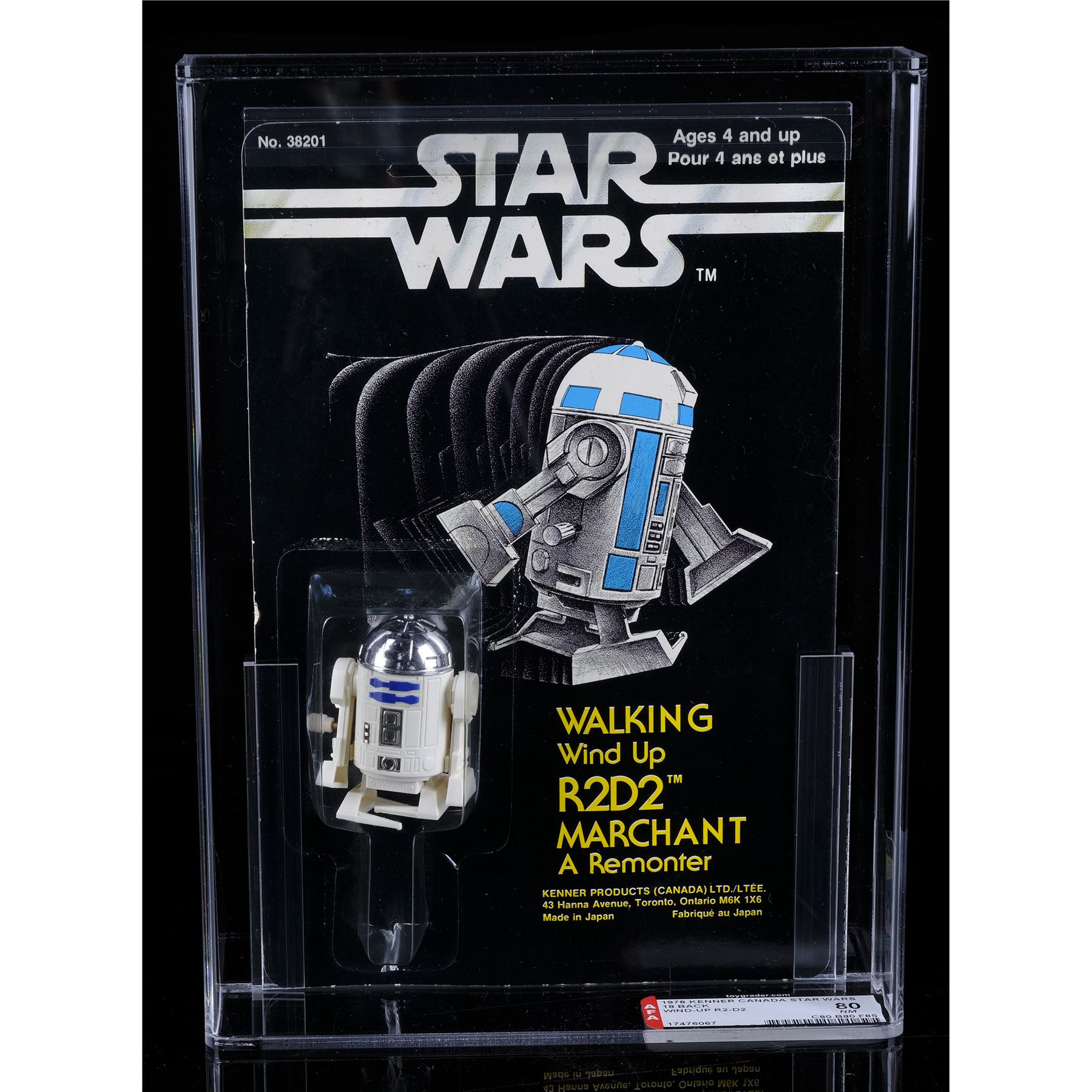 A Canadian unpunched 18 back walking wind-up R2-D2 from Kenner's Star Wars toy line. Made in Japan and released in Canada in 1978 in conjunction with George Lucas' Star Wars: A New Hope, this AFA 80 NM-graded, acrylic-encased figure remains in its original bubble with an unpunched 18 back Canadian cardback with French text and C80, B80, and F85 subgrades. The outside of the acrylic case exhibits minimal scratching. Dimensions: 25.5 cm x 18 cm x 5.25 cm (10" x 7" x 2")
