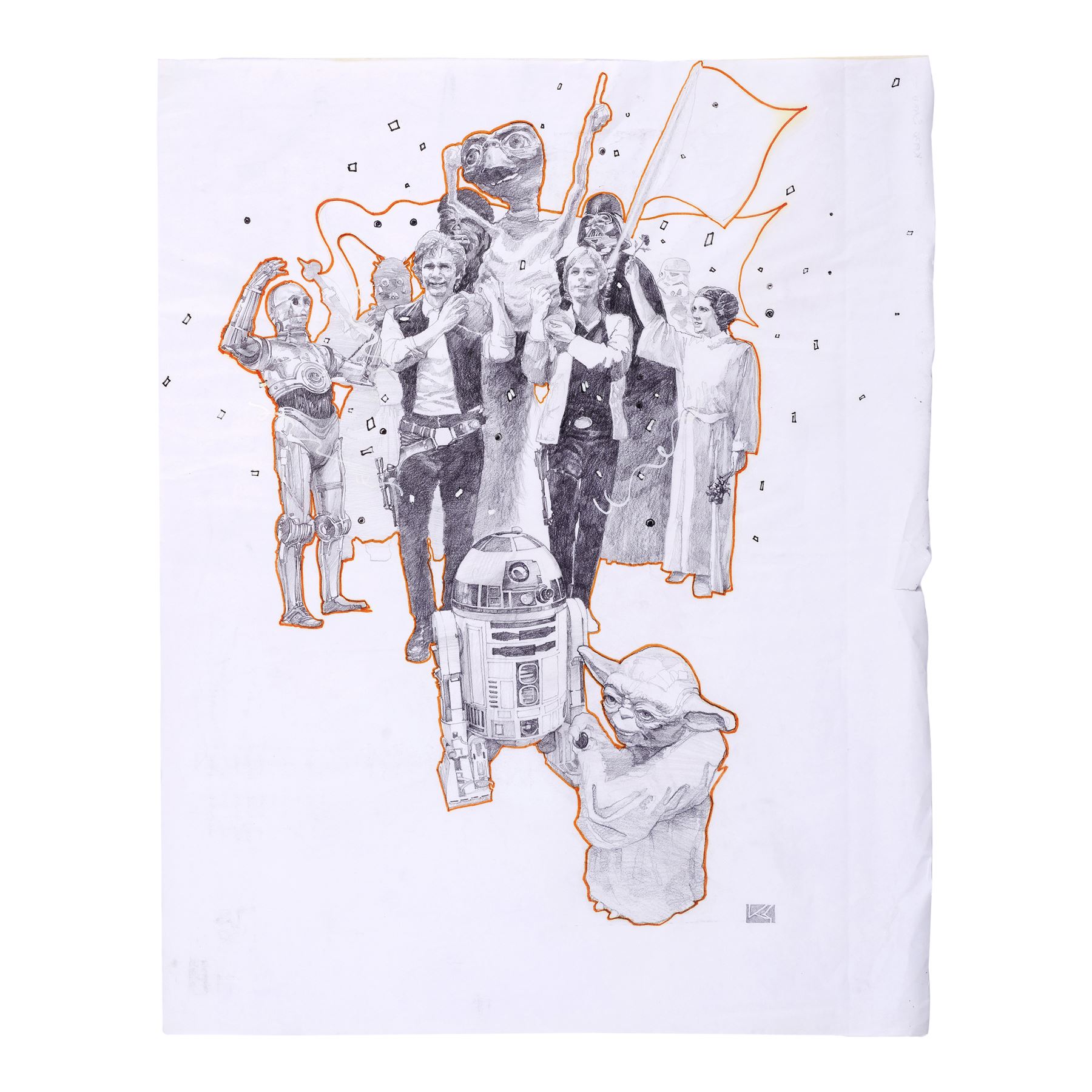 This prelim depicting the cast of Star Wars lifting E.T. up comes from the personal collection of William Plumb. It is rendered in graphite and orange pencil on tissue paper and signed by Sano on front and back. The tissue exhibits warping, crinkling, and uneven edges. Dimensions: 61 cm x 48.25 cm (24" x 19")