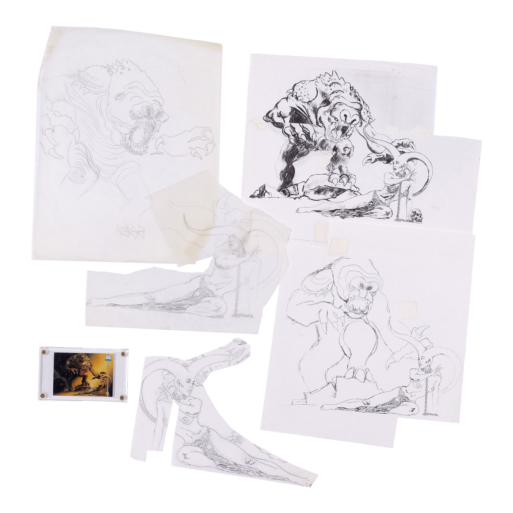 This framed painting comes from the personal collection of William Plumb. Hand-painted, this illustration features Thole's initial signature with the "94" date. Included is the #344 trading card in an acrylic case; five cut-out sketches on vellum and paper; one copy of the illustration; a hand-marked "Thole Sketches Prelims" envelope with 48 pages of concept designs and copies; and a letter of authenticity from Thole dated for "2/7/94." This lot exhibits some scratching on the finish, adhesive residue, minor tears, and vellum fragility. Dimensions: (largest) 66 cm x 81.25 cm (26" x 32")