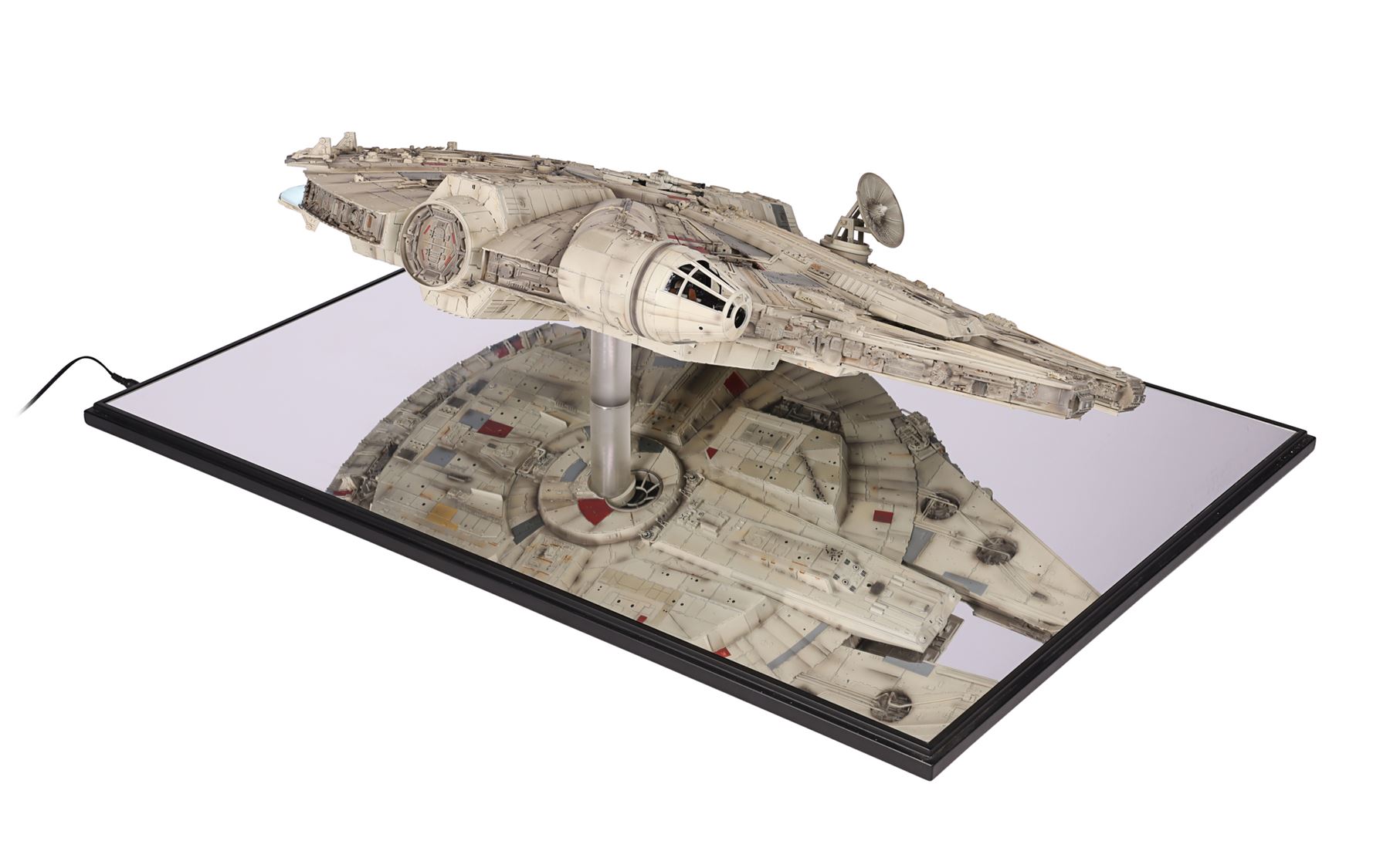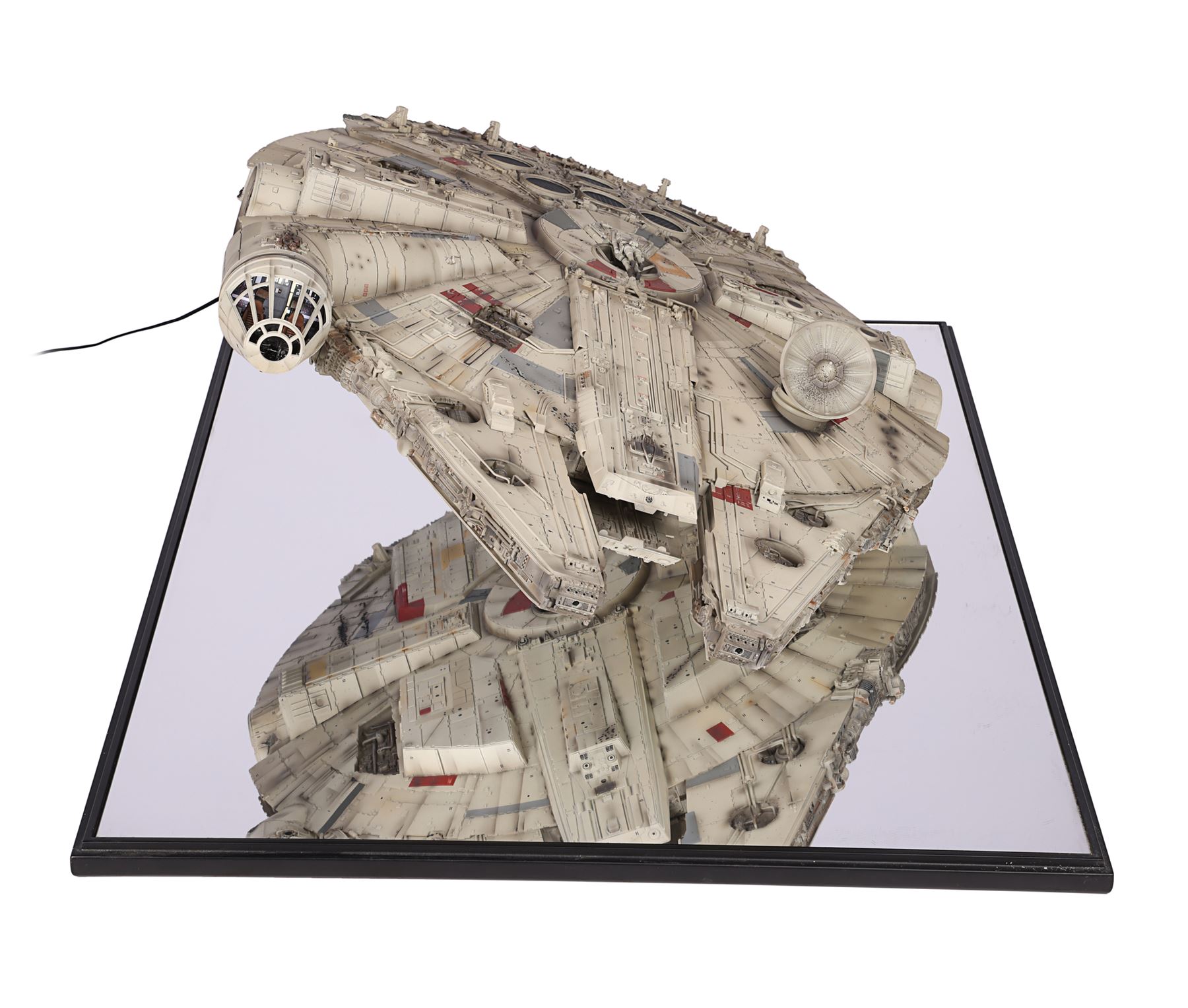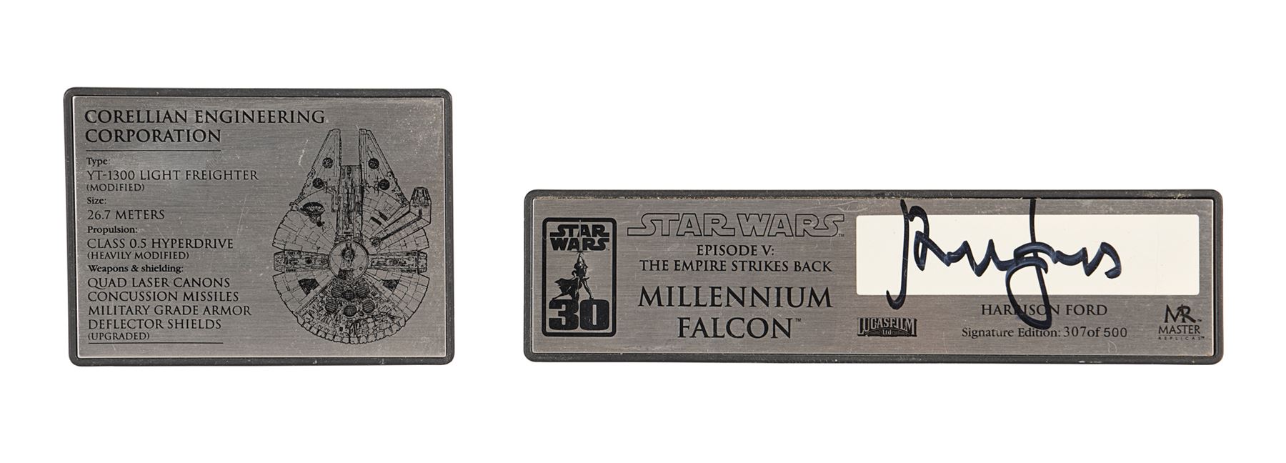 The lot is accompanied by a plaque identifying it as number 307 of 500 and is hand-signed by Harrison Ford (Han Solo). Also included are an additional "Corellian Engineering Corporation" plaque, instructions and a detailed booklet, which includes a certificate of authenticity. The model exhibits minor damage to a front component, scratches on the base, and non-functioning headlights. Dimensions (displayed): 91.5 cm x 66.5 cm x 32 cm (36" x 26 1/4" x 12 1/2")