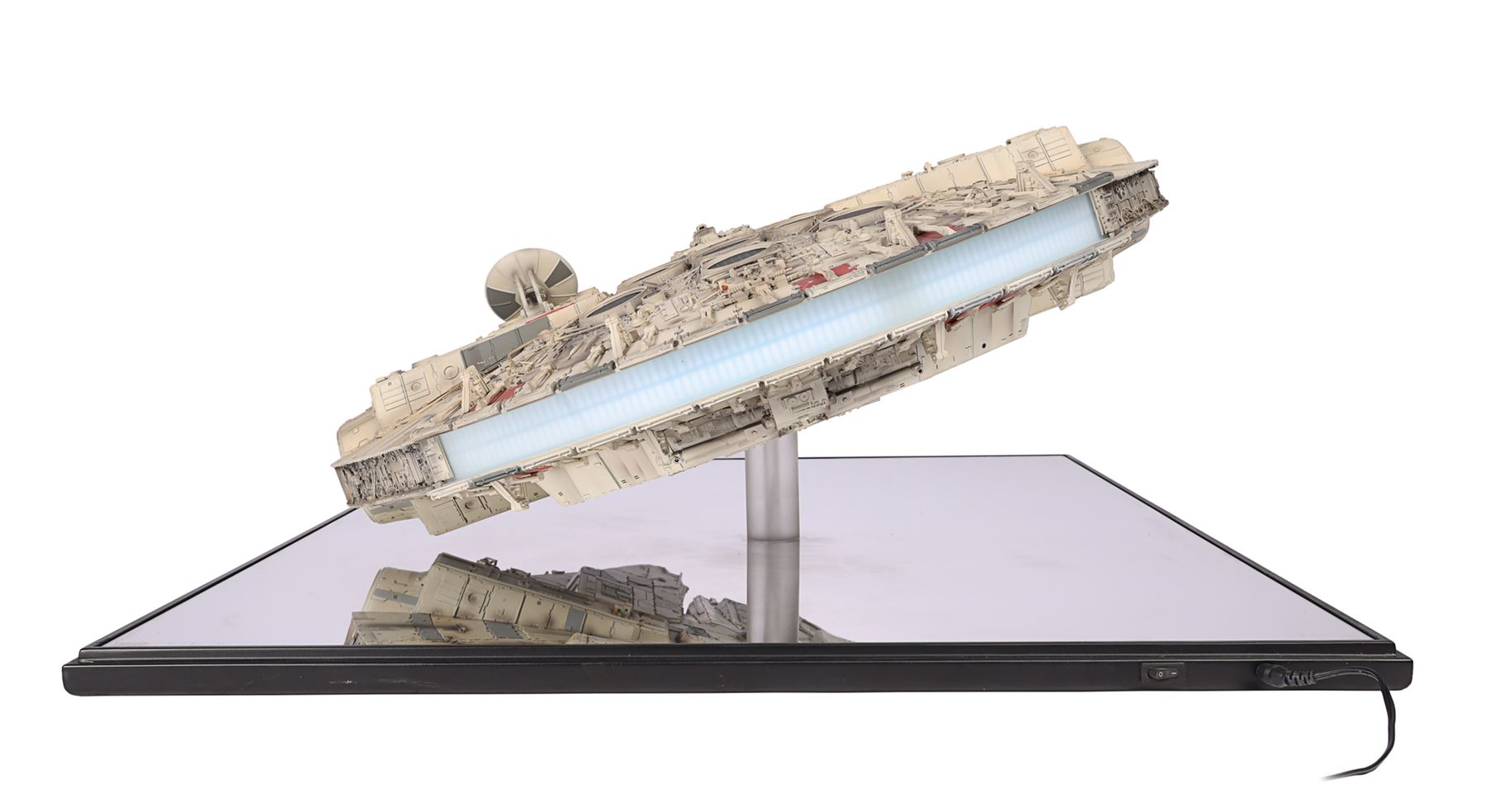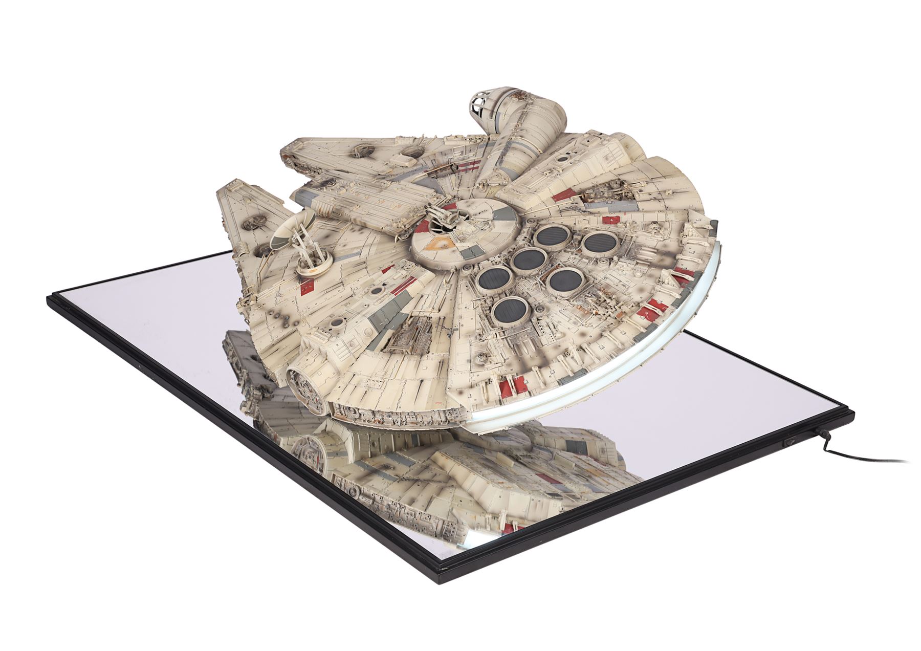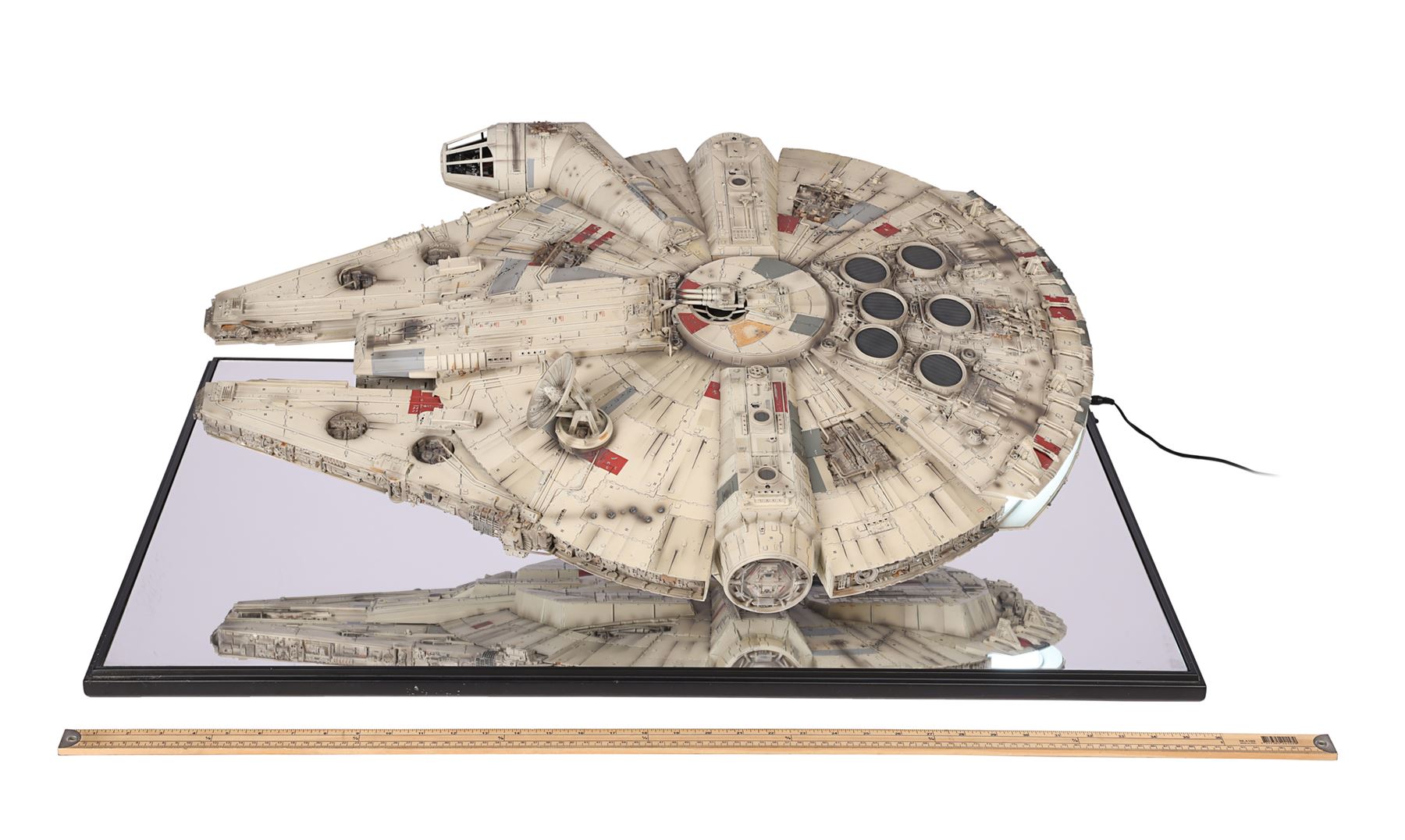 The lot is accompanied by a plaque identifying it as number 307 of 500 and is hand-signed by Harrison Ford (Han Solo). Also included are an additional "Corellian Engineering Corporation" plaque, instructions and a detailed booklet, which includes a certificate of authenticity. The model exhibits minor damage to a front component, scratches on the base, and non-functioning headlights. Dimensions (displayed): 91.5 cm x 66.5 cm x 32 cm (36" x 26 1/4" x 12 1/2")