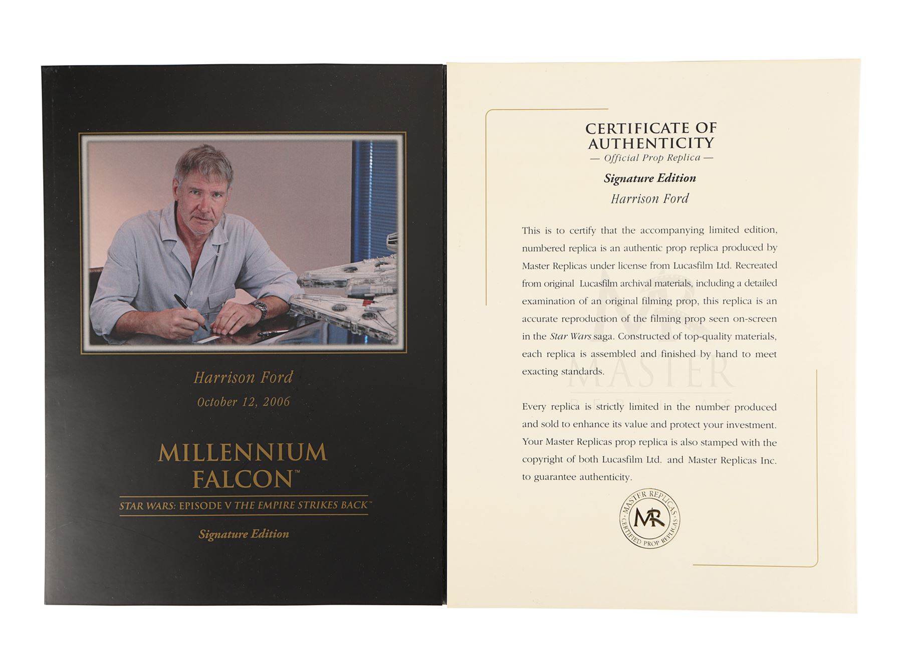 A Master Replicas Signature Edition studio-scale replica of the Millennium Falcon from Irvin Kershner's Star Wars: The Empire Strikes Back. Released in October 2006, this limited, Signature Edition model was based on the 32" Millennium Falcon filming miniature from the Lucasfilm Archives.