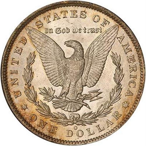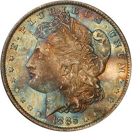 1885-O Morgan Dollar. Variegated toning gyrates throughout the obverse and partially touches the reverse, with frosty luster beneath and a good show of detail from a crisp blow by the dies. (#7162)
