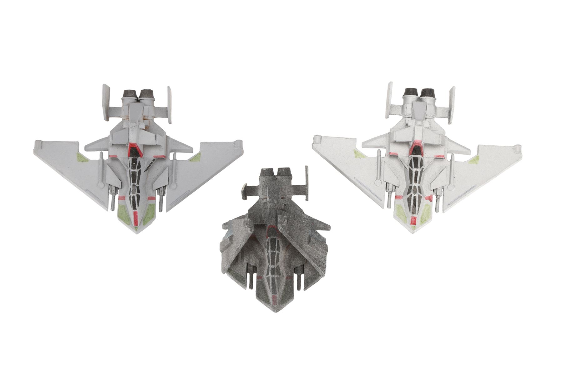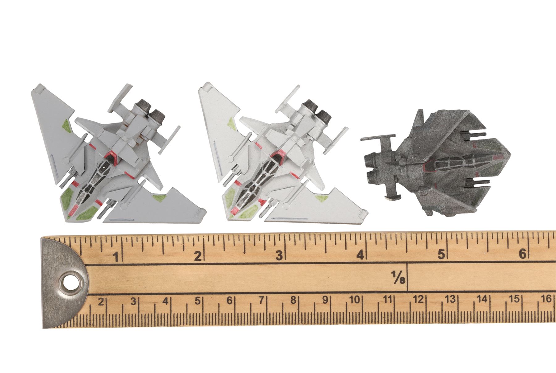 A set of three model miniature TAC fighters from Paul Verhoeven's sci-fi action film Starship Troopers. TAC fighters were the primary combat aircraft of the United Citizen Federation Fleet, notably used during bombing missions against the Arachnids.
