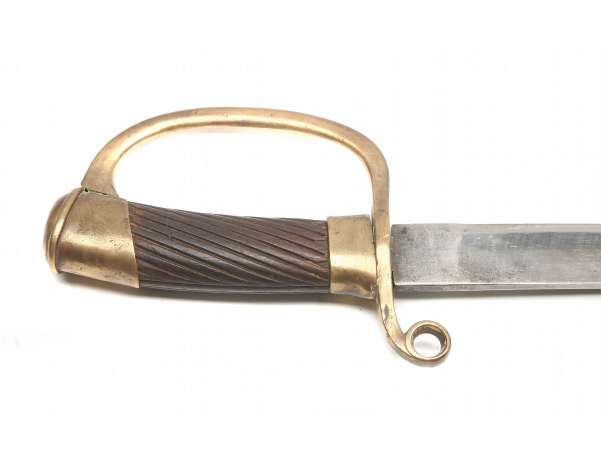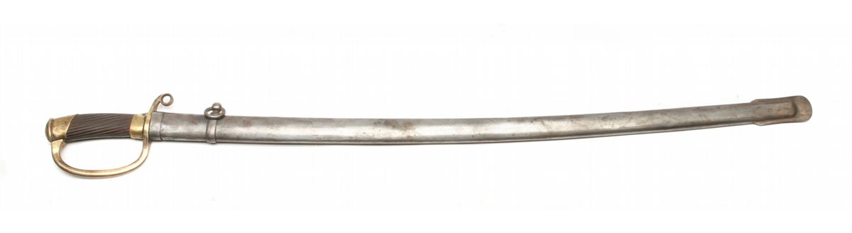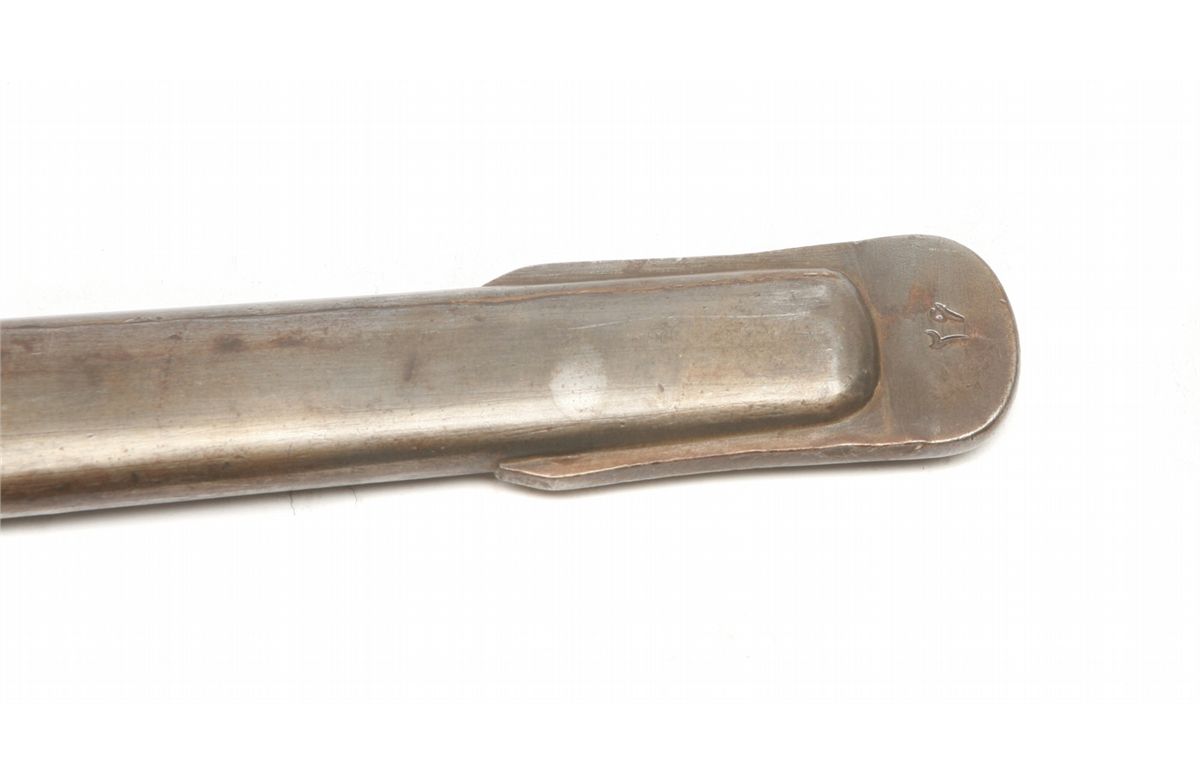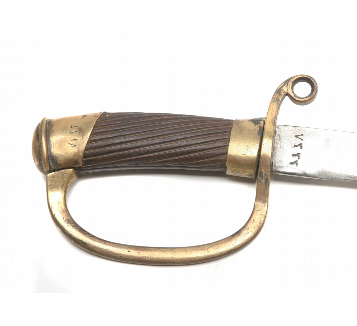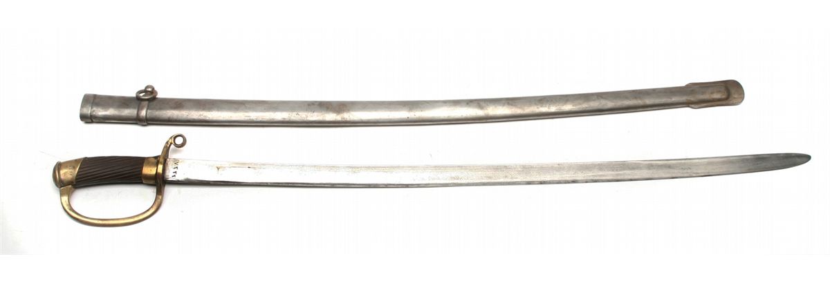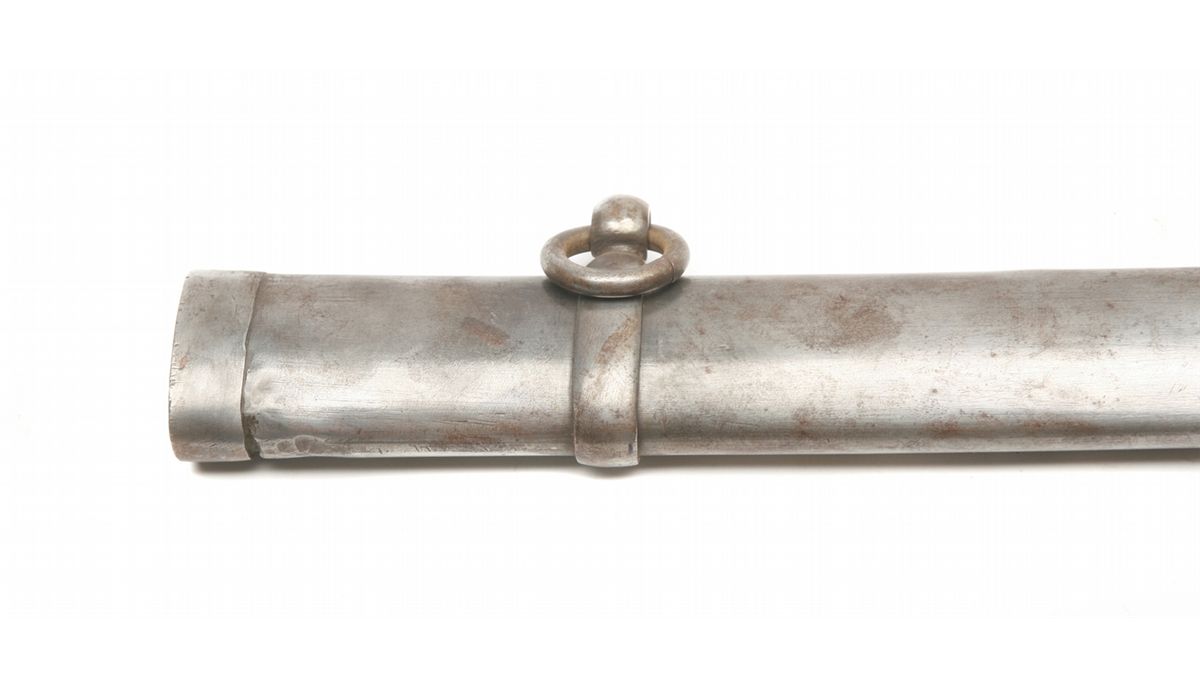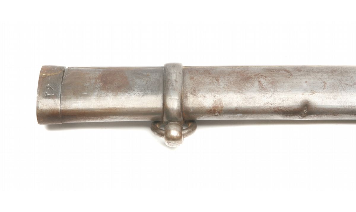 7333) - wood diagonal grooved handle - brass guard- freckling on blade - 37" overall, 31.5" blade - metal sheath with some dings/freckling - sheath marked with 2 farsi symbols on throat/drag - symmetrical drag - non-ffl - 25JJKTN101
