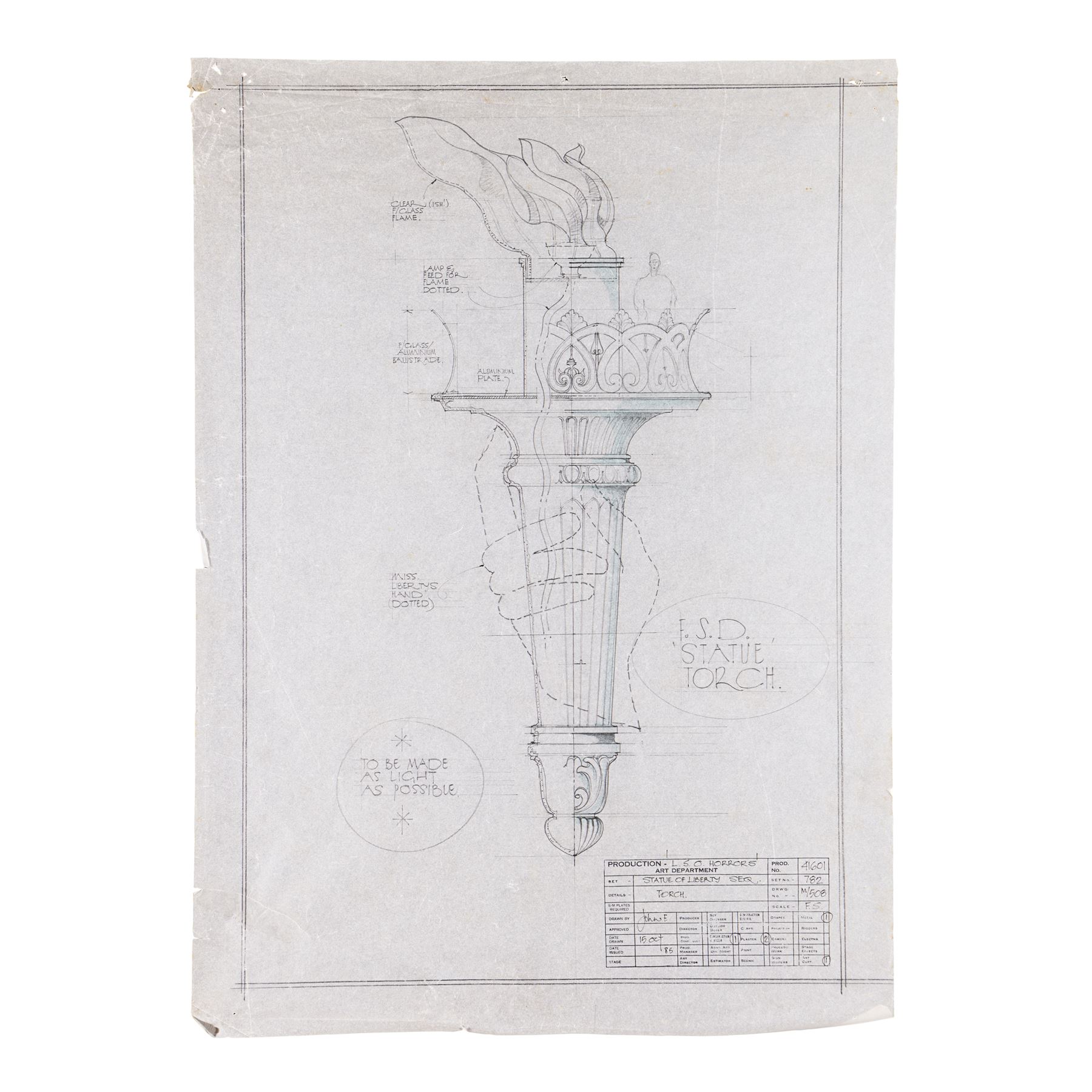 Both production designs are rendered in pencil and ink and drawn by model art director John Fenner. One depicts the torch, is attributed to the Little Shop of Horrors production, and is dated "15 Oct 85". The other depicts the statue in its entirety, is attributed to Superman IV, and is dated "19 Sept 86". The designs are rolled for storage and have some minor staining and wear to the edges. Dimensions (statue): 48 cm x 65 cm x 189 cm (19" x 25 1/2" x 74 1/2")