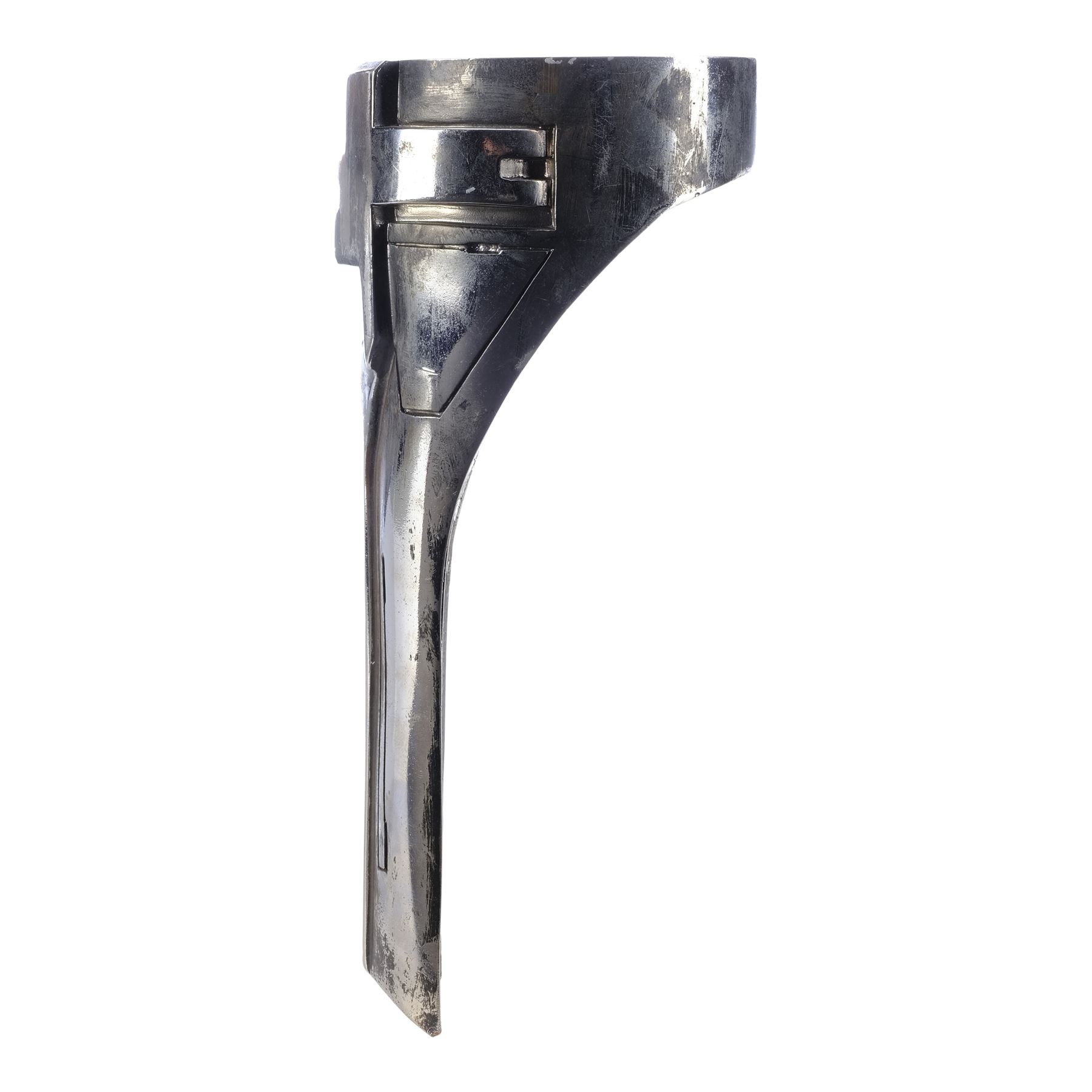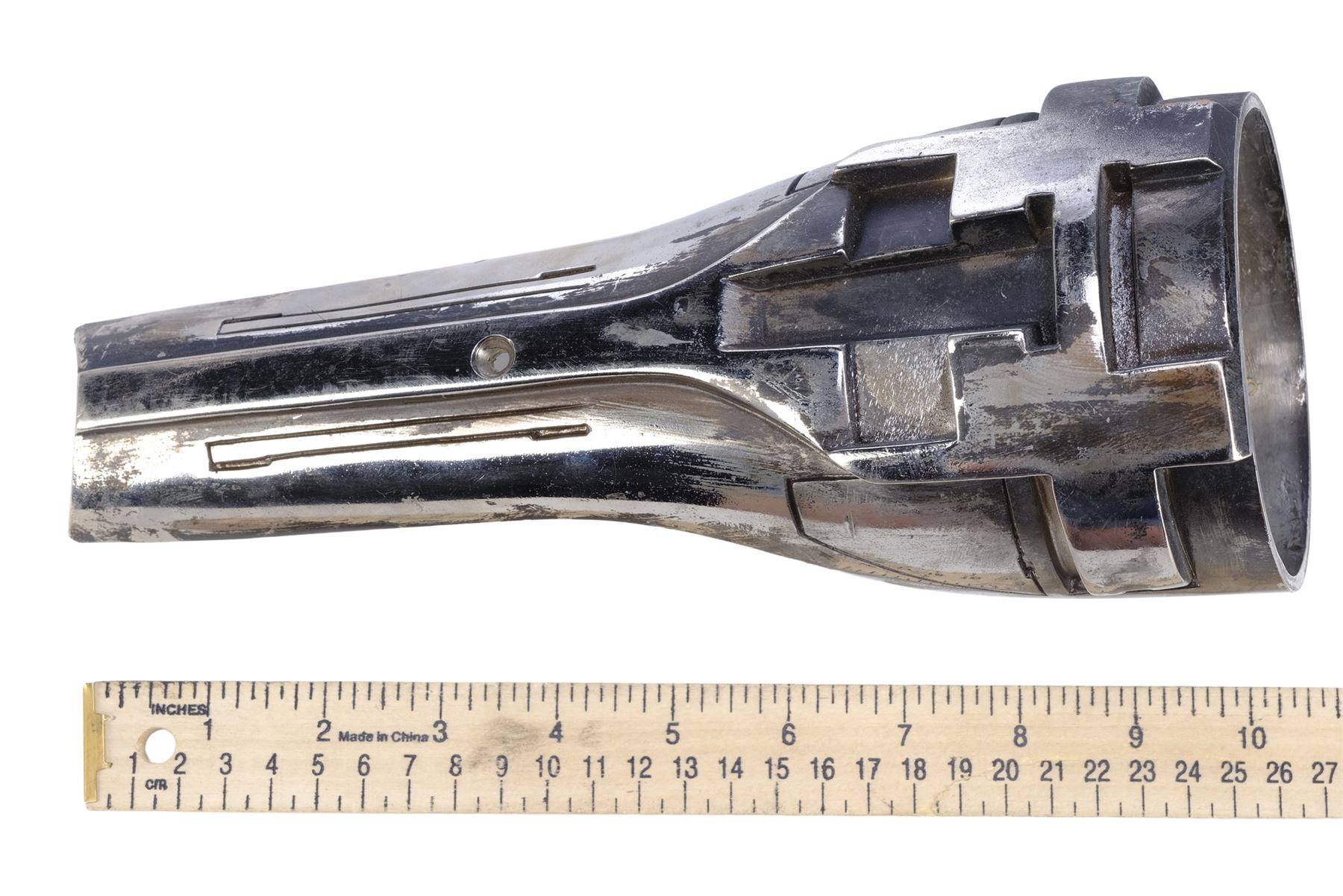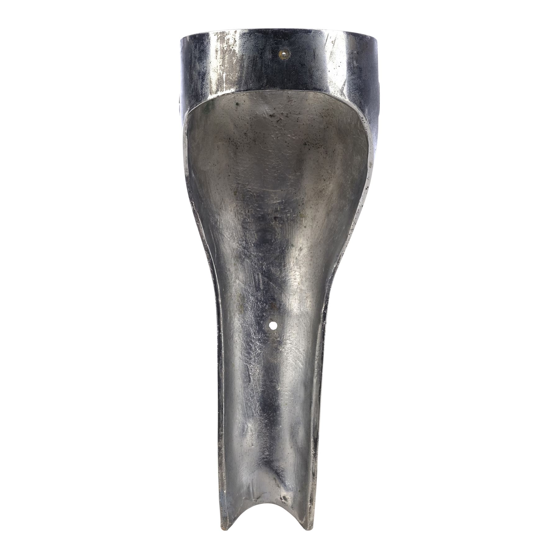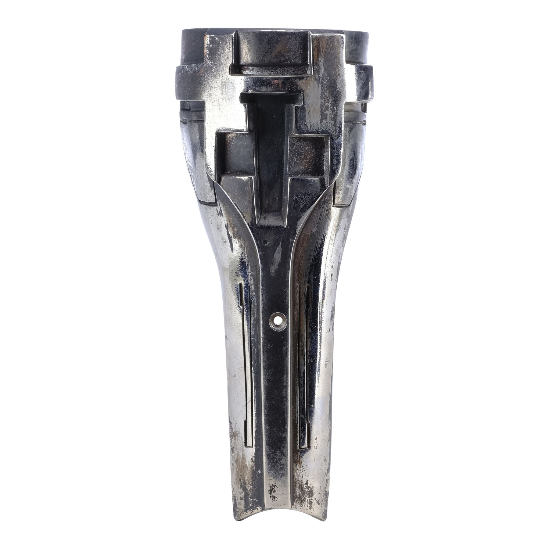 This metal shin has been painted with a chrome-colour metallic finish and features production-applied distressing throughout. It exhibits some additional scuffing and wearing away of the finish. Dimensions: 10.5 cm x 10.5 cm x 25.5 cm (4.25" x 4.25" x 10")