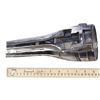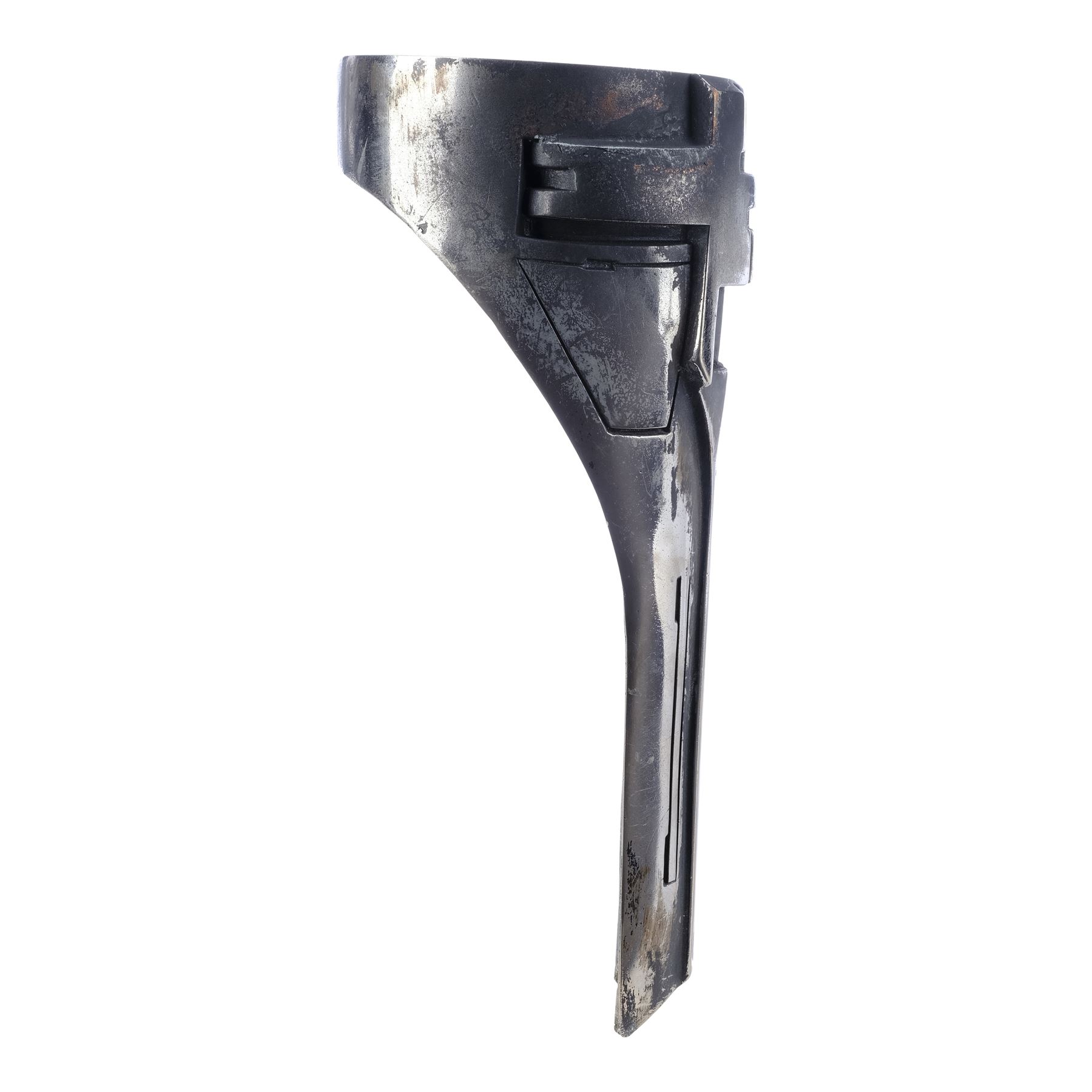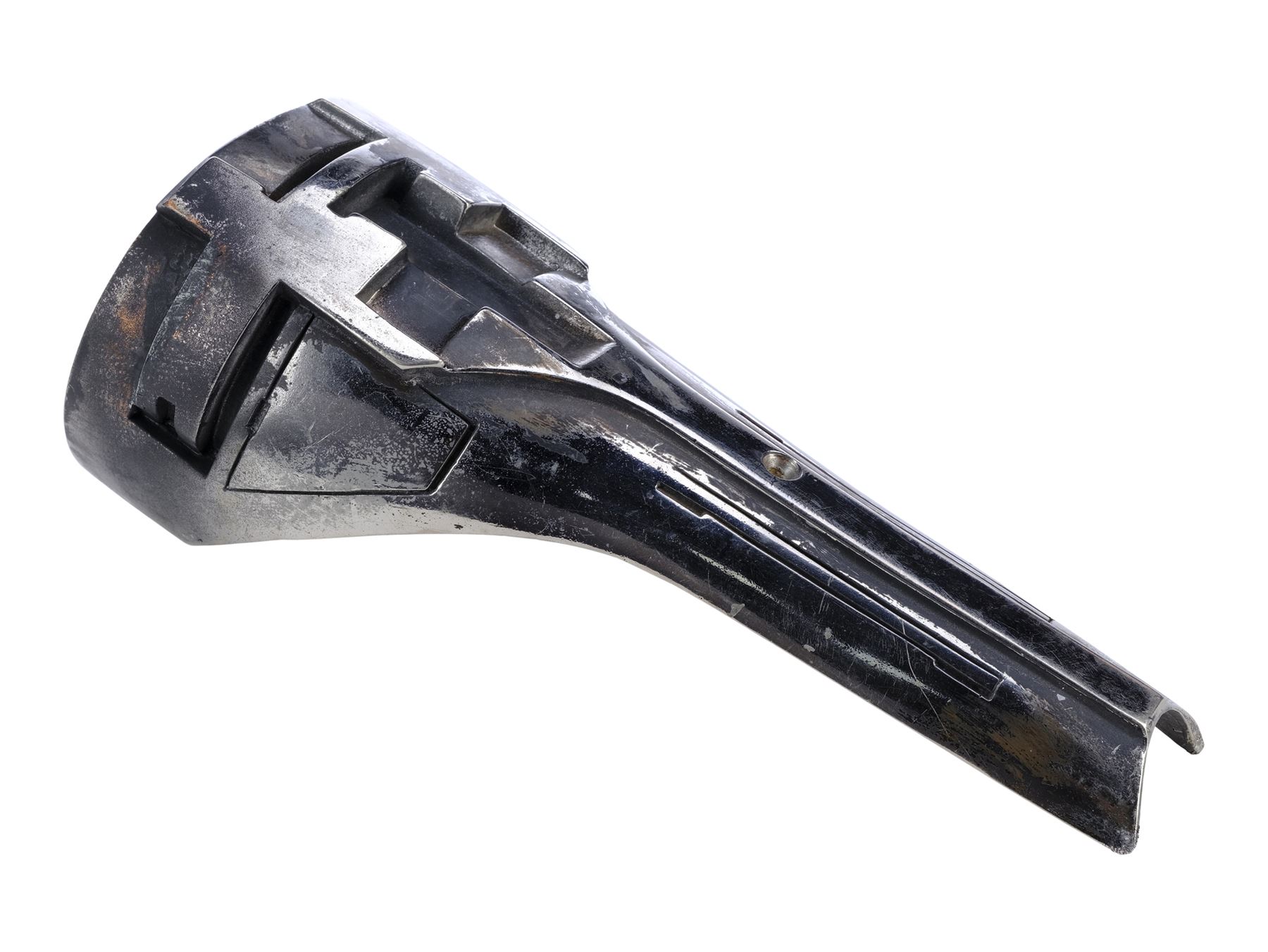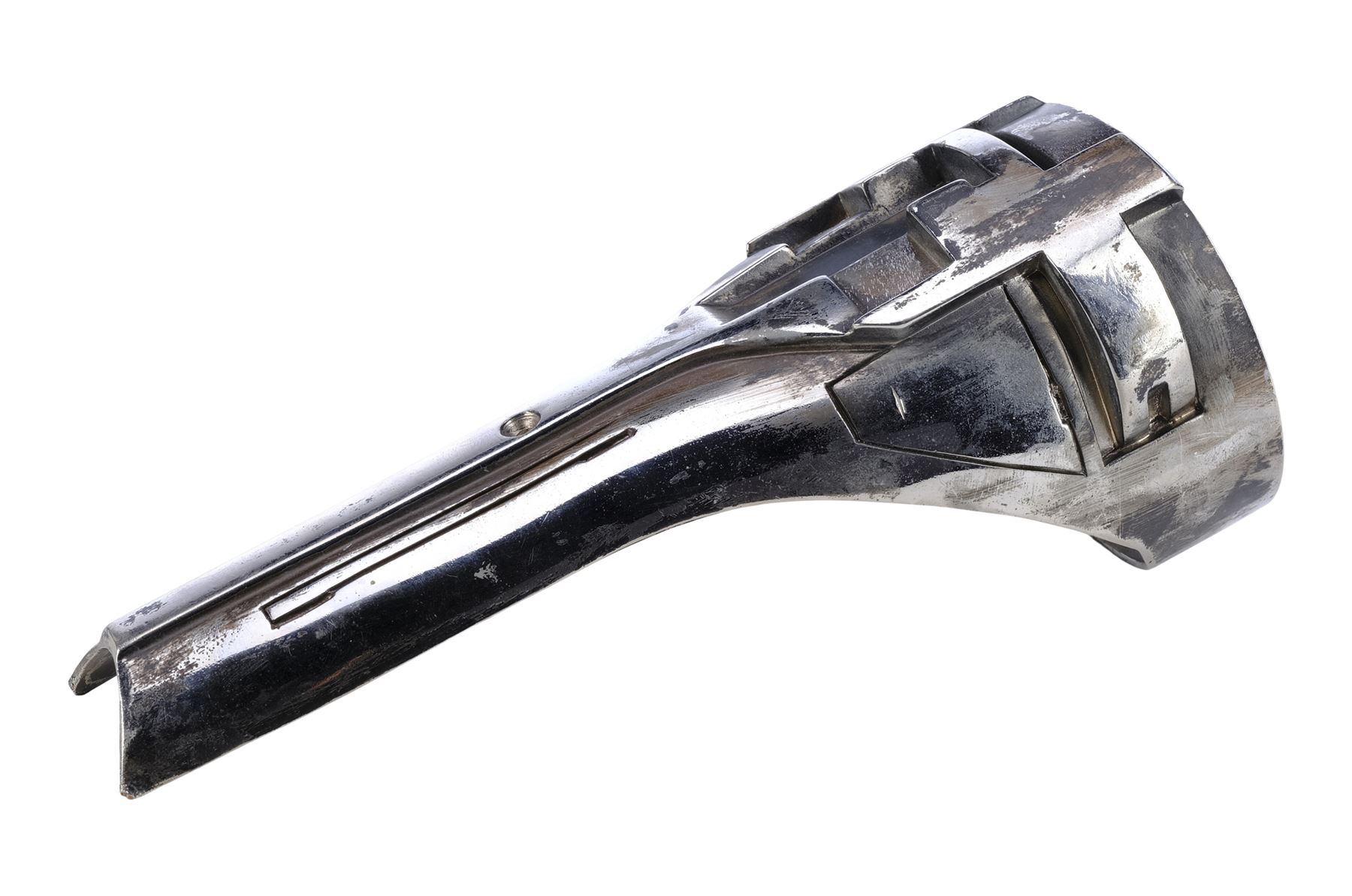 This metal shin has been painted with a chrome-colour metallic finish and features production-applied distressing throughout. It exhibits some additional scuffing and wearing away of the finish. Dimensions: 10.5 cm x 10.5 cm x 25.5 cm (4.25" x 4.25" x 10")