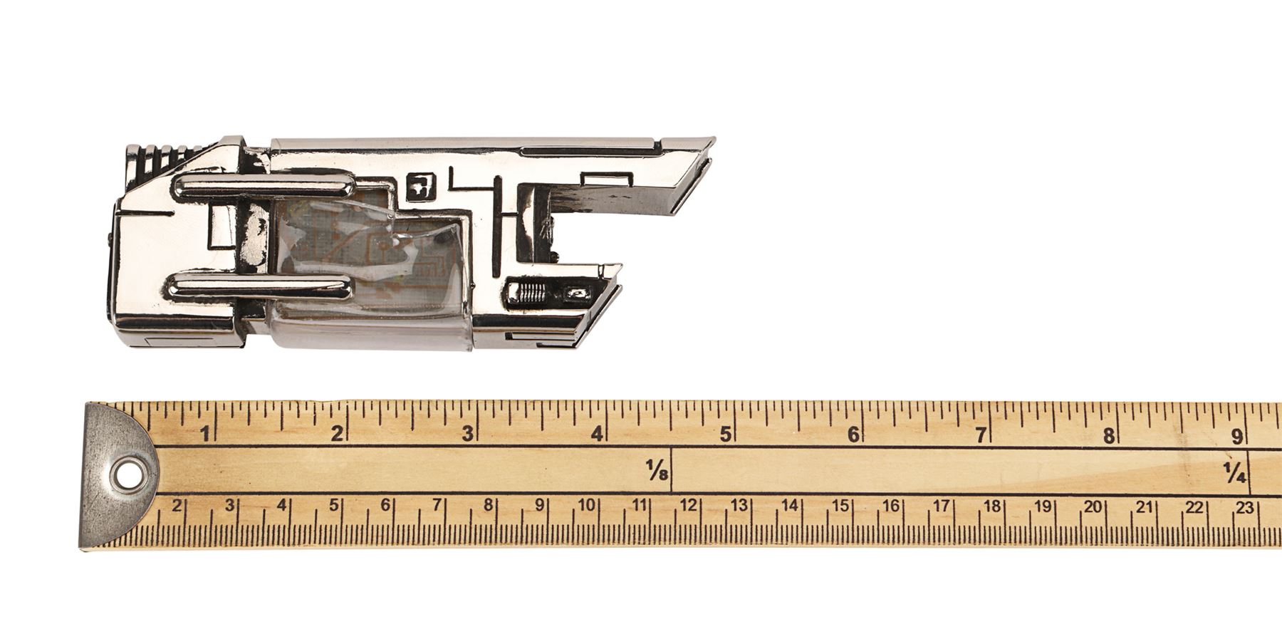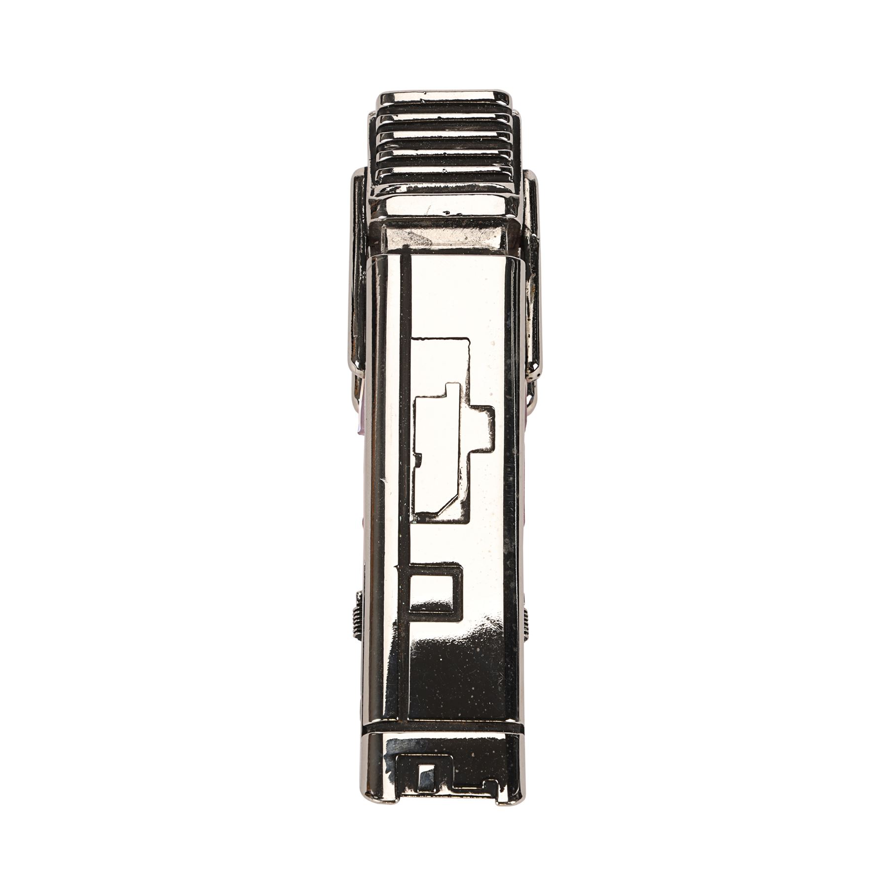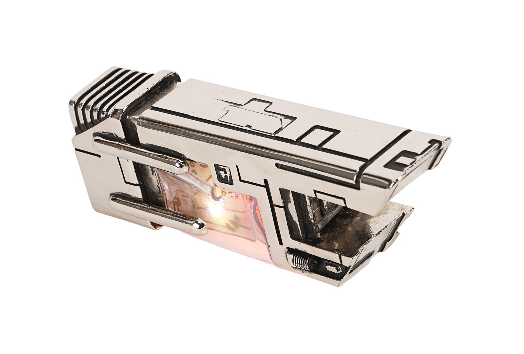 The cell is made from chromed resin and features clear acrylic casing surrounding printed computer chips at its centre. Red and yellow lights illuminate at the centre when a small switch at the base is activated, and the base of the fuel cell also features a magnet. Part of the acrylic casing has melted and warped on one side. Dimensions: 11.5 cm x 4 cm x 3 cm (4 1/2" x 1 1/2" x 1 1/4")