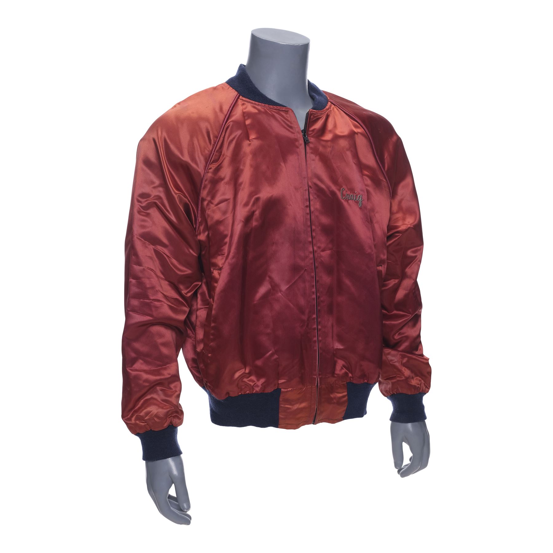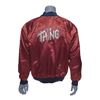 This lot consists of one dark purple satin bomber-style jacket (size xxL) with beige satin lining, a front zip closure, and navy blue ribbed knit collar and hem. The interior of the jacket features a The Cloth Tattoo tag. The film's title is embroidered in silver colour on the back. This jacket exhibits discolouration from light exposure and snagged threads.