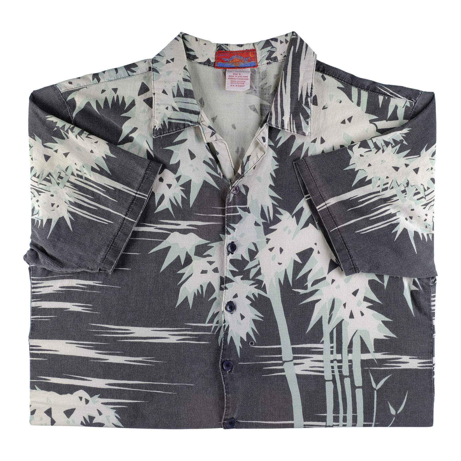 This lot consists of a grey and beige cotton Paradise Hawaiian themed button-down short-sleeve shirt (size L). This shirt comes mounted in a black wooden frame display with two images of Ritter wearing the shirt in the background. This lot exhibits minor scuffing to the frame's corner edges. Dimensions: (display) 85 cm x 72.5 cm x 4 cm (33.5" x 28.5" x 1.5")