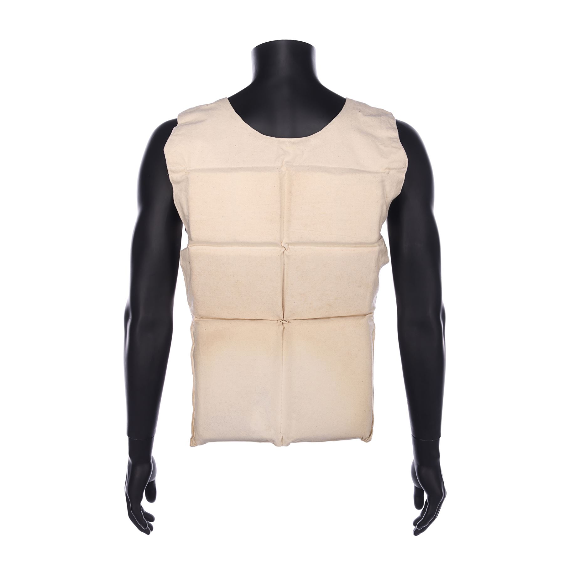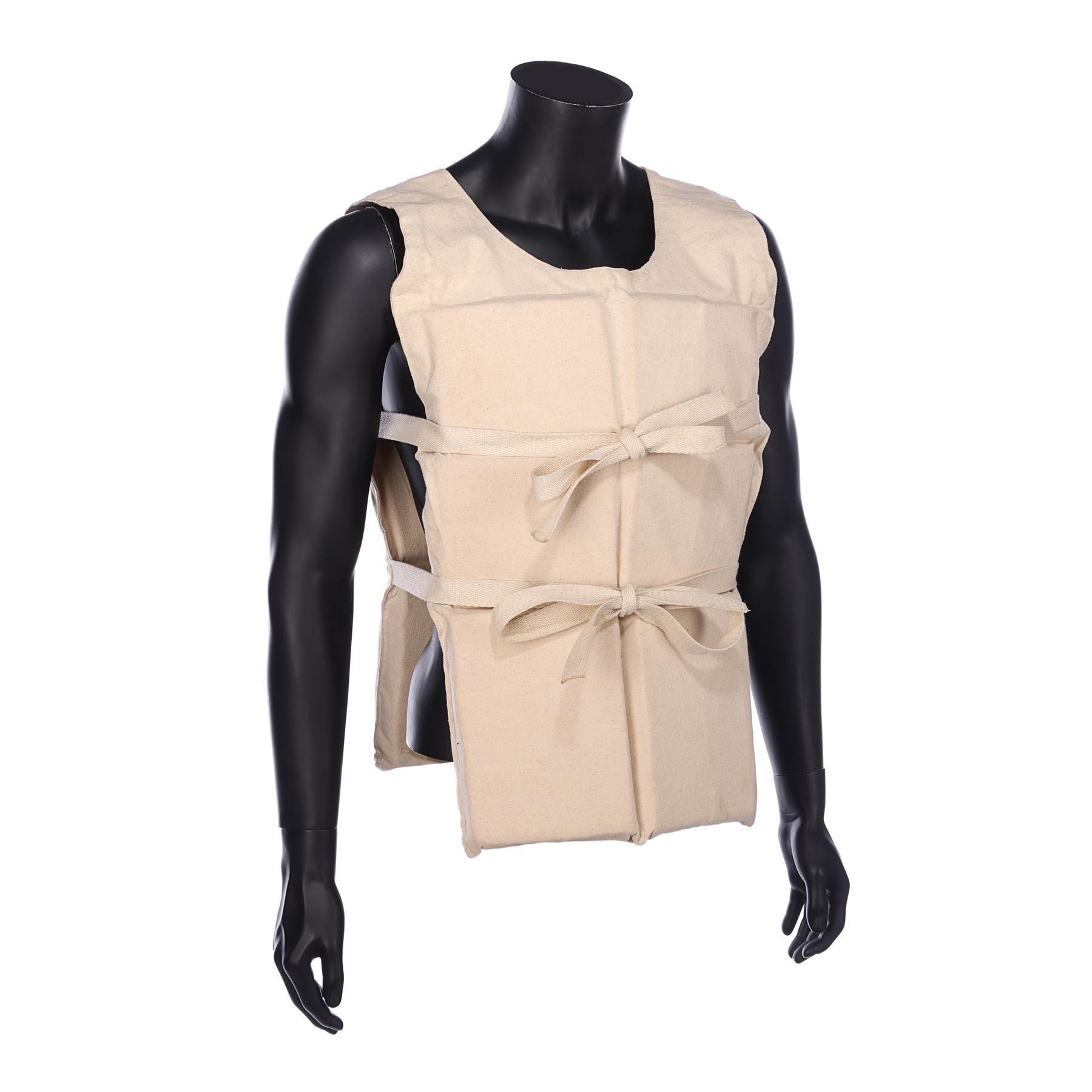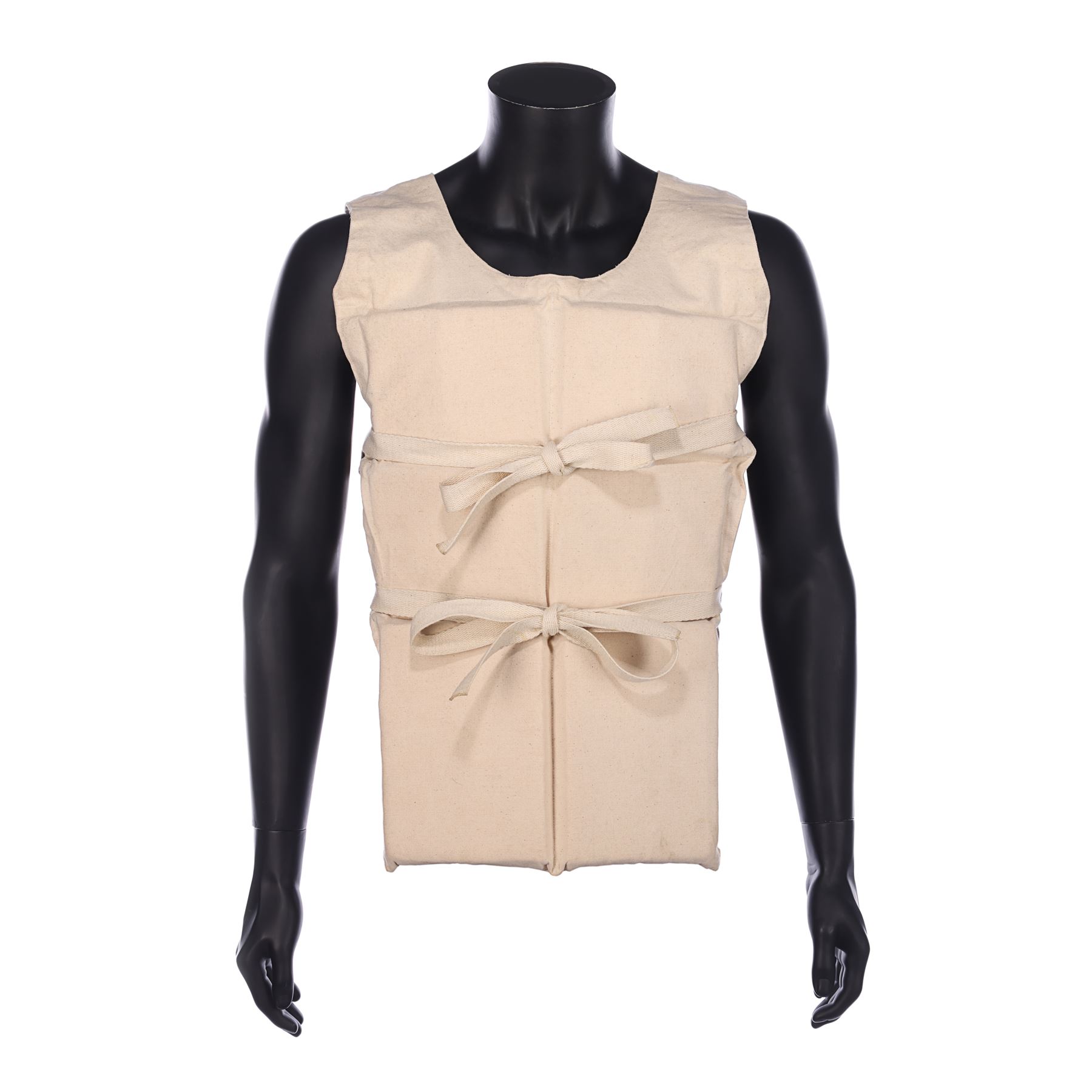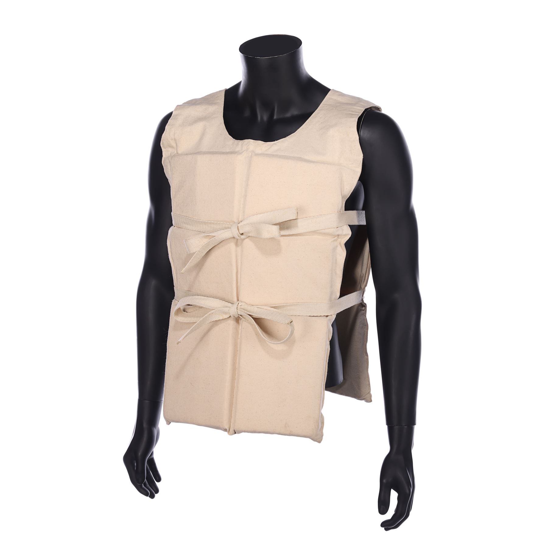This vest is constructed from cream-colour canvas encasing squares of foam padding stitched into the front and back. Sewn to the sides of the back panel are two cream-colour cotton woven straps that wrap around and fasten at the front. This lot originates from the collection of Steve Santini, a leading Titanic expert who was hired as a consultant during the film's production.