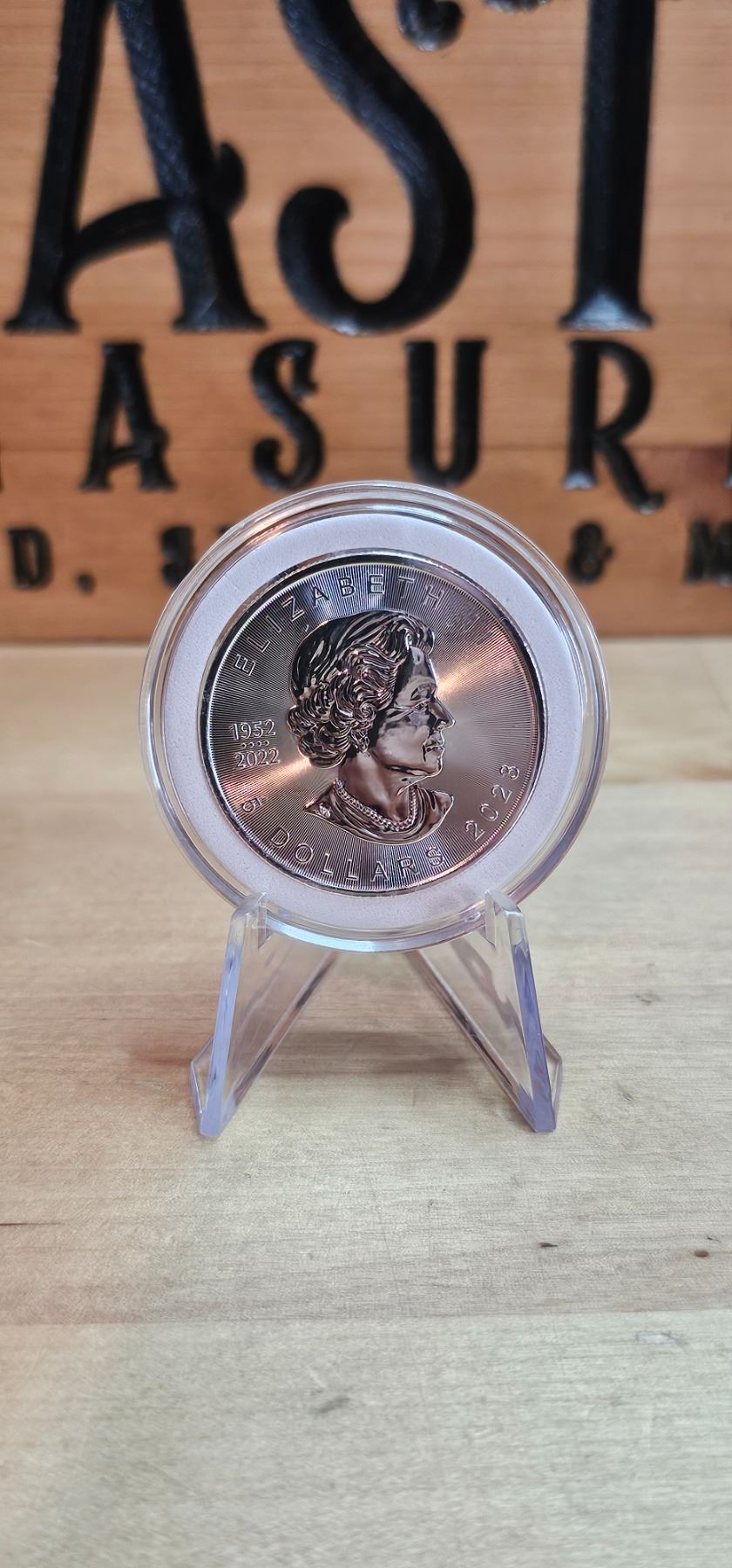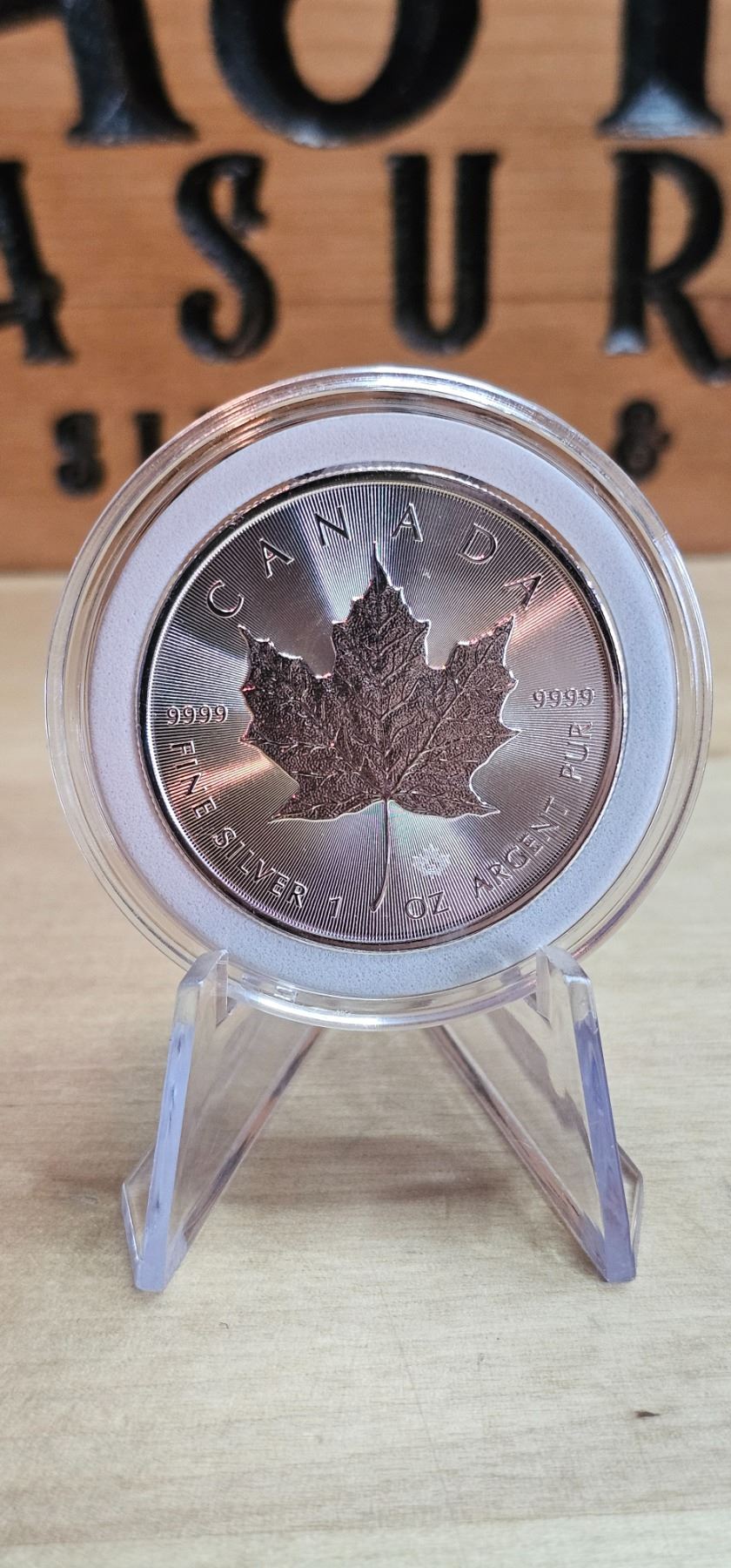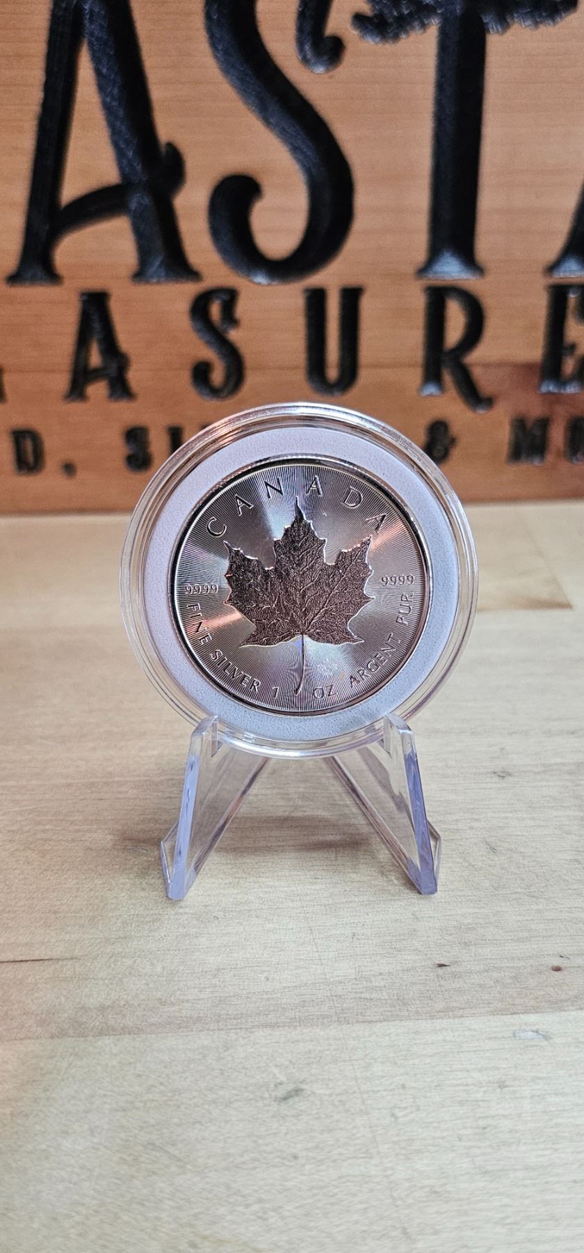 The 2023 1 Oz Silver Maple Leaf Coin features .9999 fine silver and showcases the iconic maple leaf design. This coin is housed in a protective capsule, making it an ideal collectible for investors and enthusiasts.