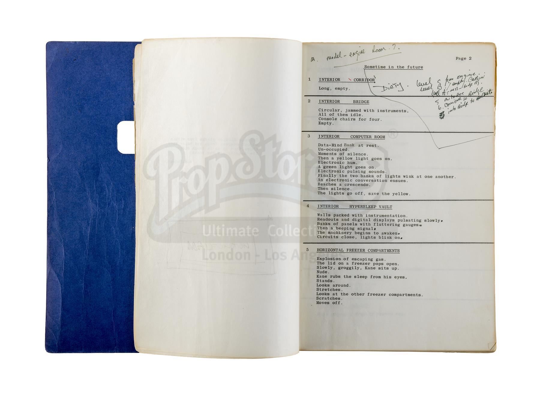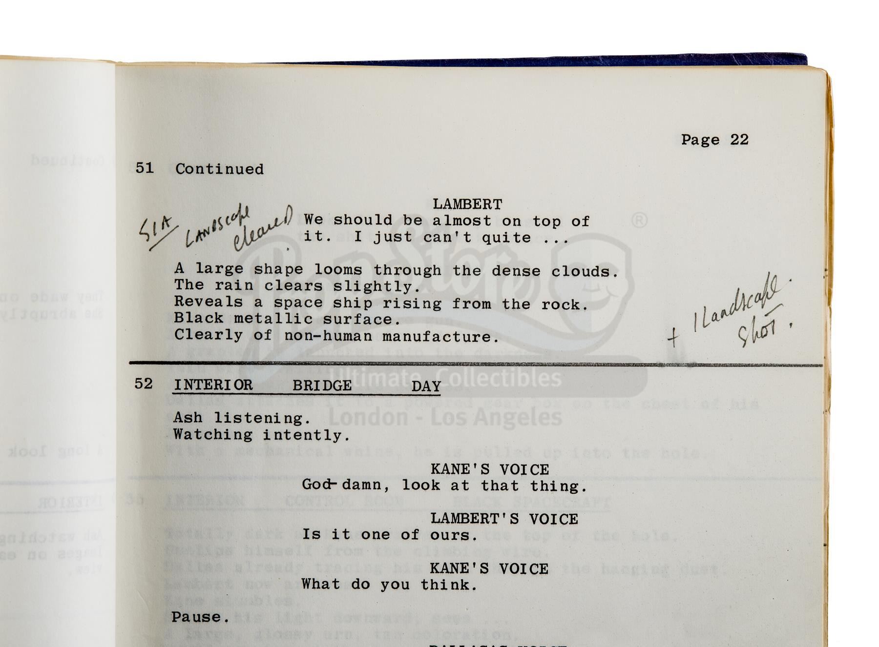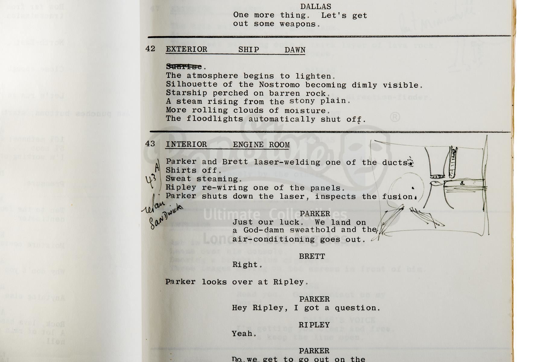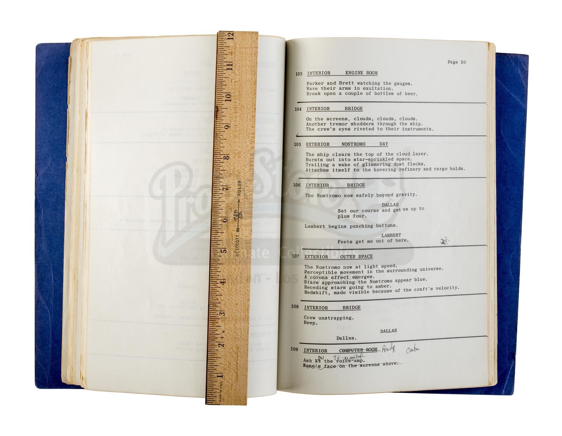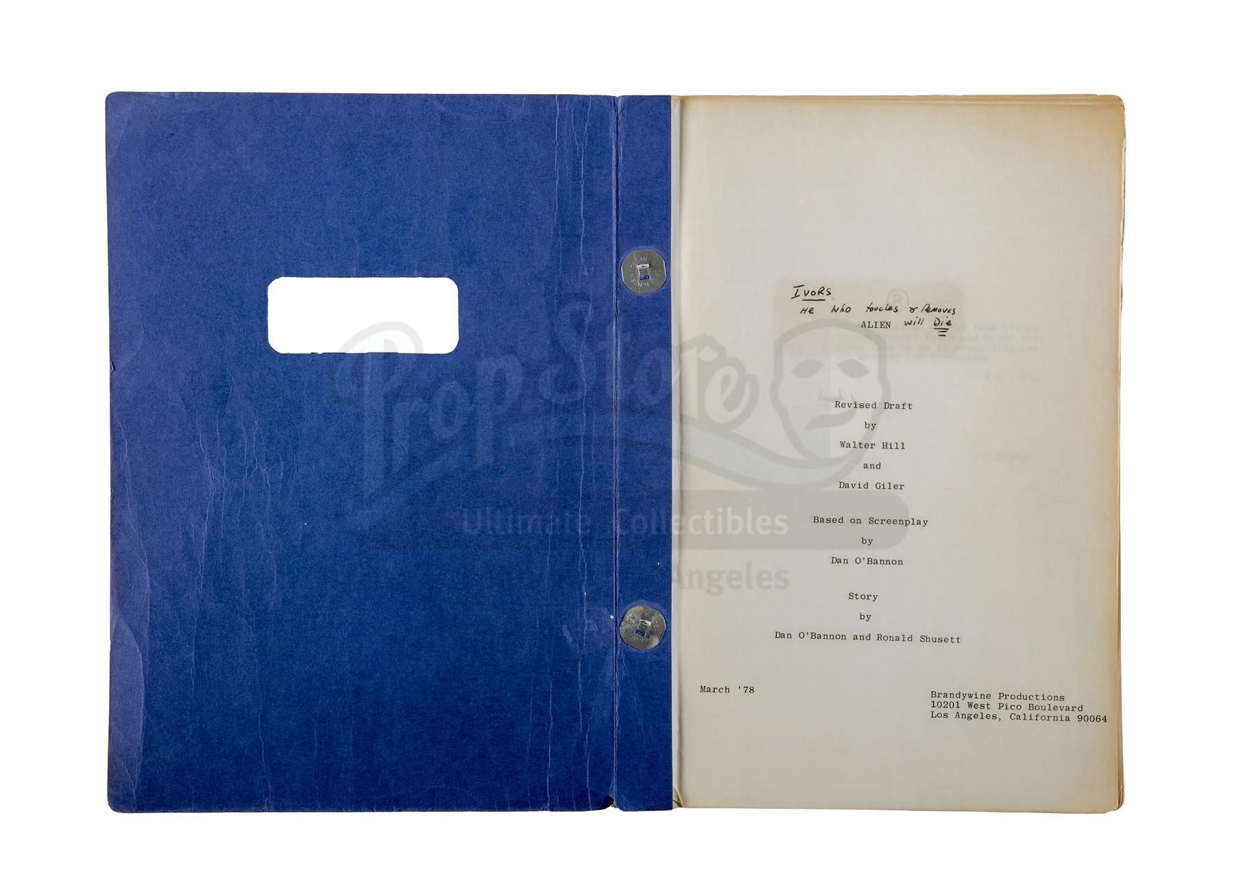 Ivor Powell's revised script from the production of Ridley Scott's sci-fi horror film Alien. The script features a header on Page 1 indicating this is the revised draft by Walter Hill and David Giler based on Dan O'Bannon's screenplay.