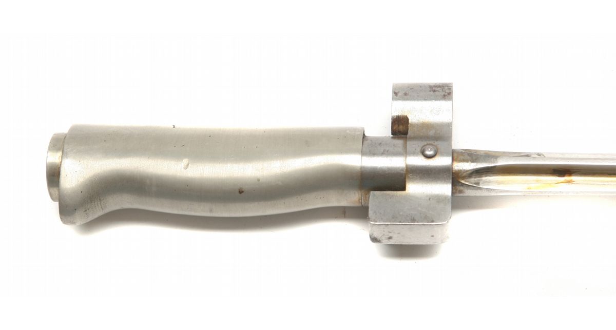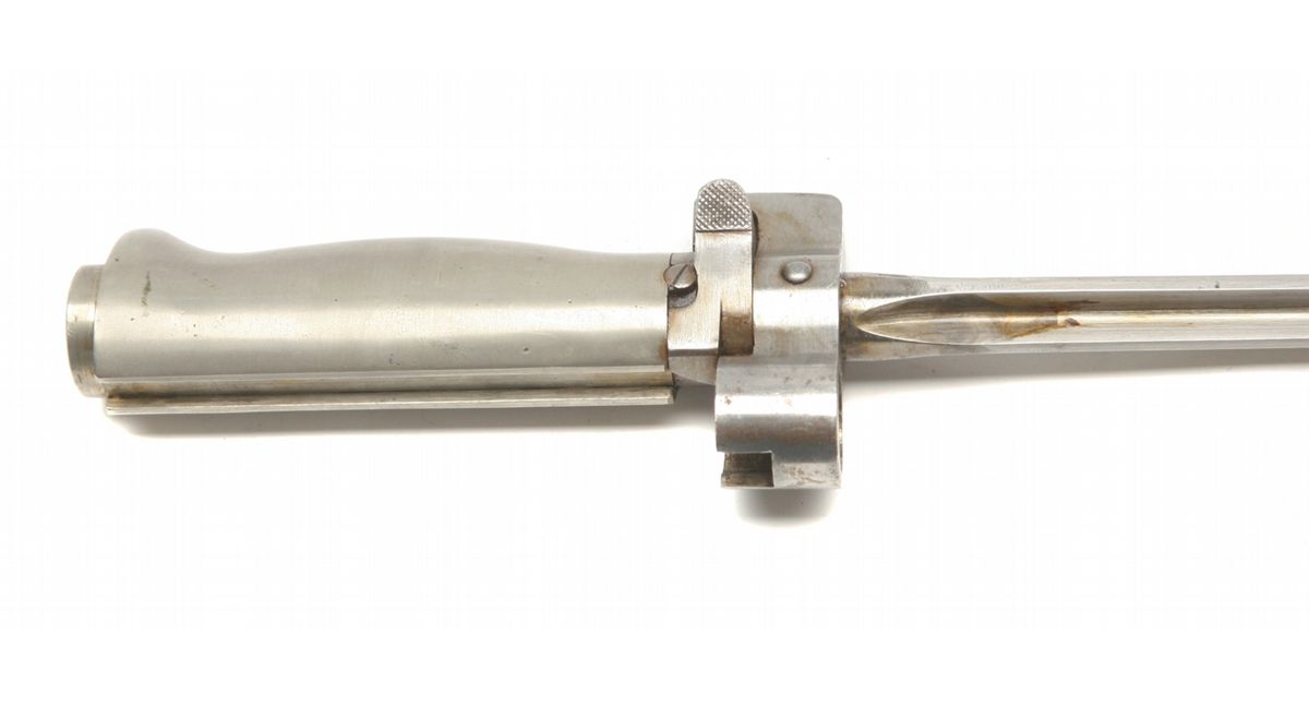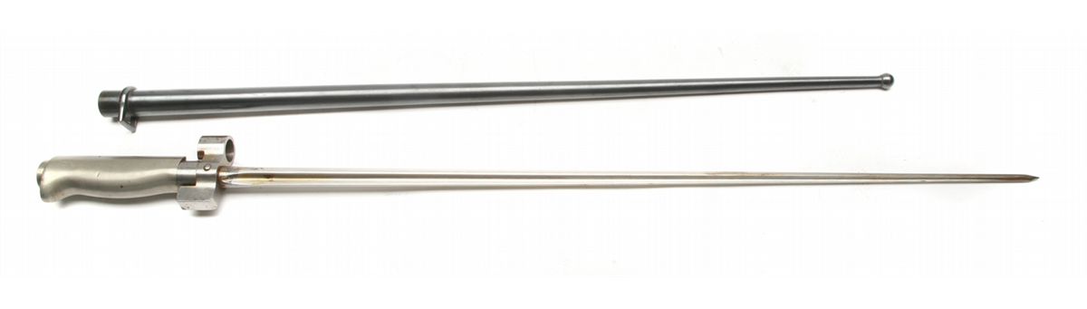 cruciform spike bayonet - 25" overall, 20.25" blade - aluminum handle - some discoloration on guard - metal tube sheath - undented - 95% remaining blue - non-ffl - 25WRHKS009