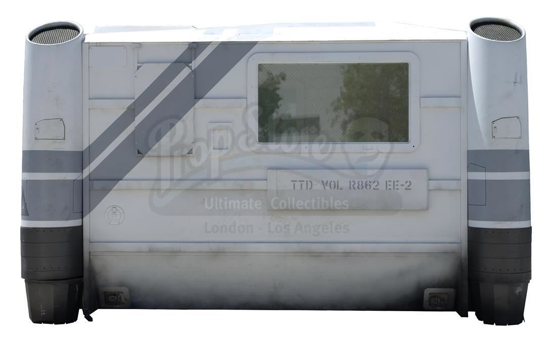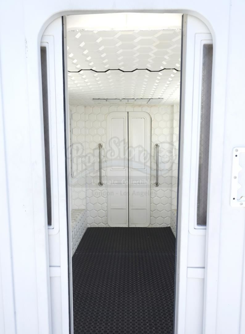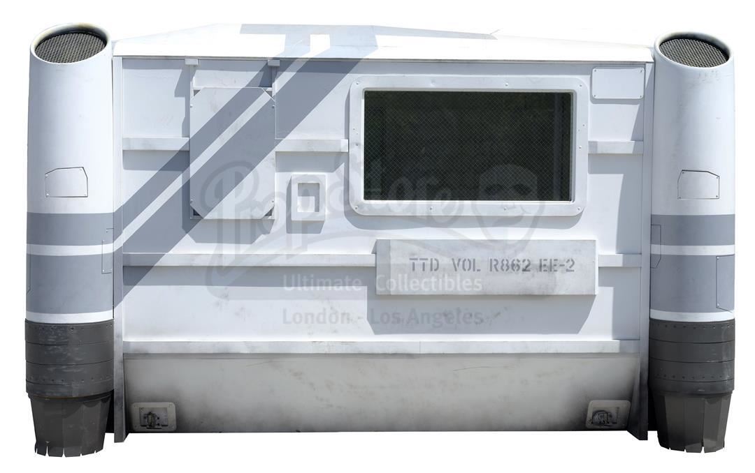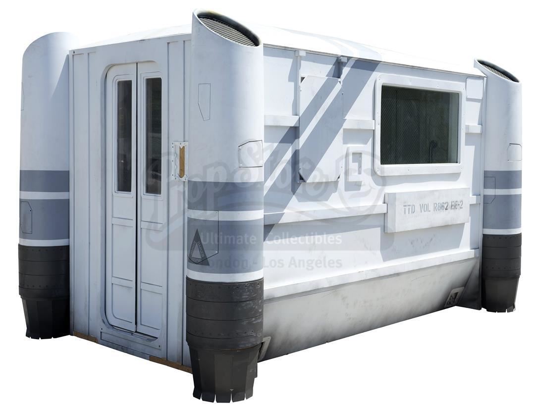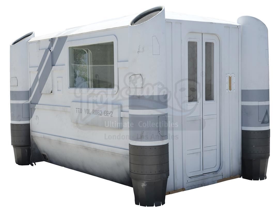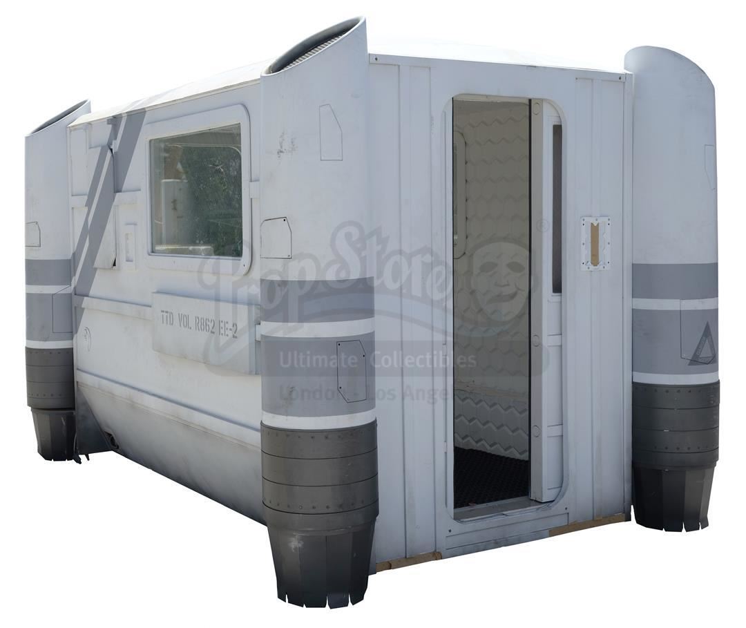 An oversized flying containment module from Seasons 3 through 7 of Marvel's Agents of S.H.I.E.L.D. S.H.I.E.L.D. uses its state-of-the-art, rocket-powered containment module to locate and hold enhanced and empowered people, including Lash, Giyera, and Robbie Reyes, throughout the seasons. This oversized , rolling module, one of two created for the series, is constructed of wood and fiberglass paneling with steel, resin, and urethane components hand-painted white with black details and gray text on the exterior reading 'TTD VOL R862 EE-2'. The interior walls are painted white with hexagonal patterns modeled on The Cage, as seen in Seasons 1 and 2. Loose wiring protrudes from panels where electronics were removed by production, and remnants from the events of the series finale, 'What We're Fighting For' (713), are affixed to the interior.