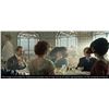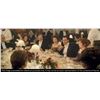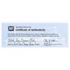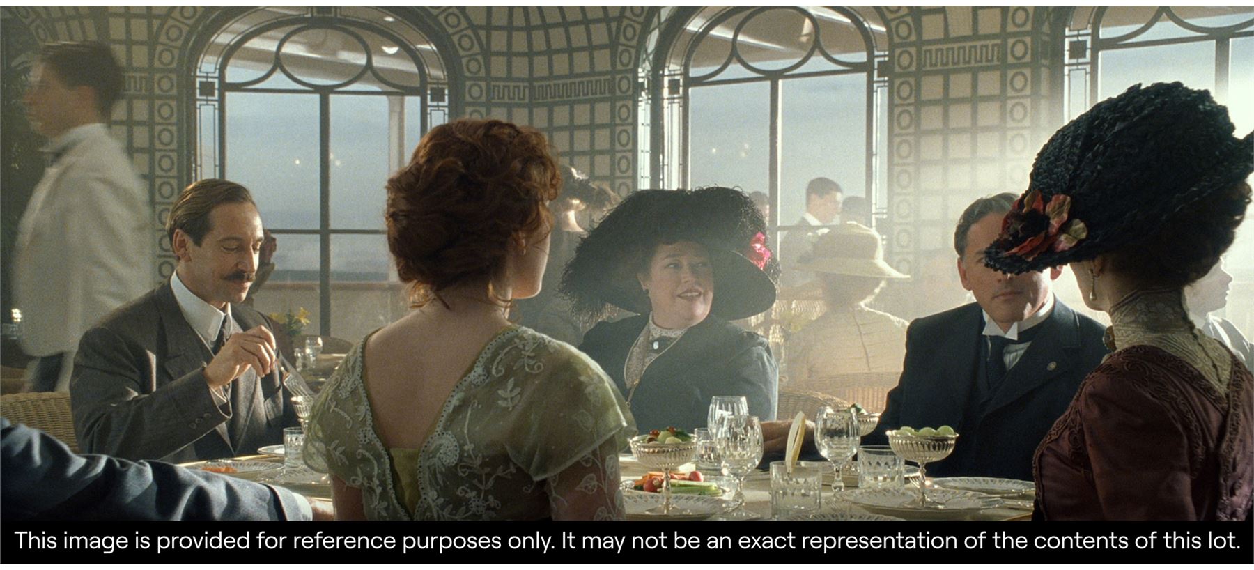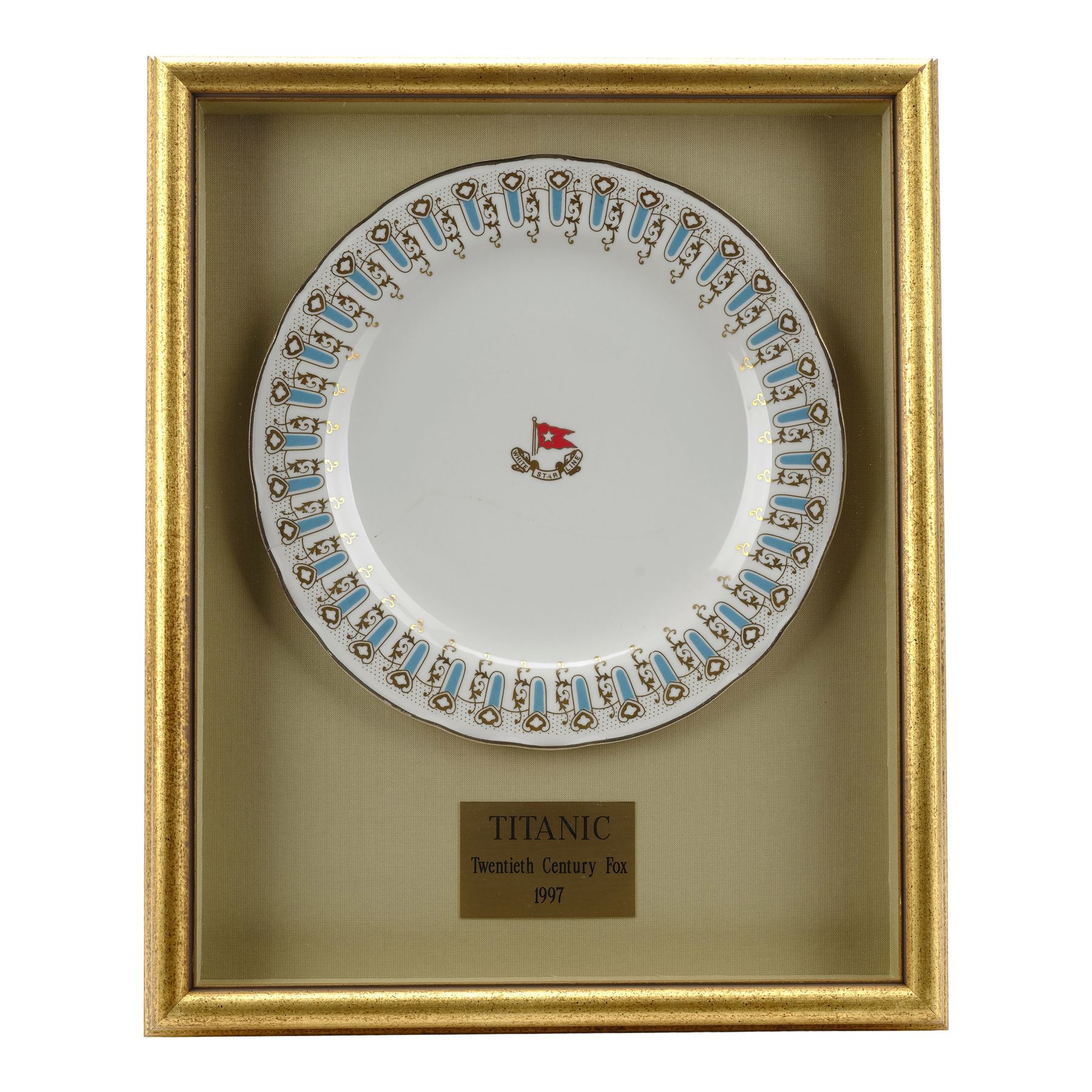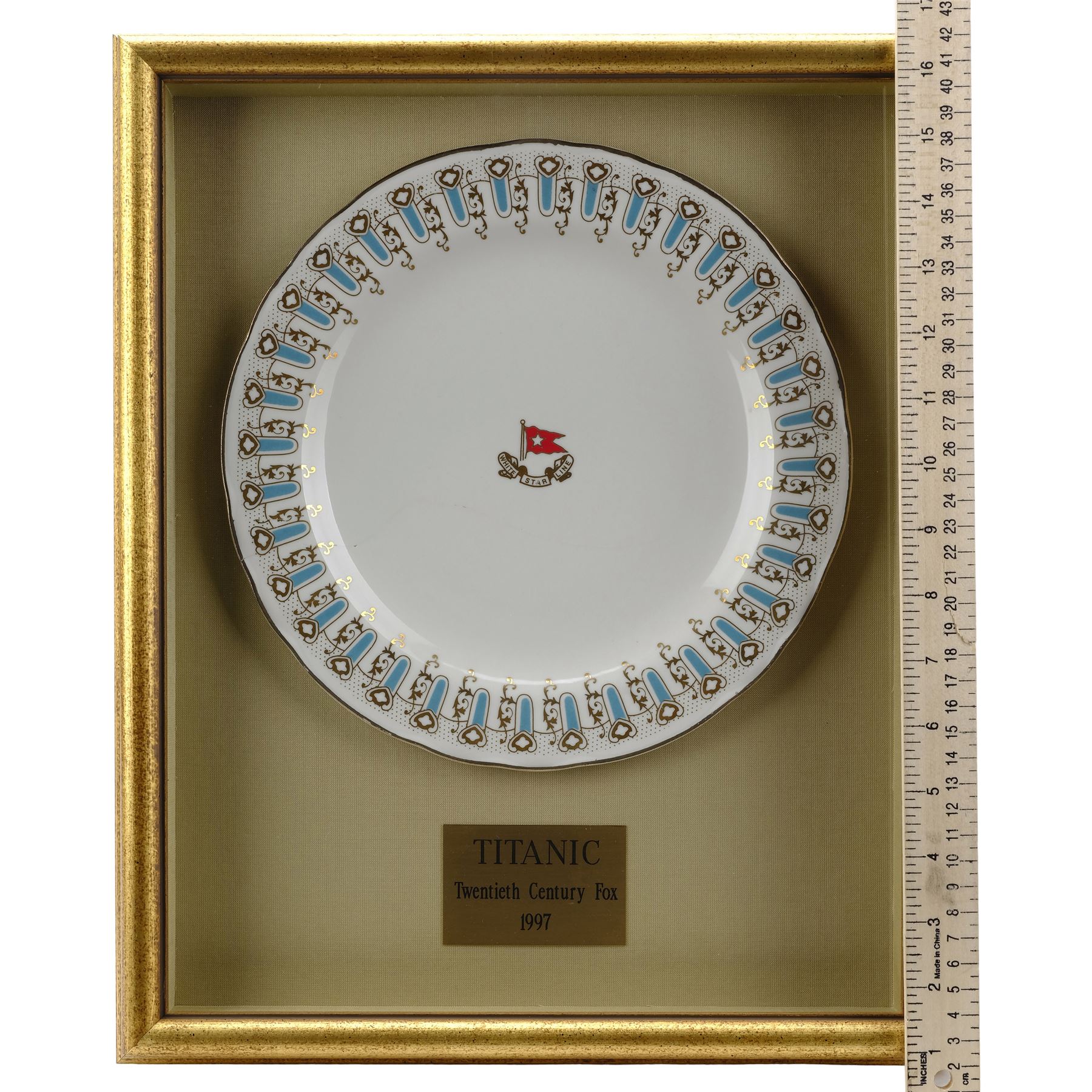 This white ceramic plate features gold and teal paint details with the White Star Line logo painted red and gold in the centre of the plate. This plate comes mounted in a gold-colour wooden shadow-box frame with a beige canvas background and gold-colour plaque engraved "TITANIC Twentieth Century Fox 1997." Also included is a Fox Certificate of Authenticity. The back of the frame exhibits tearing. Dimensions: 42 cm x 34.5 cm x 6.5 cm (16.5" x 13.5" x 2.5")