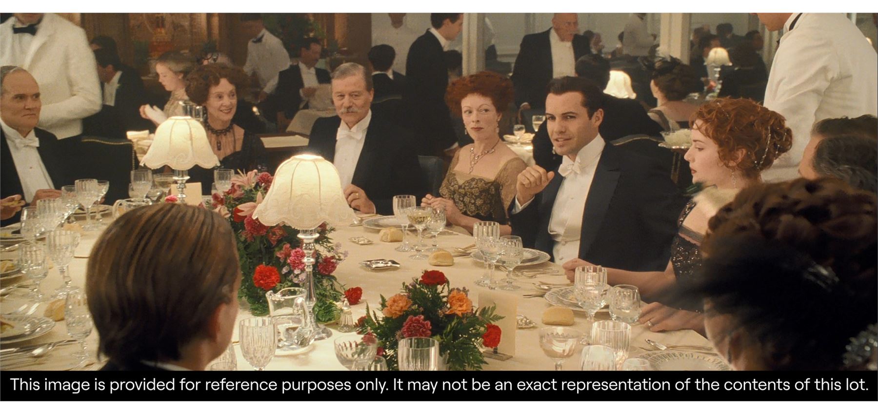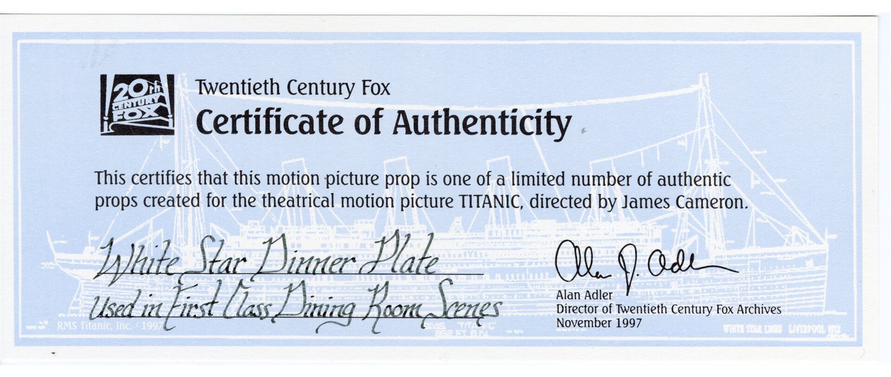 A White Star Line dinner plate from James Cameron's Titanic. Jack Dawson (Leonardo DiCaprio) dined with Rose Dewitt Bukater (Kate Winslet) in first class with other first class passengers.