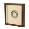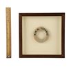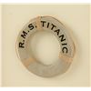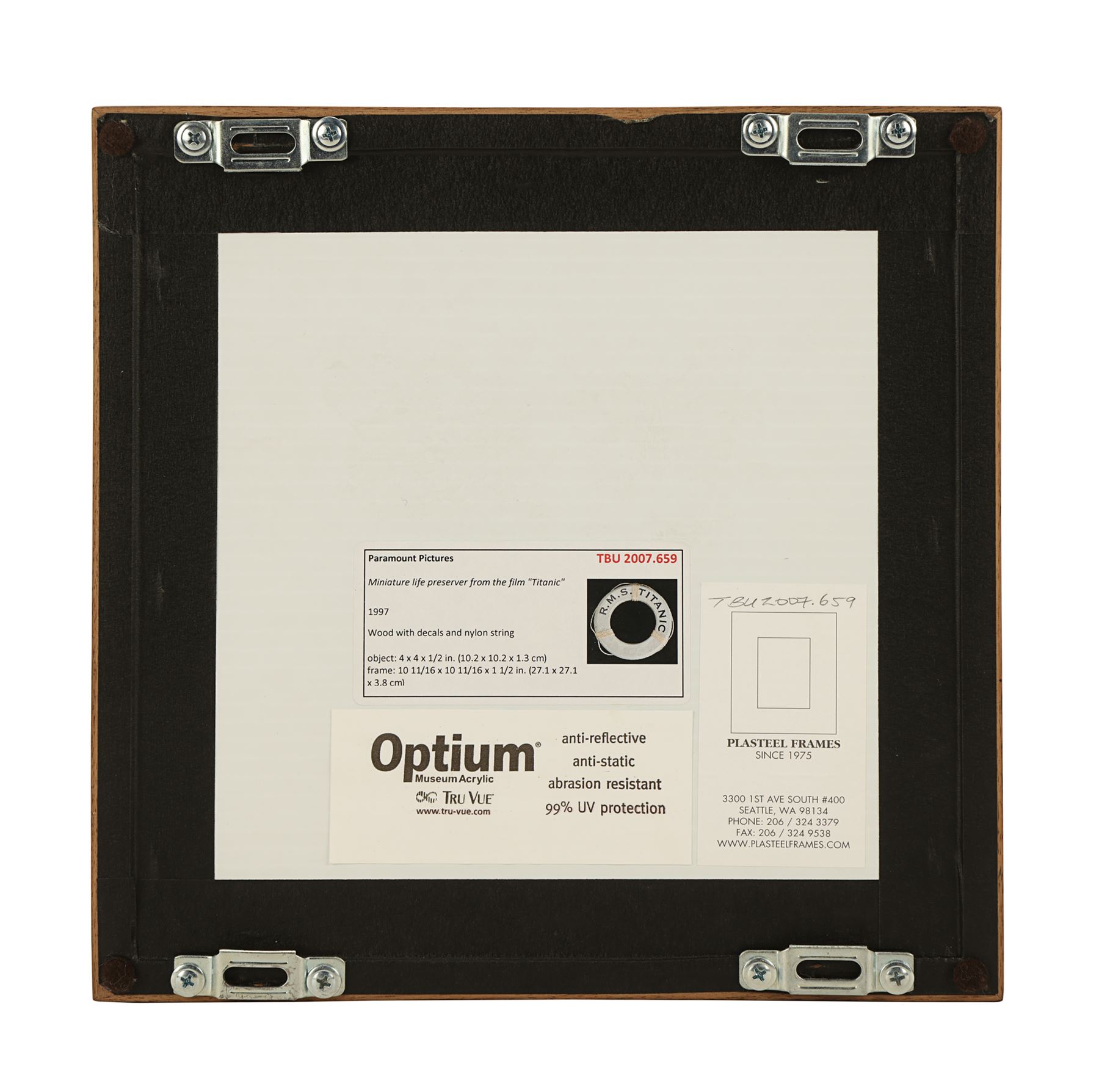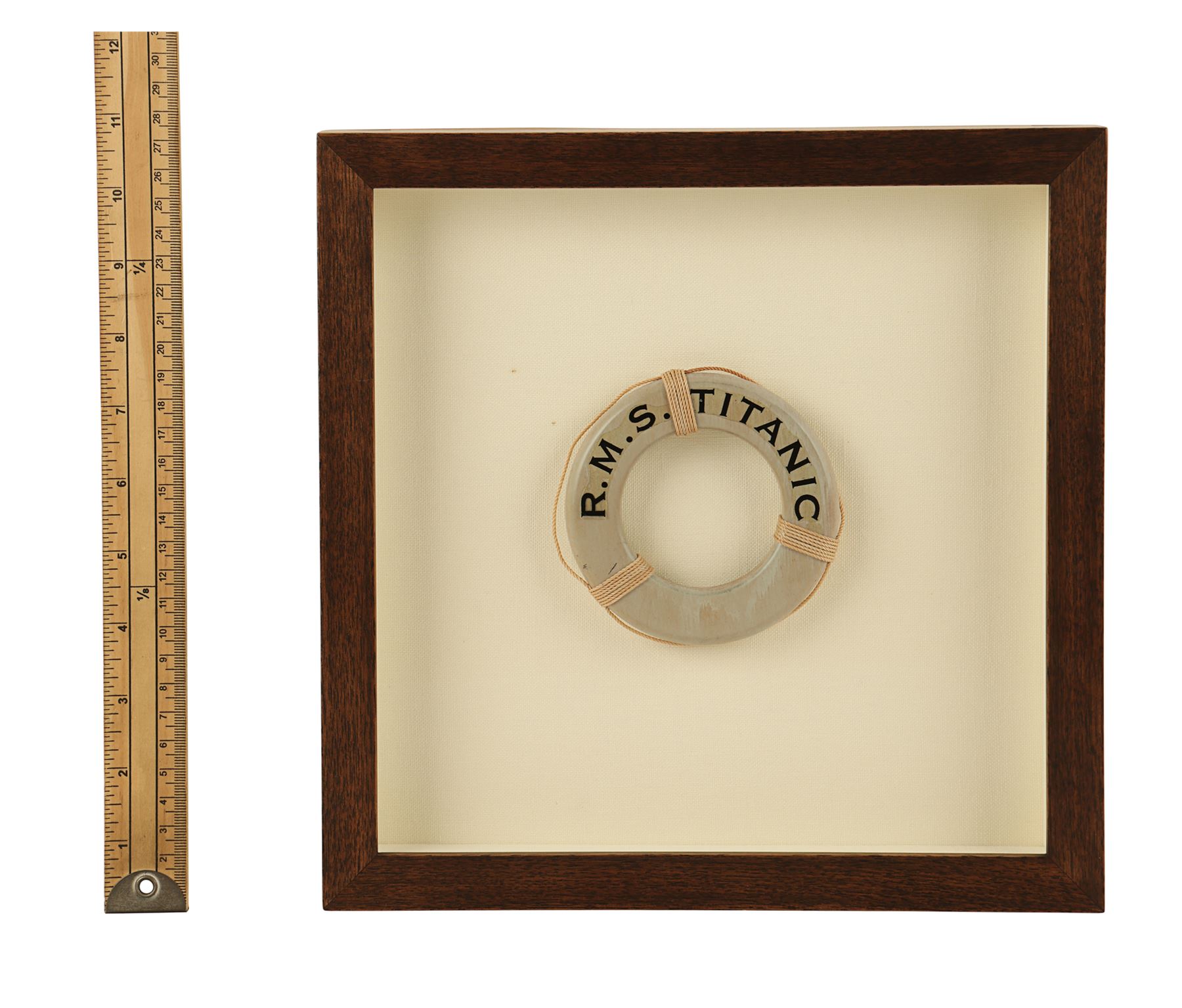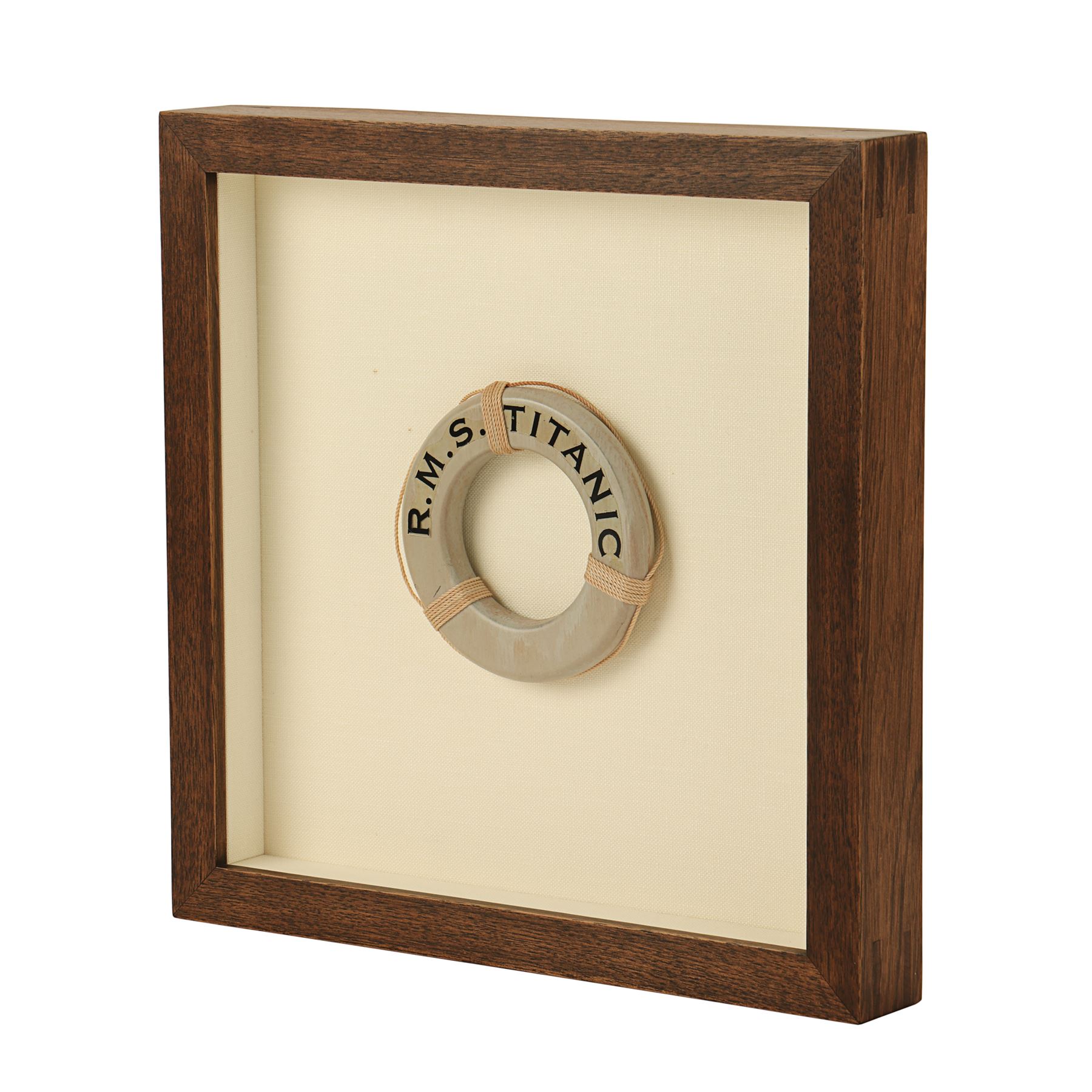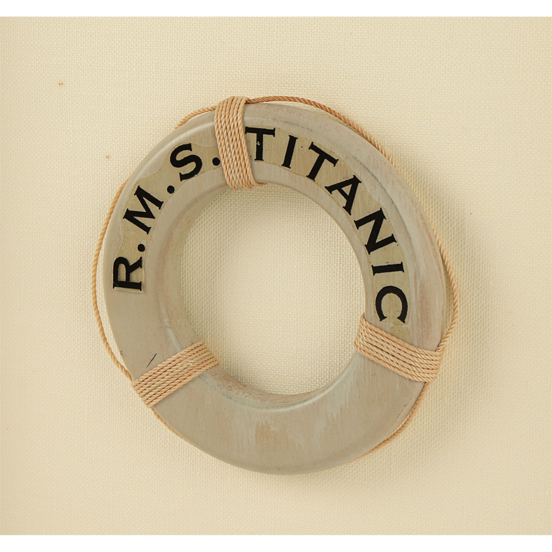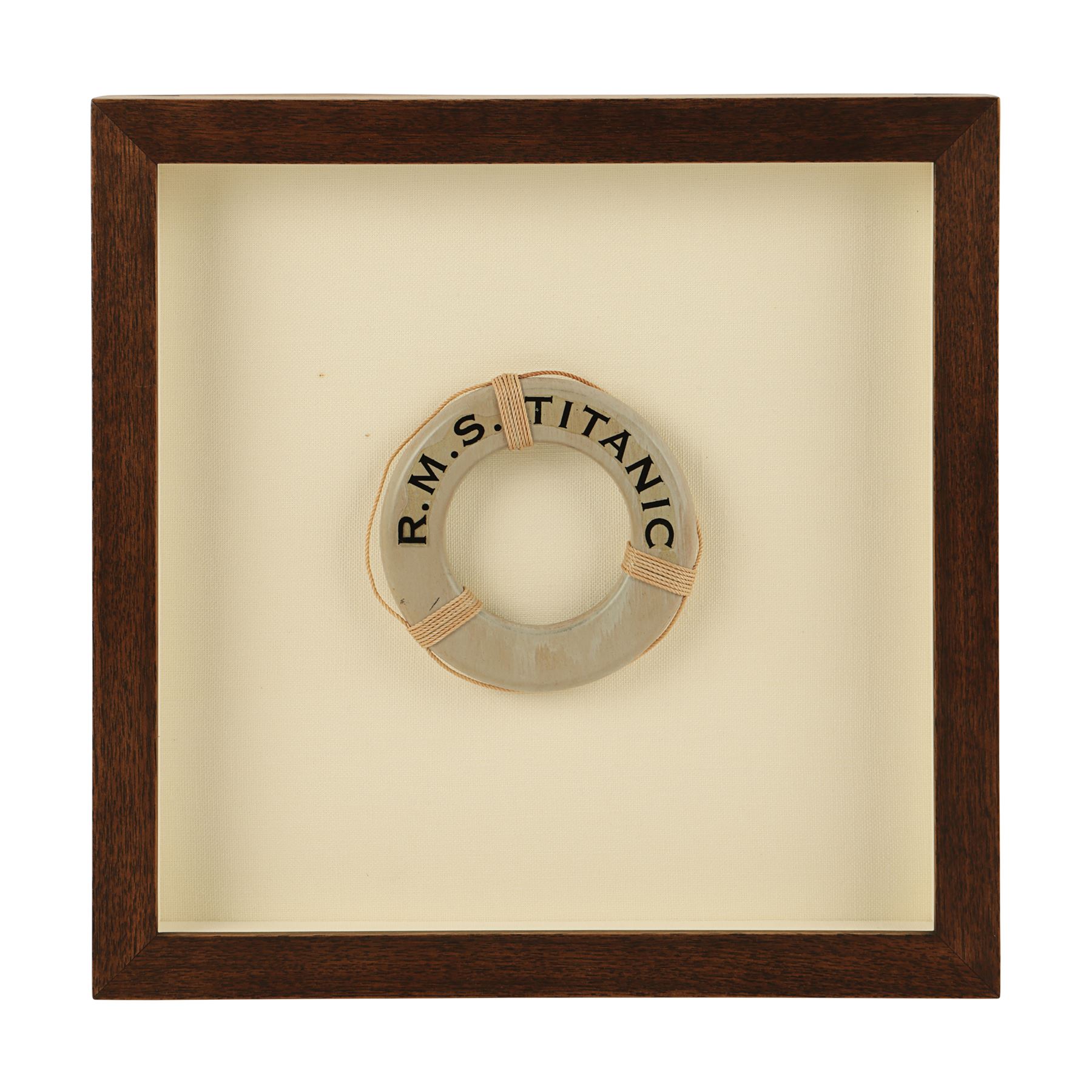 The life preserver is made from wood, painted grey, with strings of nylon wrapped around it. A decal reads "R.M.S. Titanic". The life preserver is mounted on white canvas and displayed in a wood-and-acrylic frame. The lot exhibits minor peeling of some of the decal's letters. Dimensions: (frame) 28 cm x 28 cm x 4 cm (11" x 11" x 1 1/2")