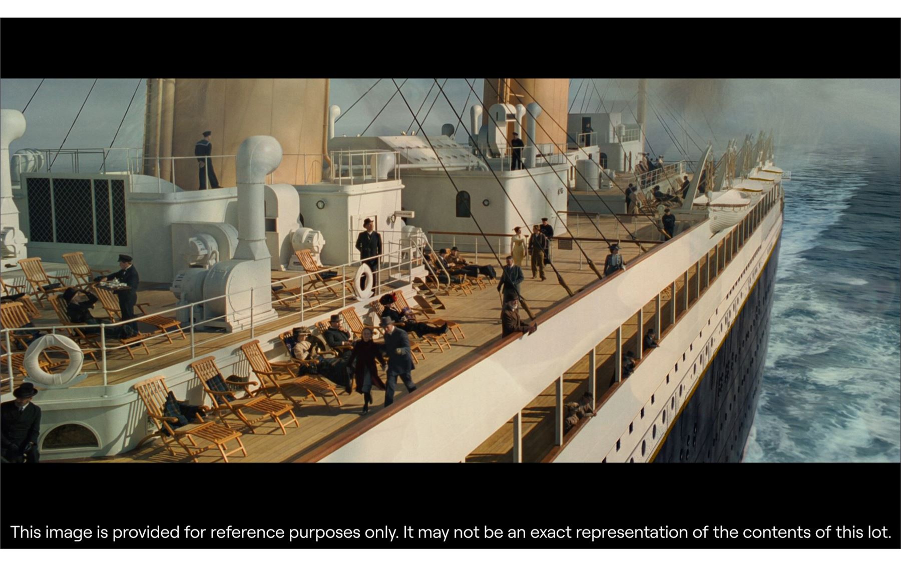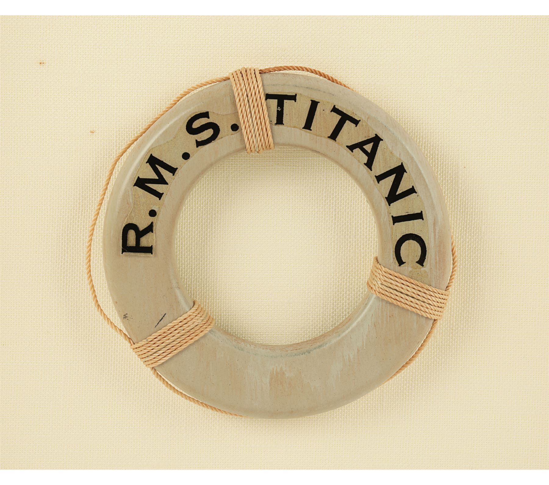 A miniature life preserver from James Cameron's romantic disaster film Titanic. Life preservers were seen on the top deck of the liner, and were carried by frantic passengers trying to survive its sinking towards the end of the film. Precisely detailed miniature Titanics were created to film various scenes that involved the flooding of the ship's decks, as well as the sequence where it eventually tipped and sank.