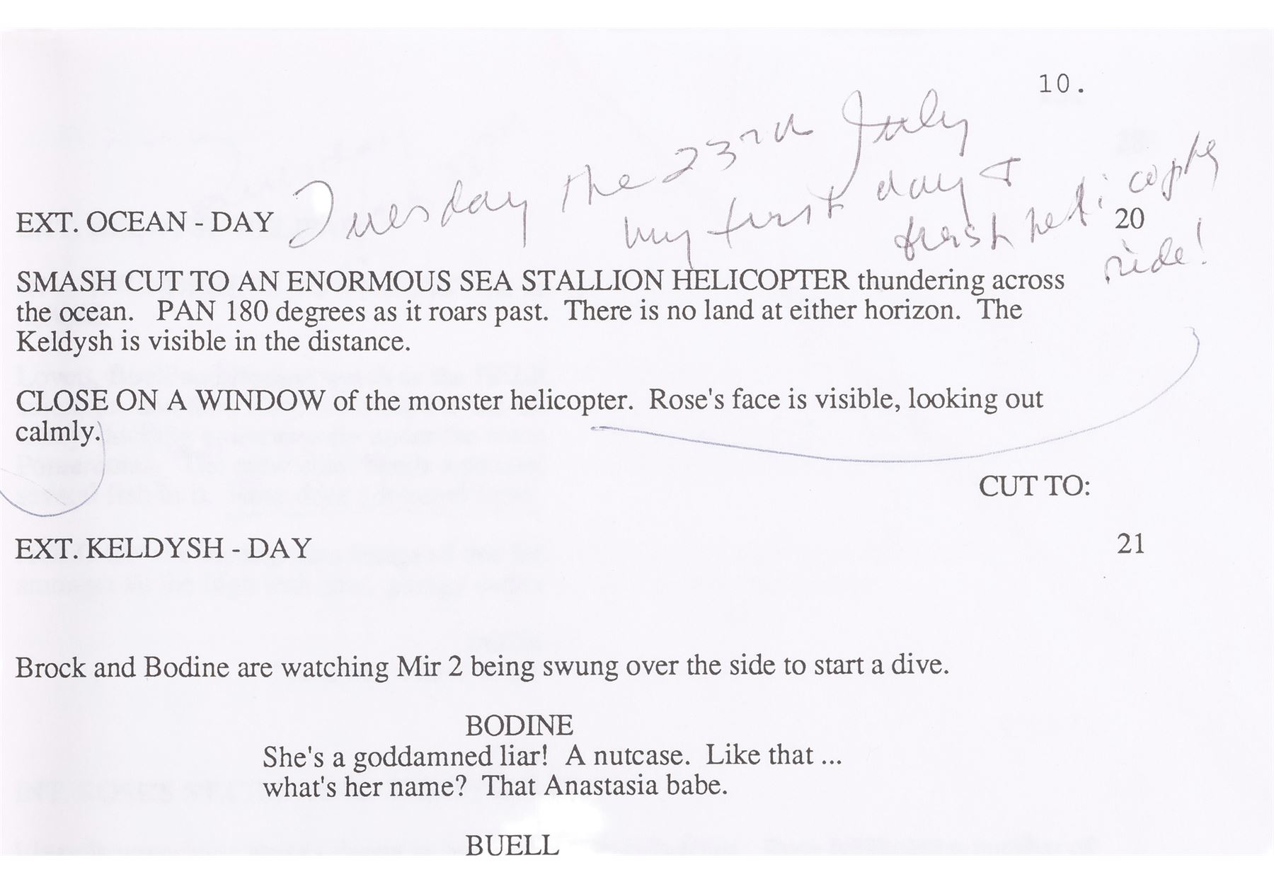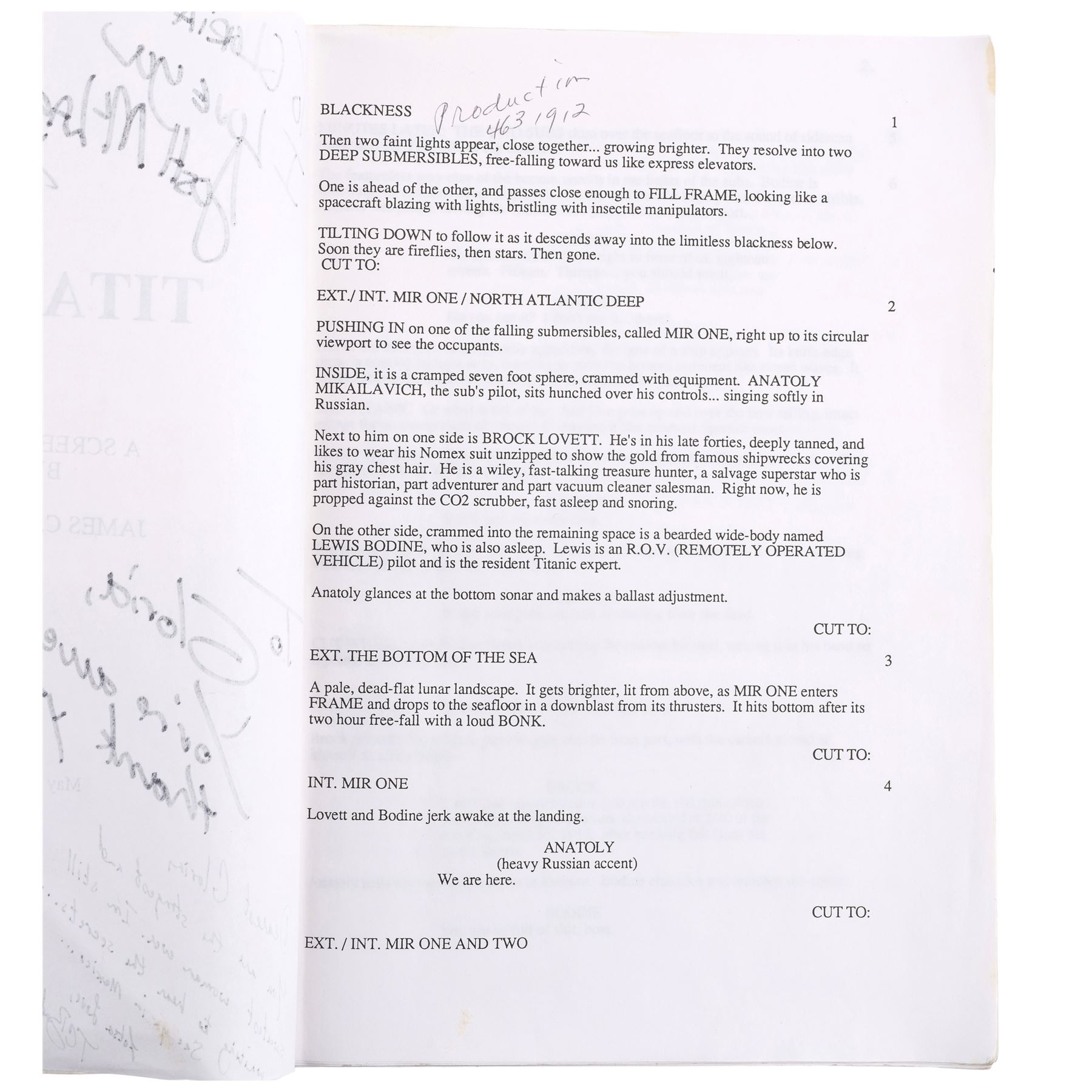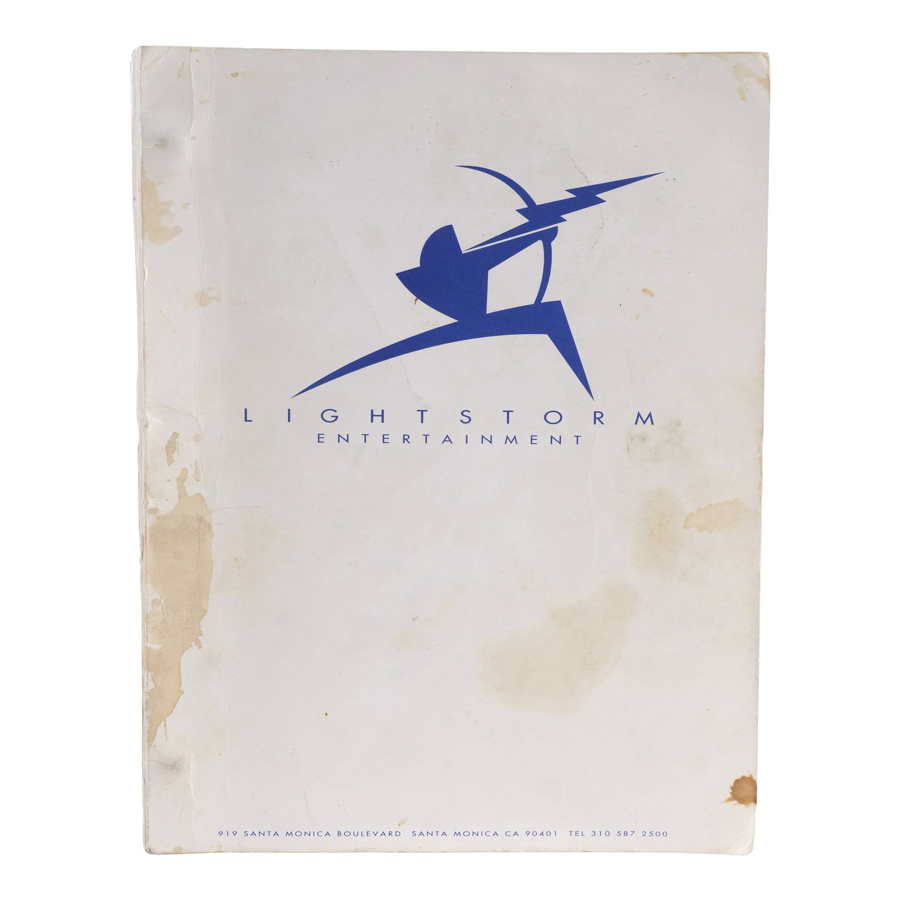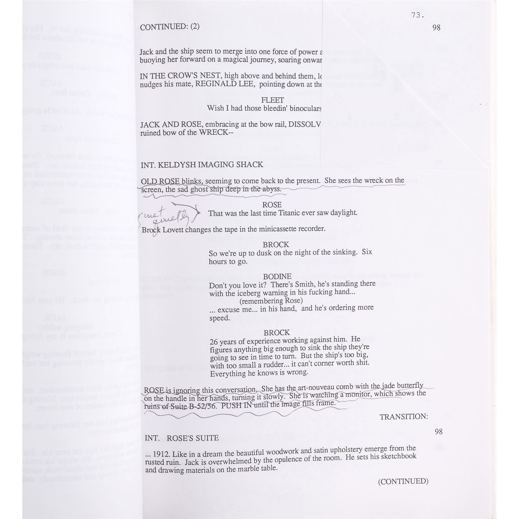 Gloria Stuart's personal, annotated script and call sheet from the production of James Cameron's Titanic. This brass brad-bound, 154-page screenplay is autographed in black ink and inscribed with notes to Stuart on the first page by Cameron, first assistant director Josh McLaglen, additional assistant director T.C. Badalato, set decorator Claude Roussel, and Bill Paxton, who played Brock Lovett. It features a white cardstock Lightstorm Entertainment cover dated May 7, 1996 as well as various annotations handwritten throughout by Stuart. Also included is a double-sided black-and-white call sheet labelled for shoot day 20 of the "Halifax Portion of Titanic" and dated "Aug 9 1996." The script cover exhibits staining and the call sheet exhibits crease lines from being folded. Dimensions: (largest) 23 cm x 28 cm x 2.75 cm (9" x 11" x 1")