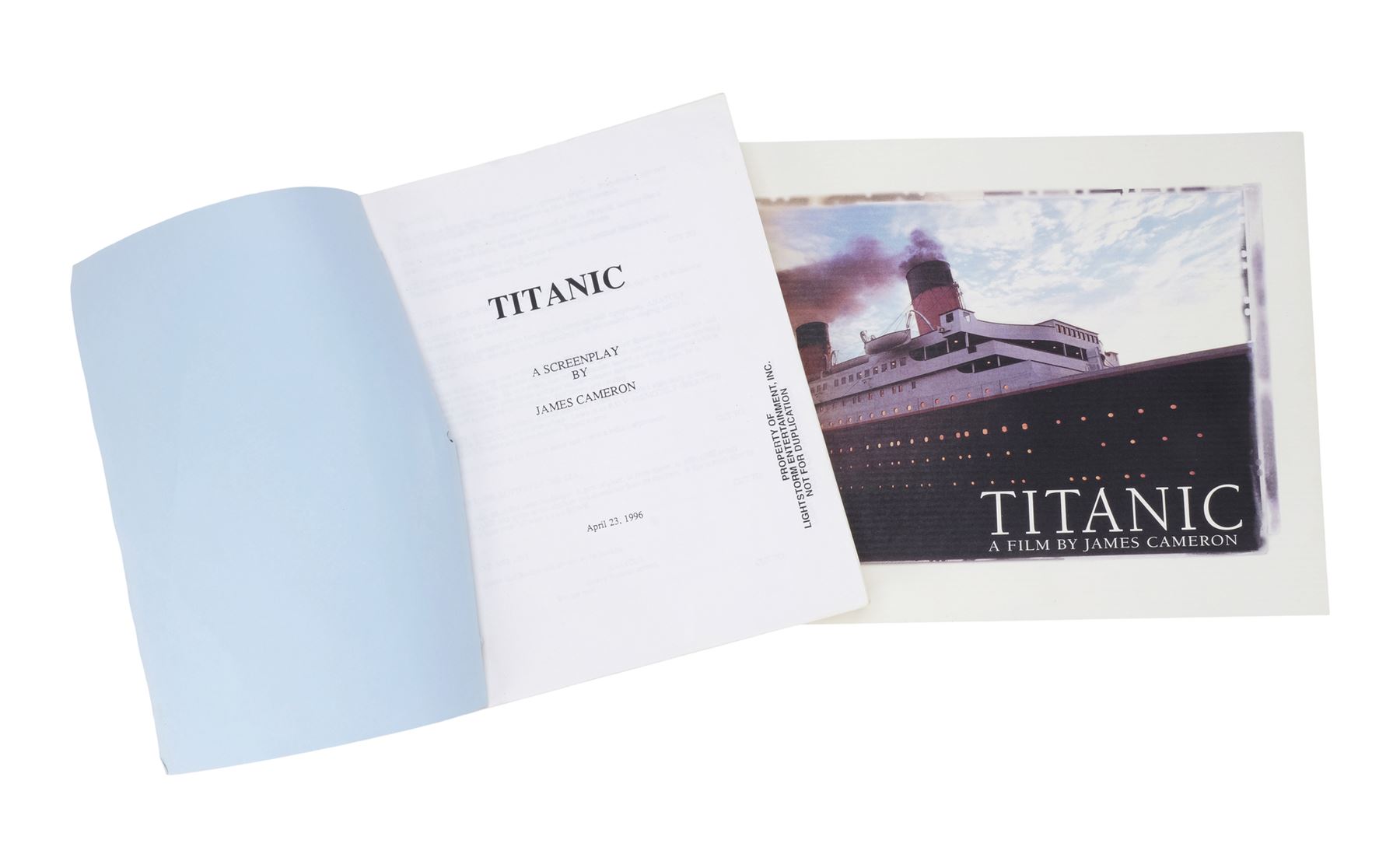 This lot consists of a 160-page white script dated April 23, 1996 with each page marked "Property of Lightstorm Entertainment Inc. Not for Duplication"; and a 12-page "Titanic" movie still booklet with a white "Titanic" envelope. This lot exhibits stains to the script and envelope and light water damage to the script. Dimensions: (largest) 38.25 cm x 29.25 cm x 4 cm (11" x 15" x 1.5")