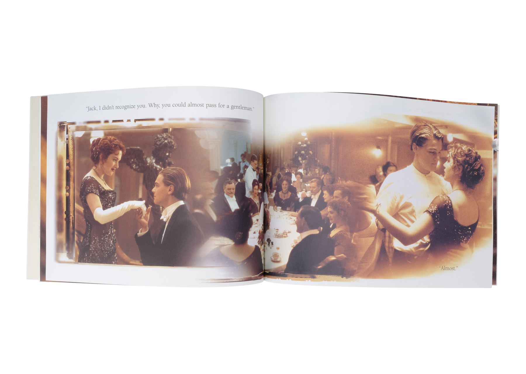 A production script and crew gift book from James Cameron's Titanic. A young aristocrat (Kate Winslet) fell in love with a young rogue (Leonardo DiCaprio) aboard the Titanic before it sank in 1912.