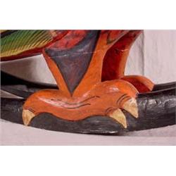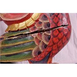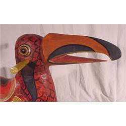Whimsically Carved and Paint Decorated Toucan Rocking Bird Toy; Modeled after a rocking horse this hand carved wooden rocking bird will make you laugh at the sight of it. In good finish, the body of the bird has cracked when the wood dried and shrank along the grain. Useable condition, 15-30 years old, 7.5"w x 35.5"l (bird) x 36.75"l (rocker) x 24.25"t. Est. $200 - $300.