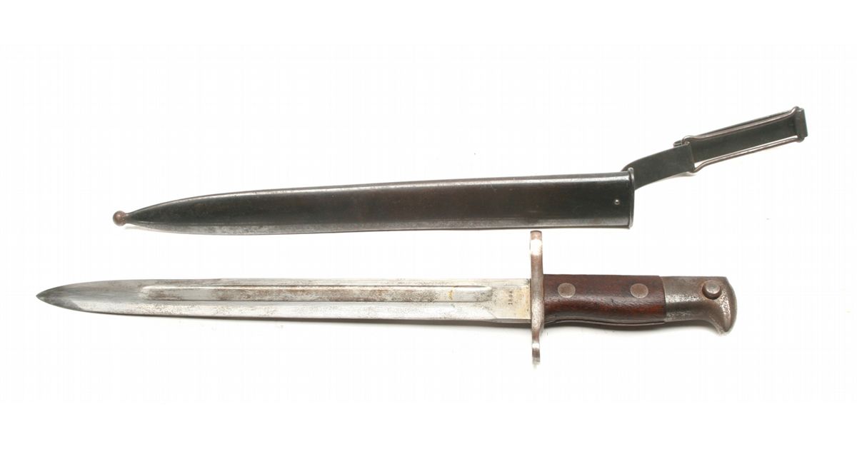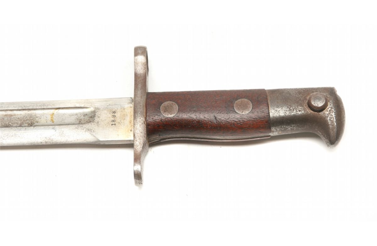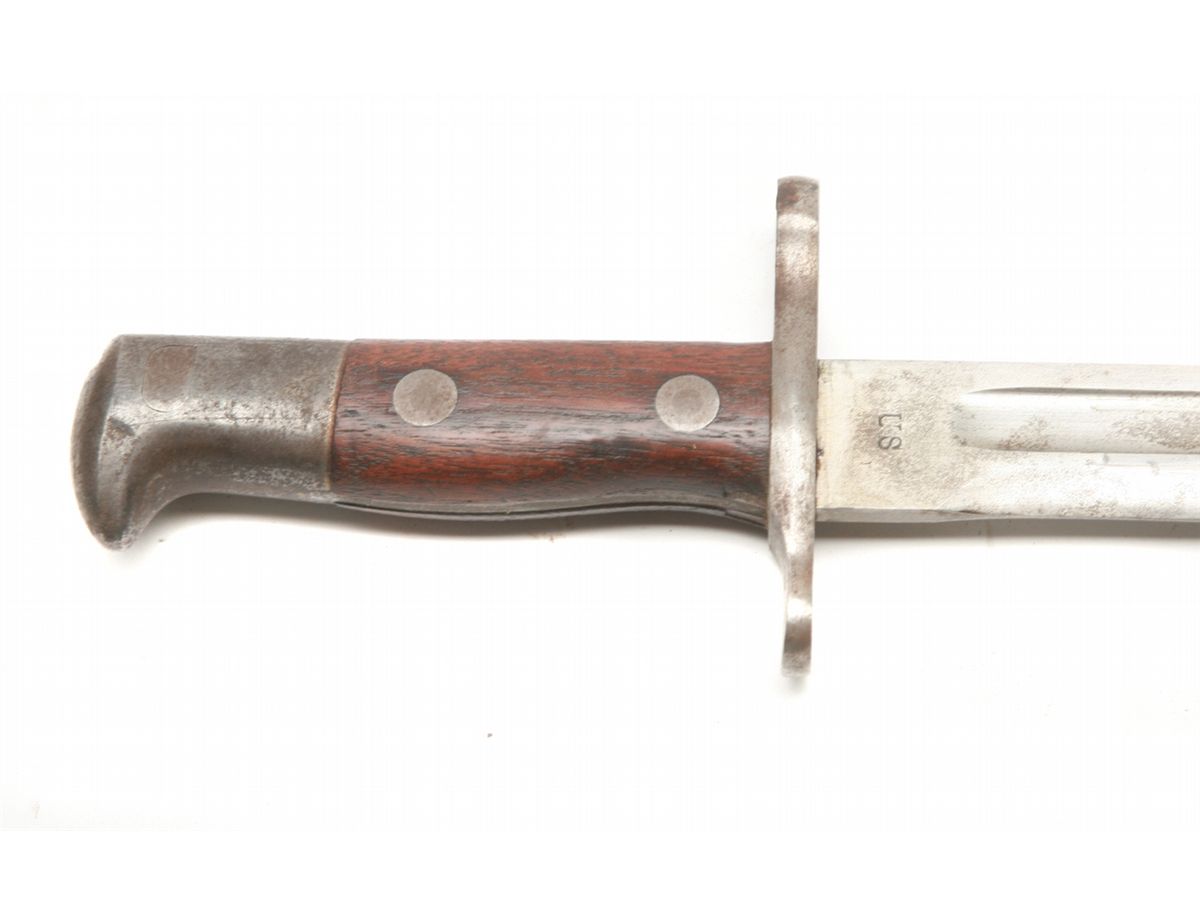 Model 1892 bayonet for Krag Jorgensen rifles - left ricasso dated 1898 - right ricasso marked US - freckling throughout - wood grips in solid condition - undented metal sheath with freckling - non-ffl - 25CRRMA039
