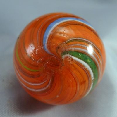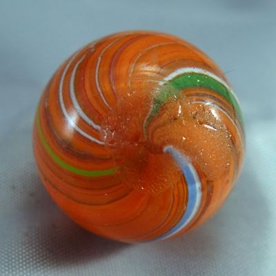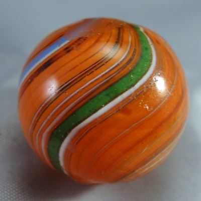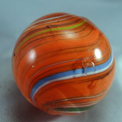 Clear base. Subsurface layer is stretched flecks of glass. Predominately orange, with white, yellow, blue, red and aventurine green. One tiny pit. Beauty. Germany, circa 1860-1920. 25/32". Mint(-) (9.1).