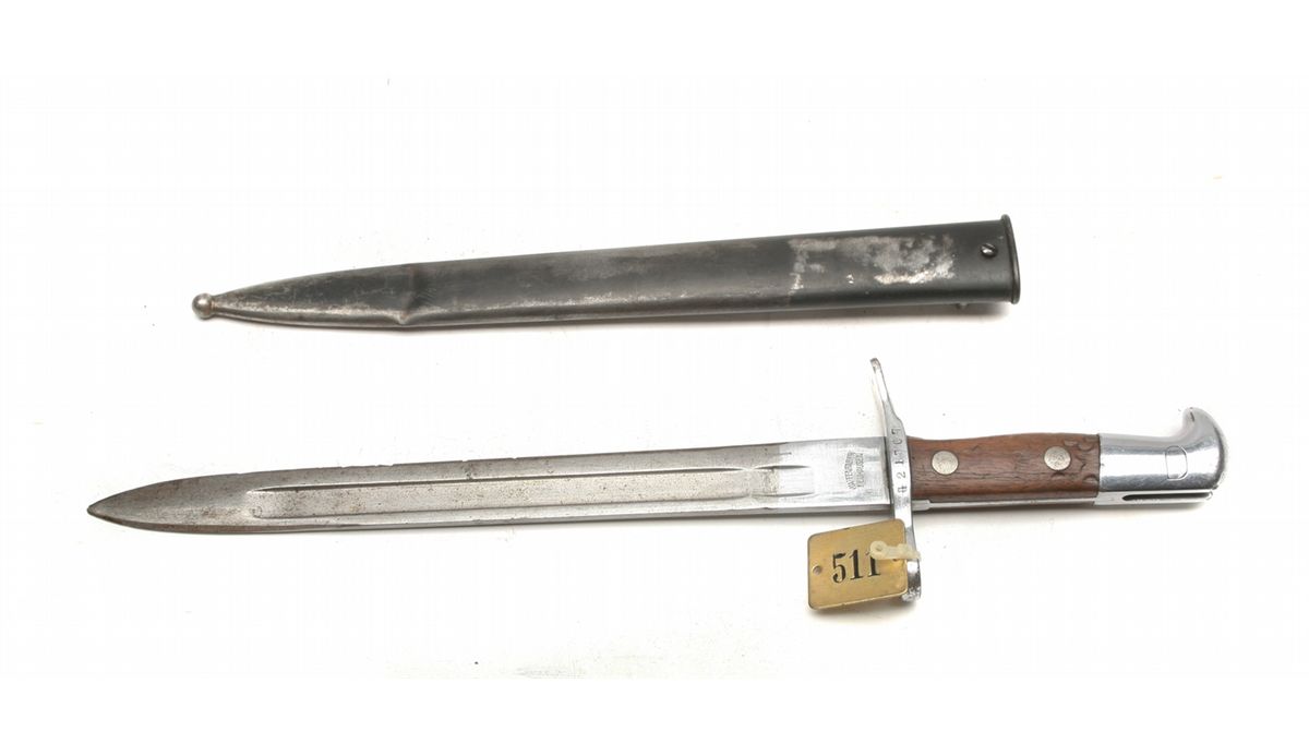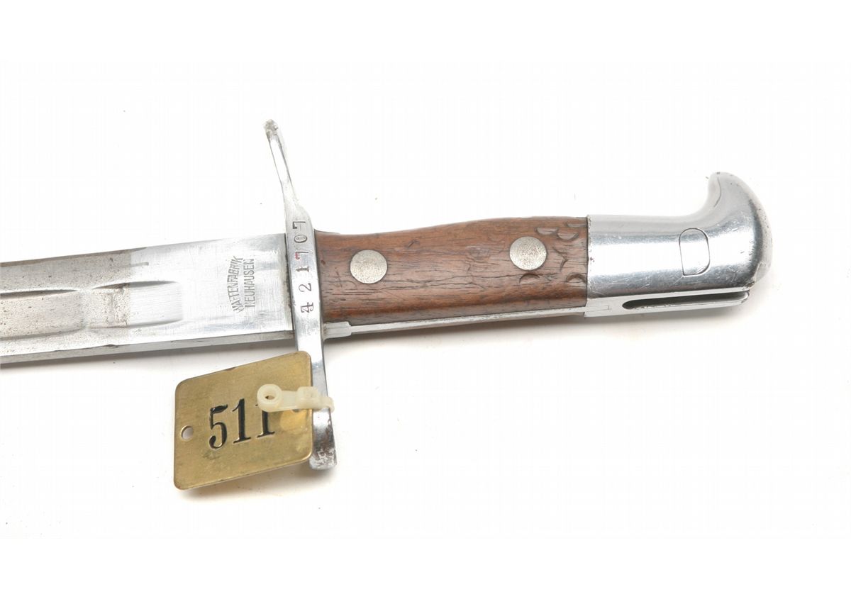 Model 1911 bayonet for Schmidt Rubin series of rifles - right ricasso marked Waffenfabrik Neuhausen - SN on right guard - blade with some freckling - some wear to pommel - wood handles in solid condition - cleaning rod hammer marks - metal sheath - one dent and wear - brass numbered tag - slightly bent crossguard - non-ffl - 25CRRMA040