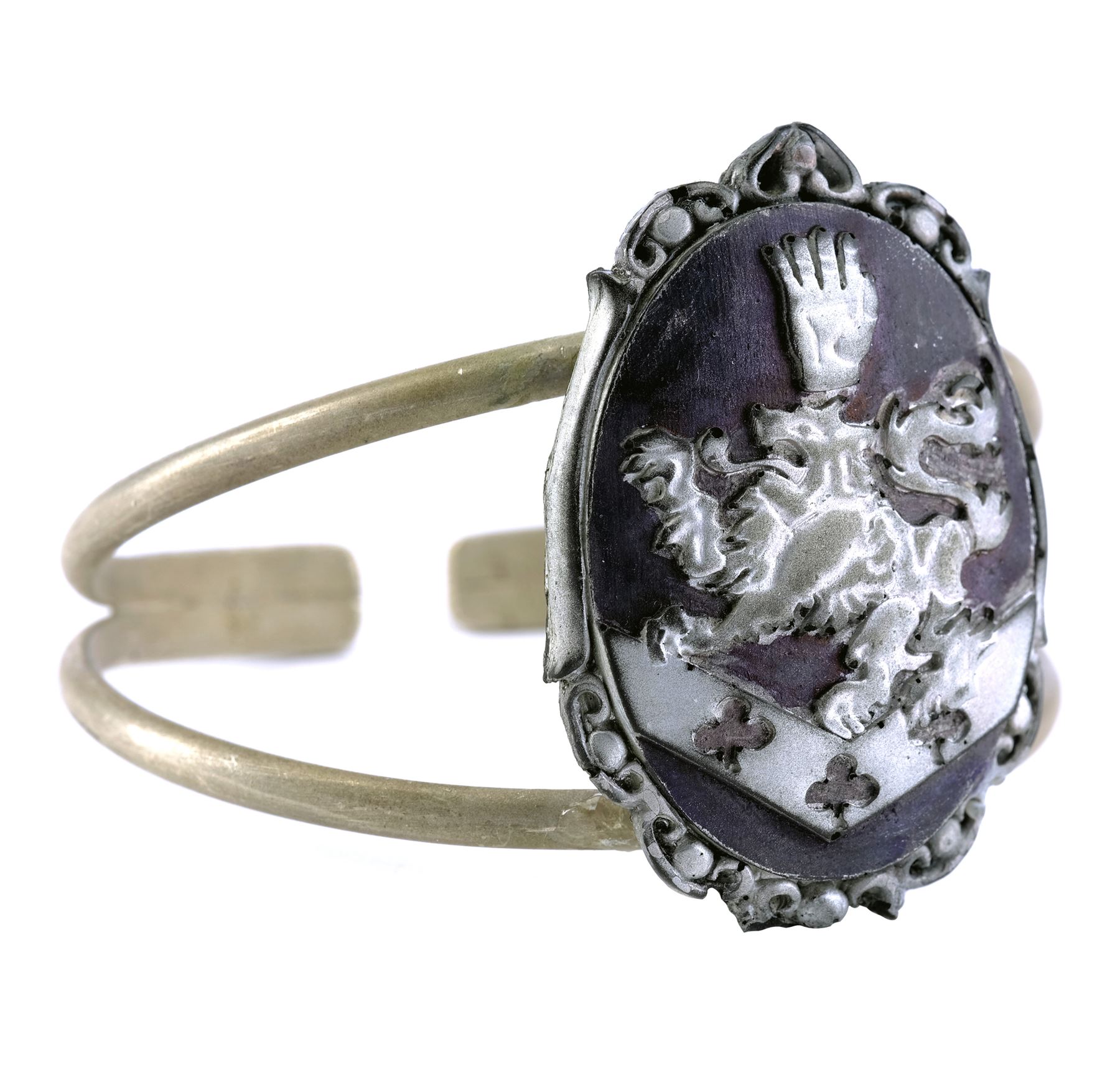 This stunt bracelet comes directly from Lionsgate. It features a burnished metal band engraved on the interior to resemble sterling silver with a urethane Cullen family crest glued to the front. The urethane exhibits cracking on the reverse, and the band is discoloured from production use and age.