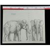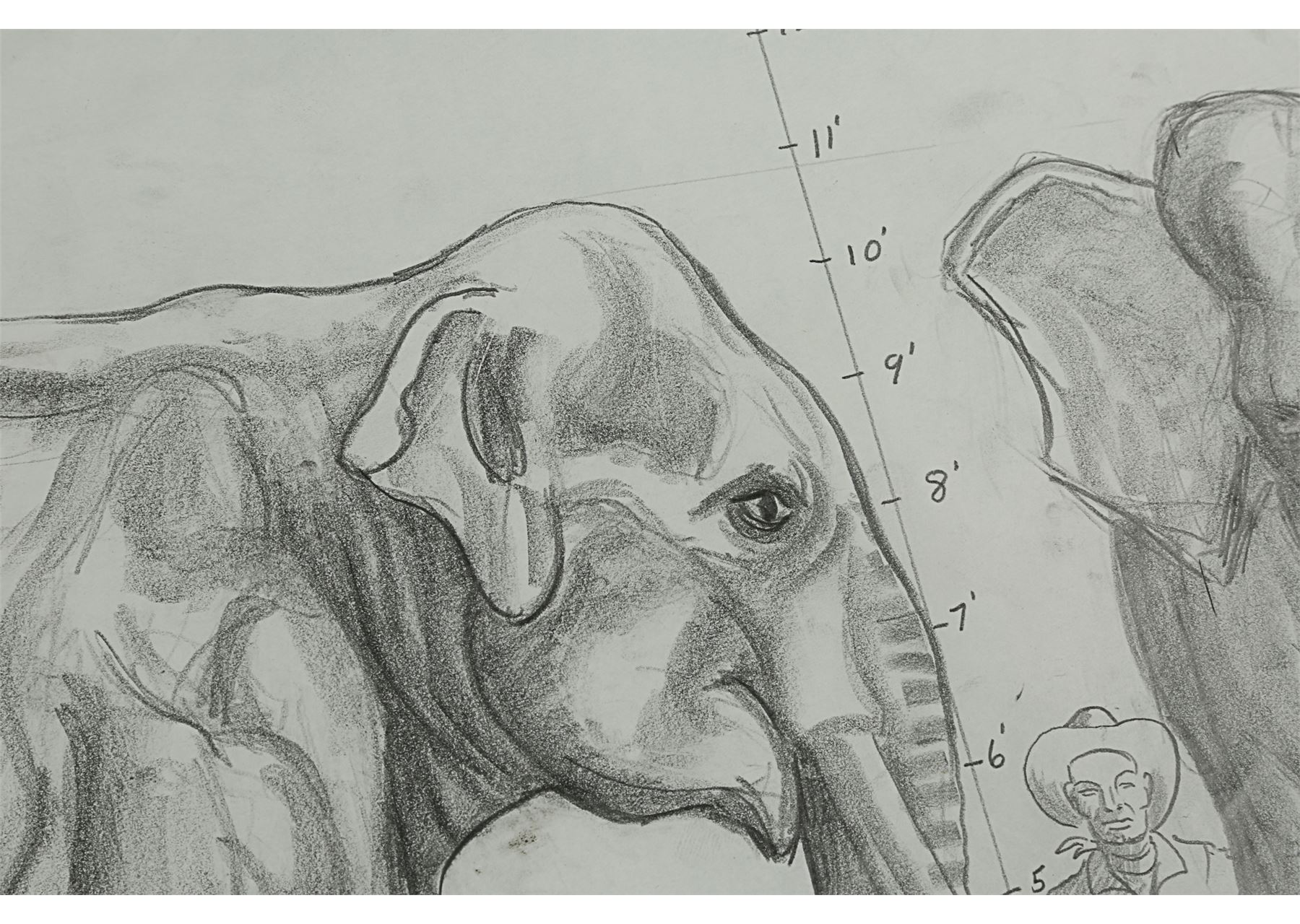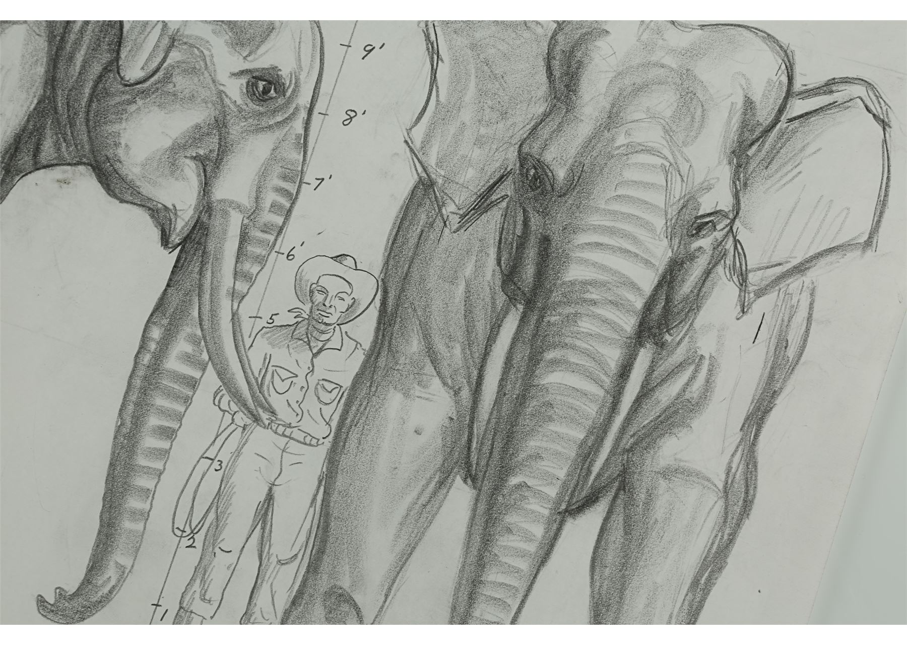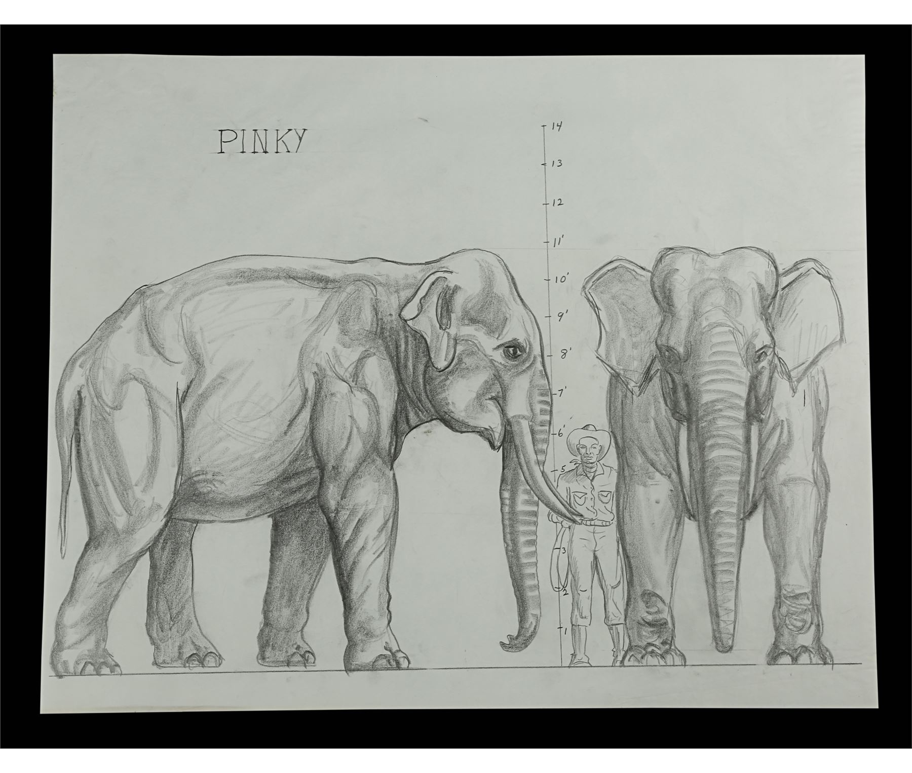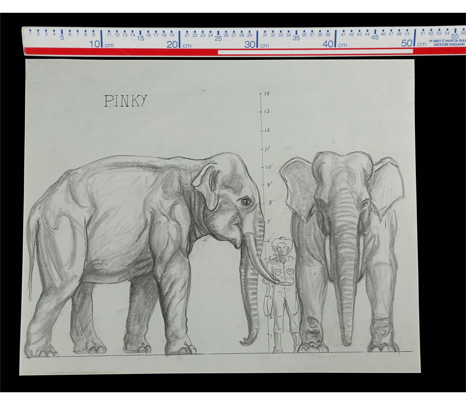 A hand-drawn "Pinky the Elephant" scale comparison by Ray Harryhausen from the production of Jim O'Connolly's Western adventure The Valley of Gwangi. The image shows an elephant face-on and in profile, along with a cowboy figure for scale.