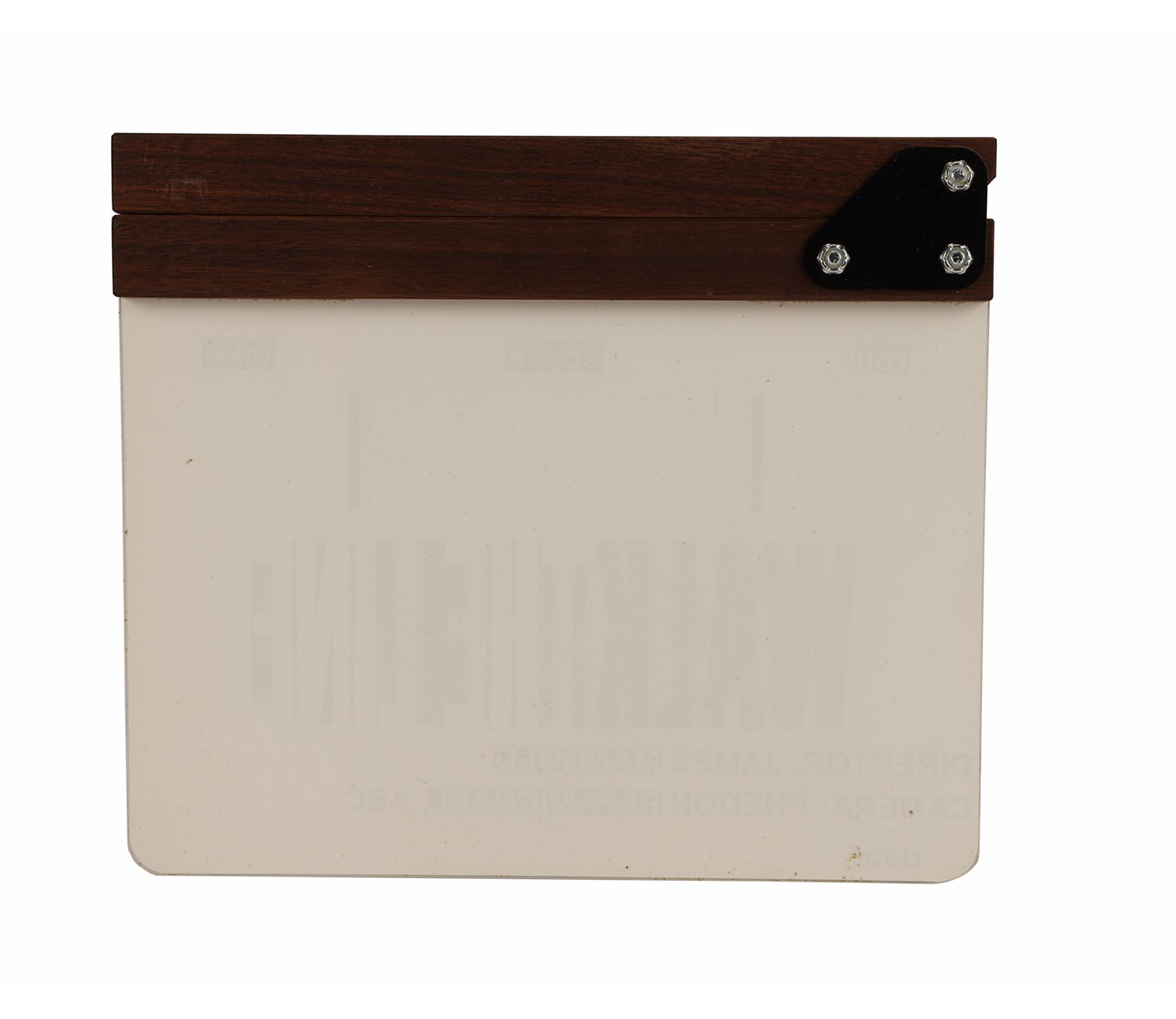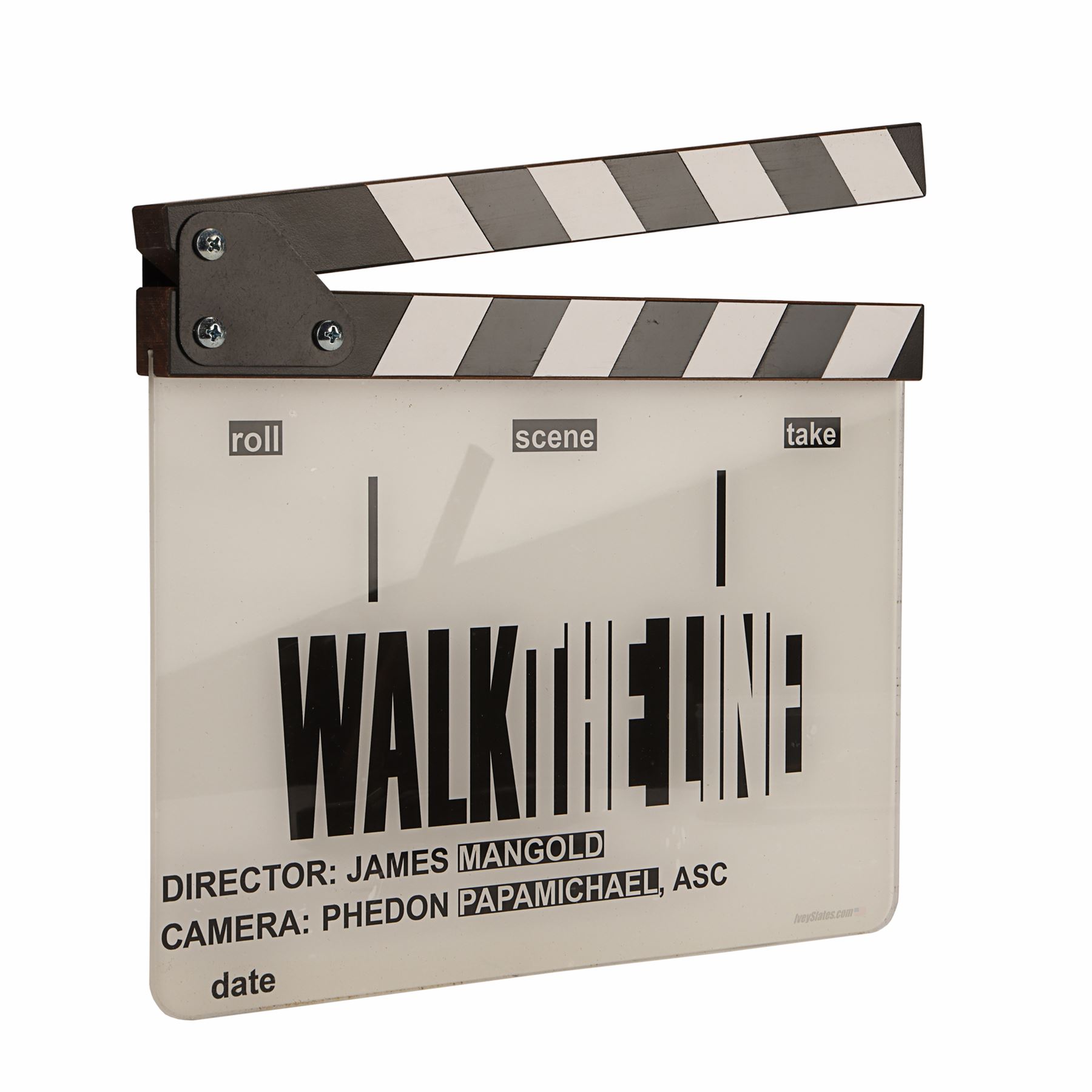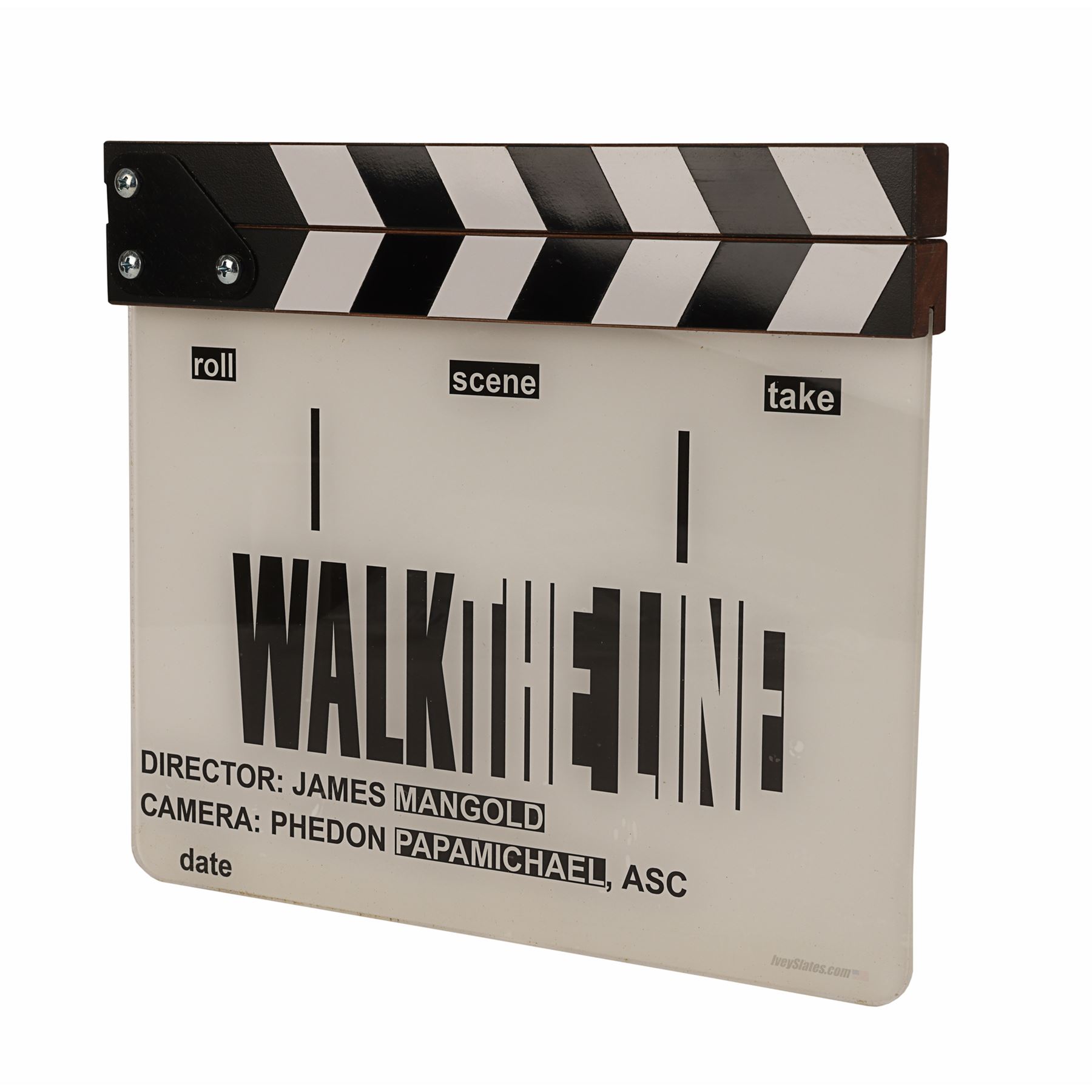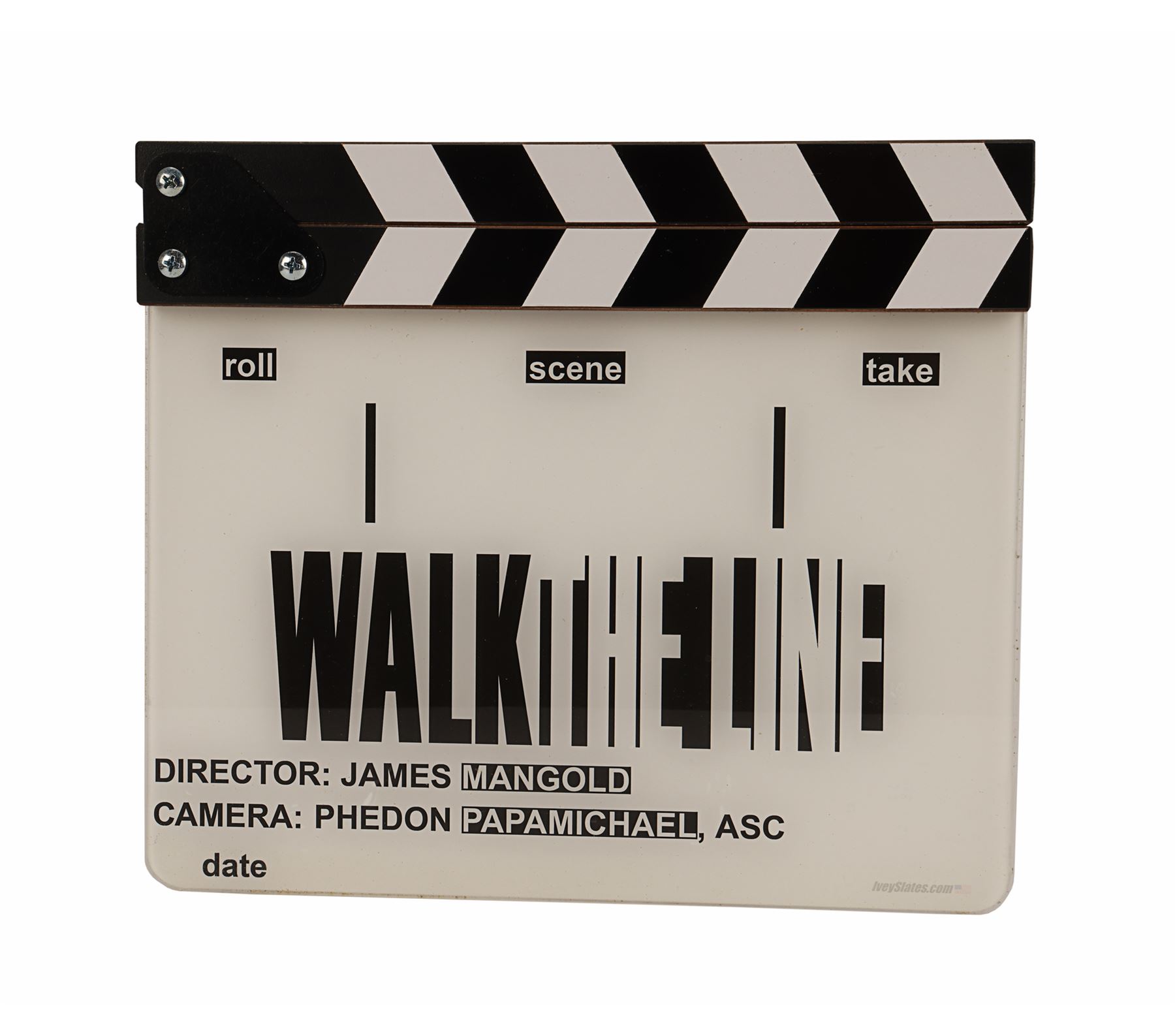 A clapperboard from the production of James Mangold's biographical drama Walk The Line. The clapperboard features an acrylic slate, a wooden clapper and a plastic hinge. The slate features the film title and the names of director Mangold and cinematographer Phedon Papamichael. Outlined boxes further divide the clapperboard into sections comprising roll, scene and take.