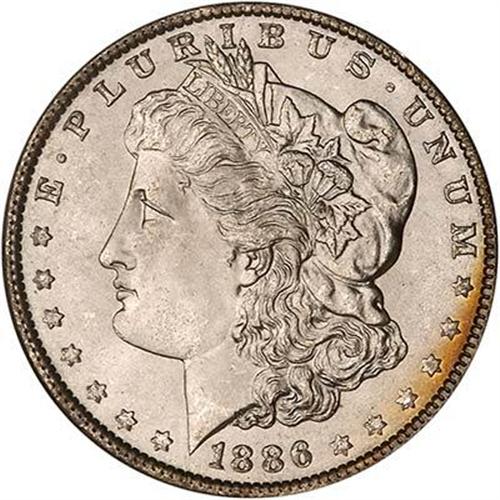 1886 Morgan Dollar. A highly lustrous superb gem with a nuance of pale champagne toning on both sides at the rim, all of which is underpinned by full rollicking satin freshness. Struck from typically-sharp dies that imported a full hard texture to the design, especially at the important central devices. (#7166)
