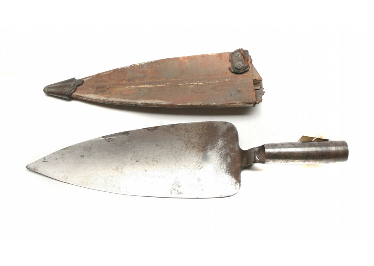 Model 1873 trowel bayonet for US Springfield Trapdoor rifle/carbine - areas of discoloration/light rust/light pitting on blade - rusted/damaged sheath (leather casing missing) in relic condition - numbered brass tag - non-ffl - 25CRRMA042