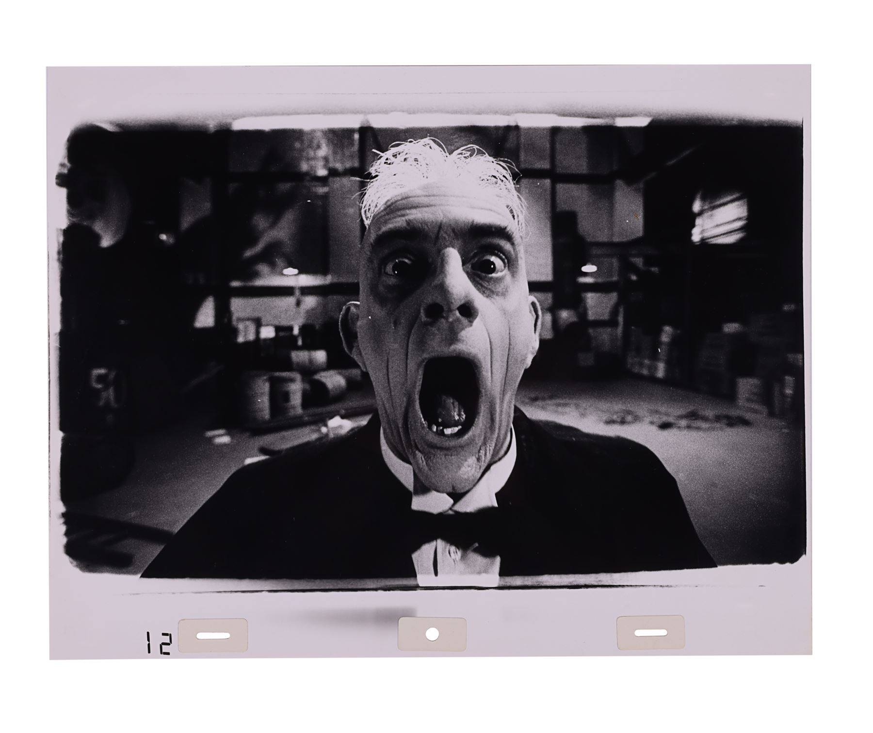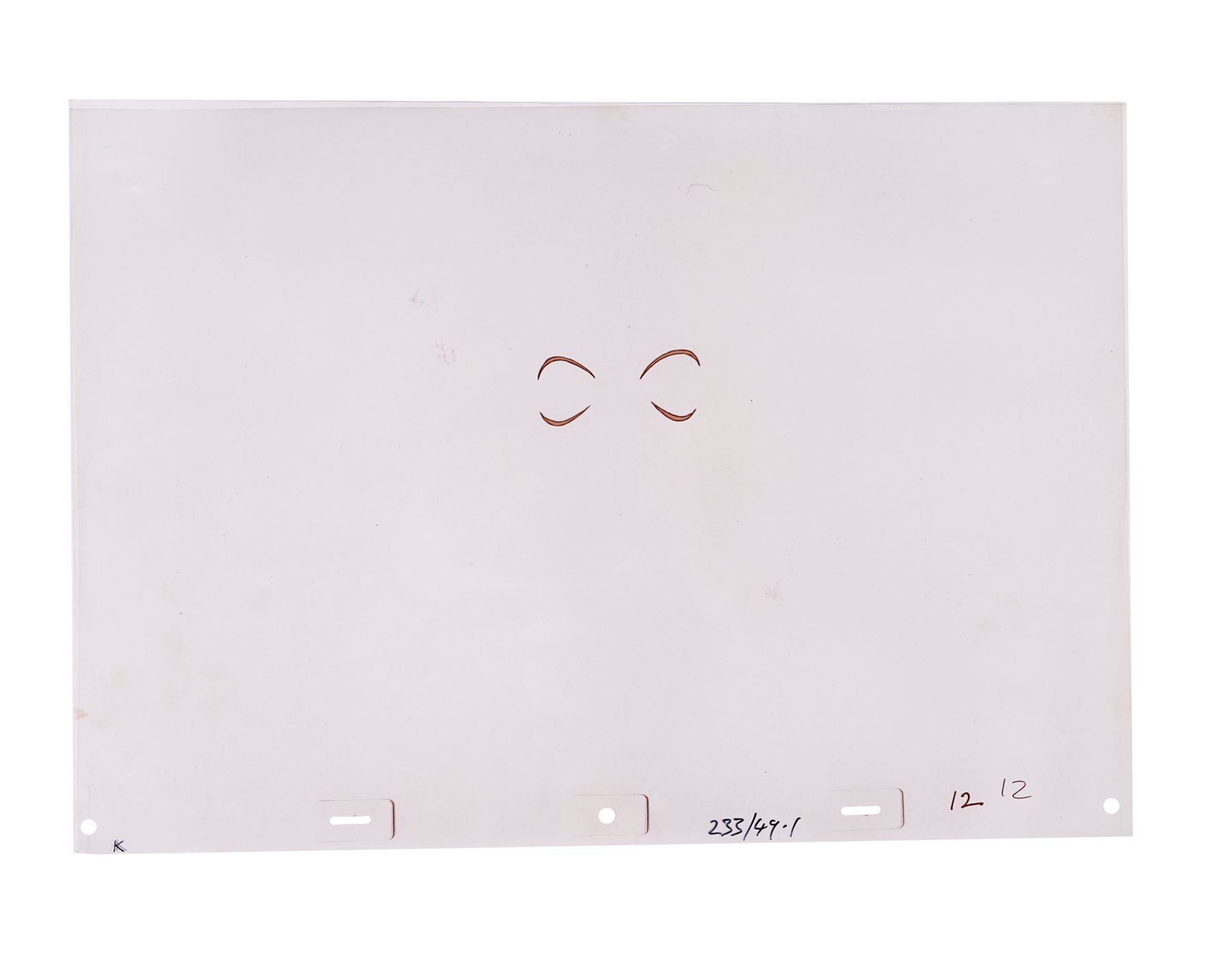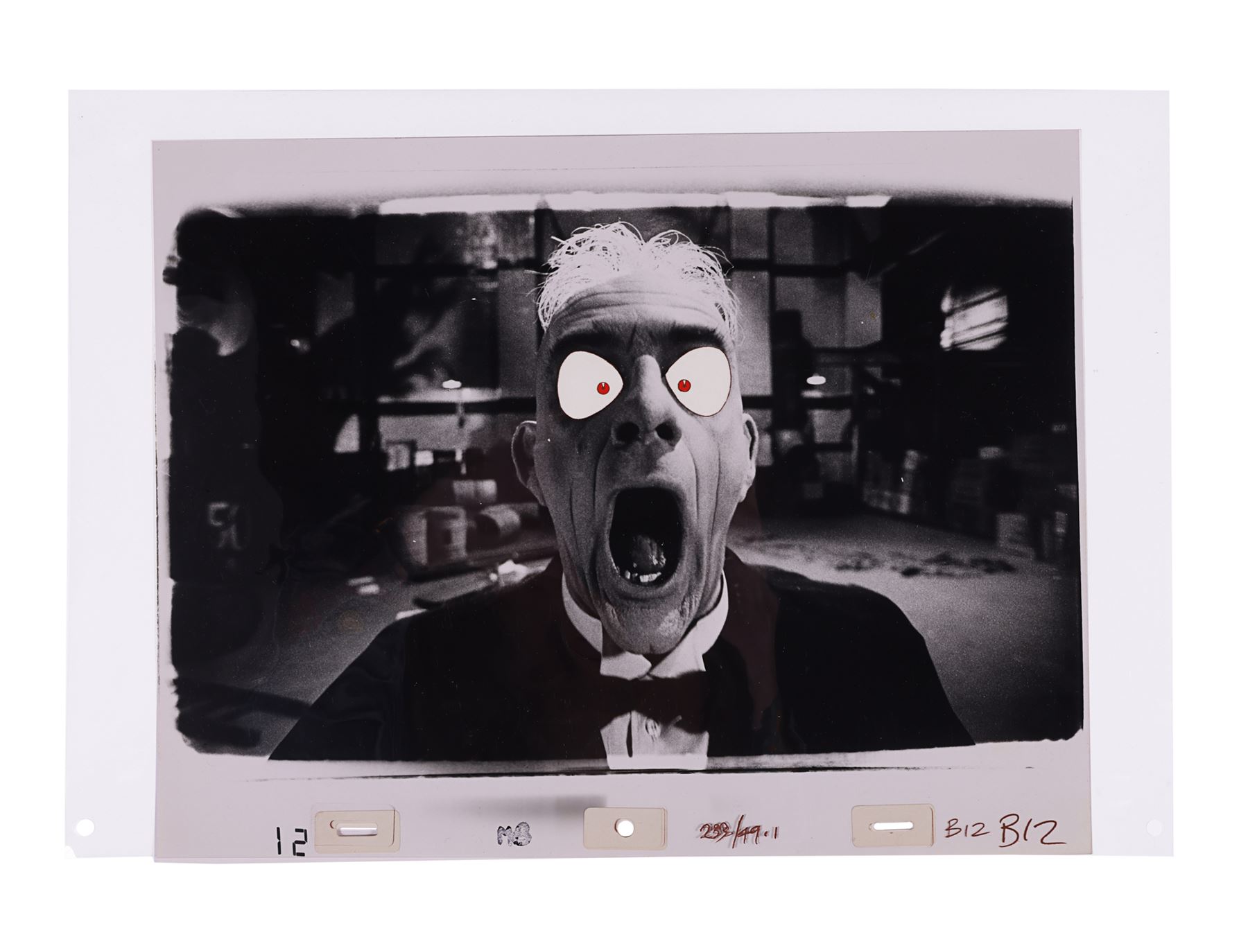 This cel set-up comprises two acetate sheets, one of which depicts hand-painted bulging red 'Toon' eyes, and is layered over the other, which features a black-and-white photographic image of Lloyd as Doom. Each acetate sheet is hand-labelled "233/49.1" and features the different elements that form Doom's Toon eyes, such as the red irises and waterlines. Dimensions: 29.7 cm x 42 cm (11 3/4" x 16 1/2")