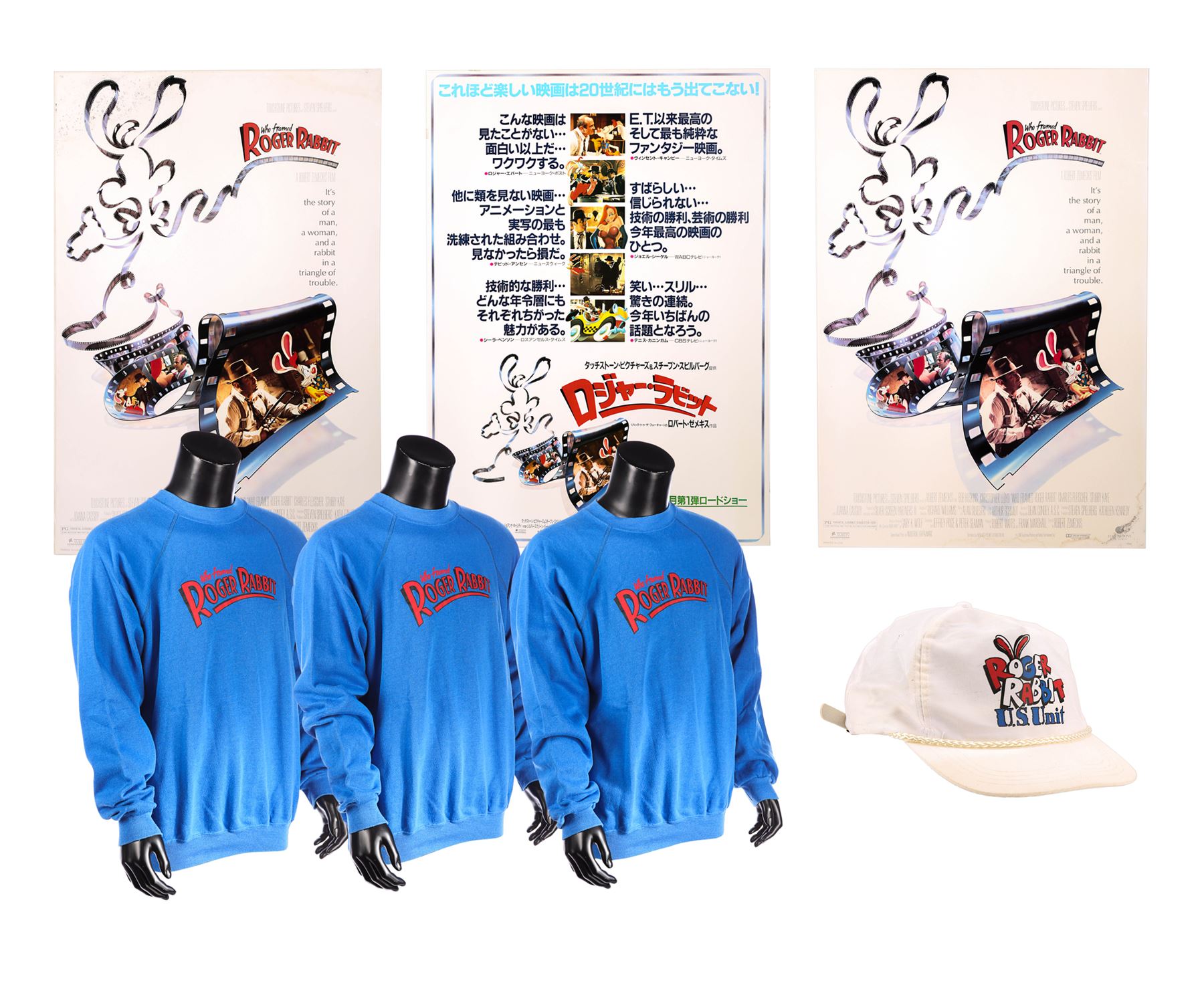 This lot includes three hardback-mounted posters, two US and one Japanese, each depicting a film reel in the shape of Roger Rabbit and scenes from the film. Also included is a white cap featuring "Roger Rabbit U.S. Unit" on the front and three blue crew sweatshirts (one size L, the other two XL) with the text "stay tooned" printed on the back. The posters exhibit areas of water damage, while the crew items show discolouration. Dimensions (largest poster): 106 cm x 73 cm (45 1/2" x 28 3/4")