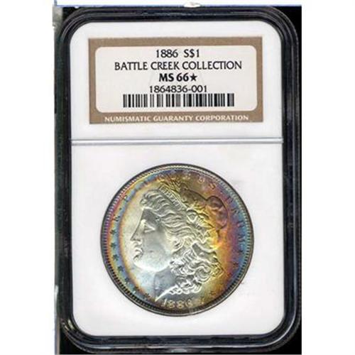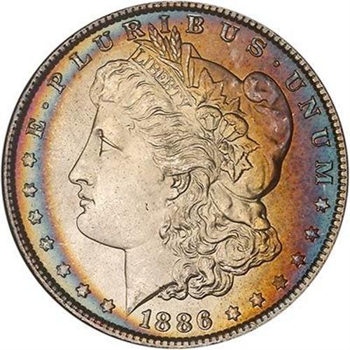 1886 Morgan Dollar. Encircling the obverse, the most pleasant colors like amber-gold, reddish purple, deep steel blue and even an area of pale sky blue iridescence. (#7166)<p><i>from The Battle Creek Collection, Part III</i>