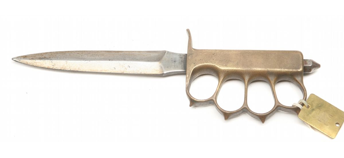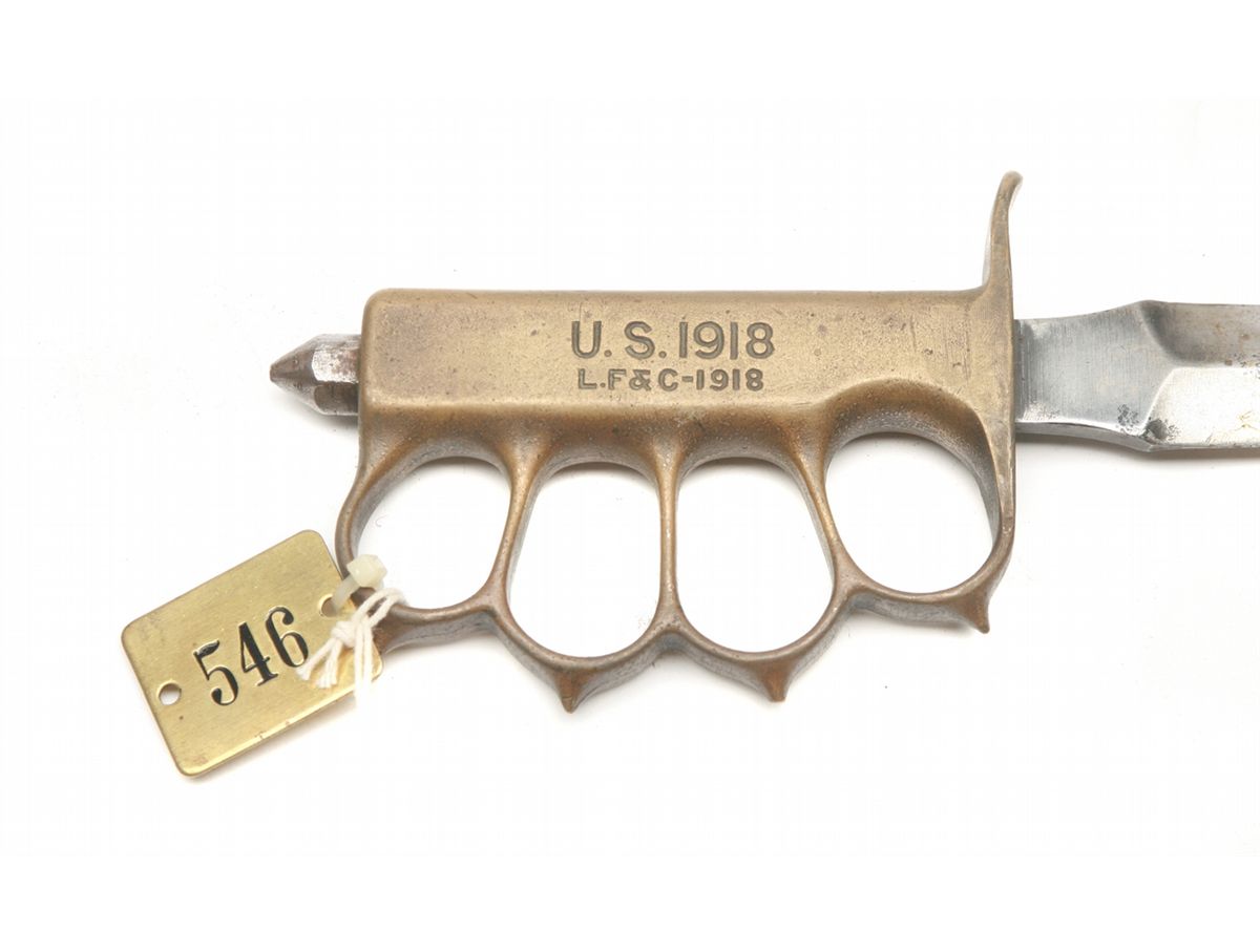 US Mark I trench knife - brass handle marked U.S.1918 L.F&C-1918 - 6.75" blade - some freckling/discoloration - seller assumes responsibility for ensuring this is legal in their jurisdiction due to the metal knuckles - numbered brass tag - non-ffl - 25CRRMA045